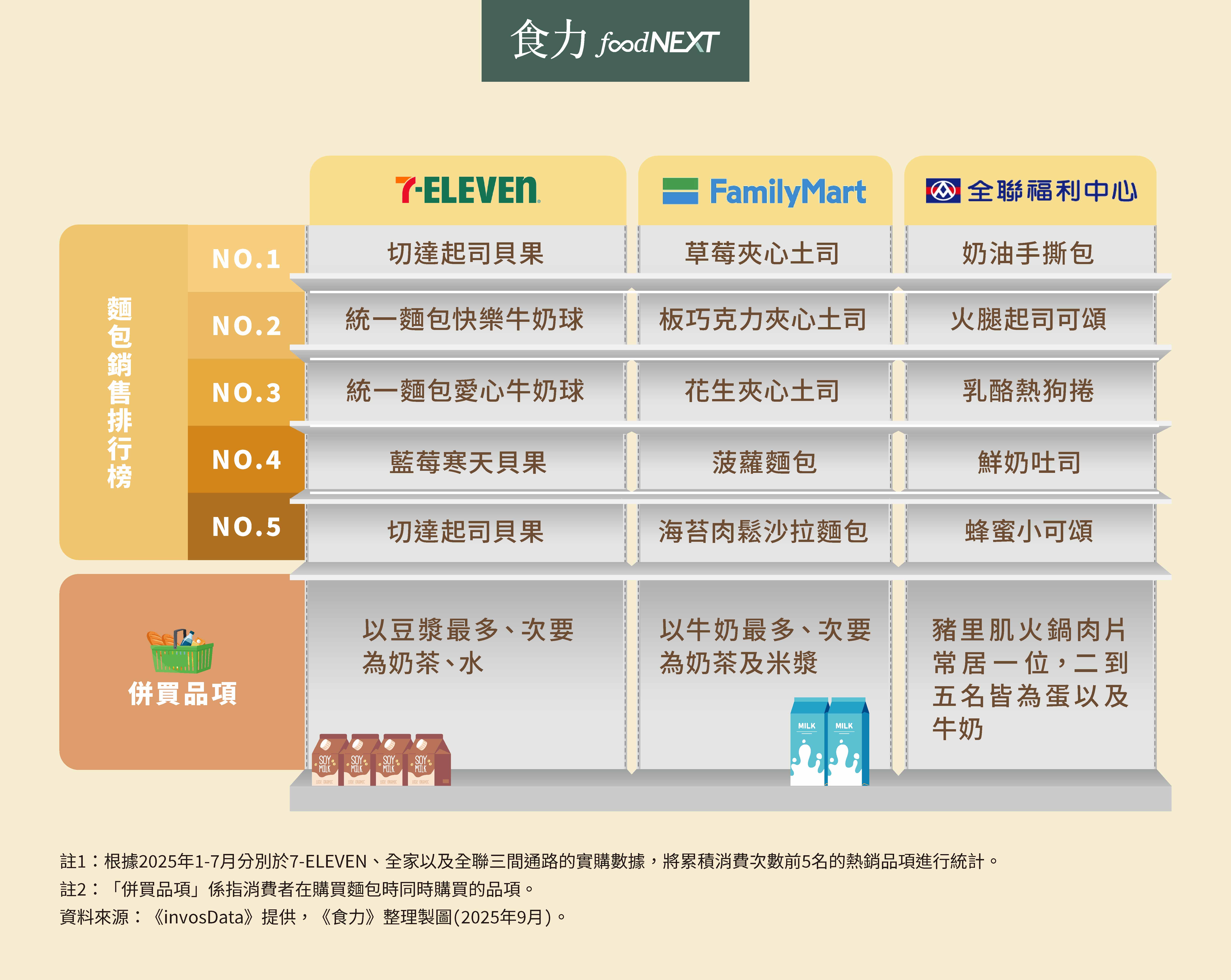 進一步從熱銷品項以及併買行為了解消費者在不同通路的消費情境,可以發現消費者在超商購買麵包大多搭配飲品,形成「早餐組合」或是「下午茶餐點」,消費者應以上班族、學生「即刻消費」為主;而全聯的熱銷品項吐司搭配併買的肉片、蛋、牛奶,明顯符合「家庭早餐」的使用情境,顯示全聯的消費者以「為家庭大量購置」為主。