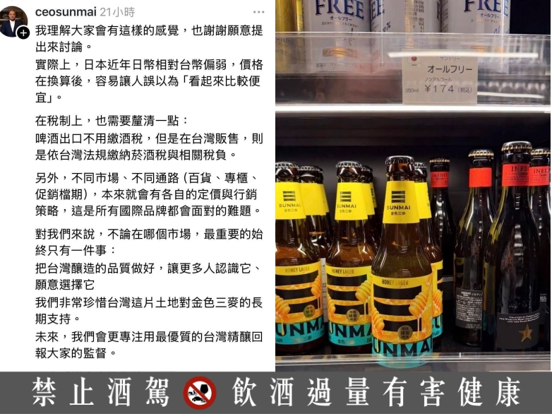 金色三麥執行長葉冠廷因分享蜂蜜啤酒在日本伊勢丹百貨上架的消息,遭網友質疑日本售價比台灣便宜,引發爭議。事發之後除了官方帳號發出聲明,葉冠廷也持續在個人帳號貼文說明。(圖片來源:Threads@ceosunmai截圖)