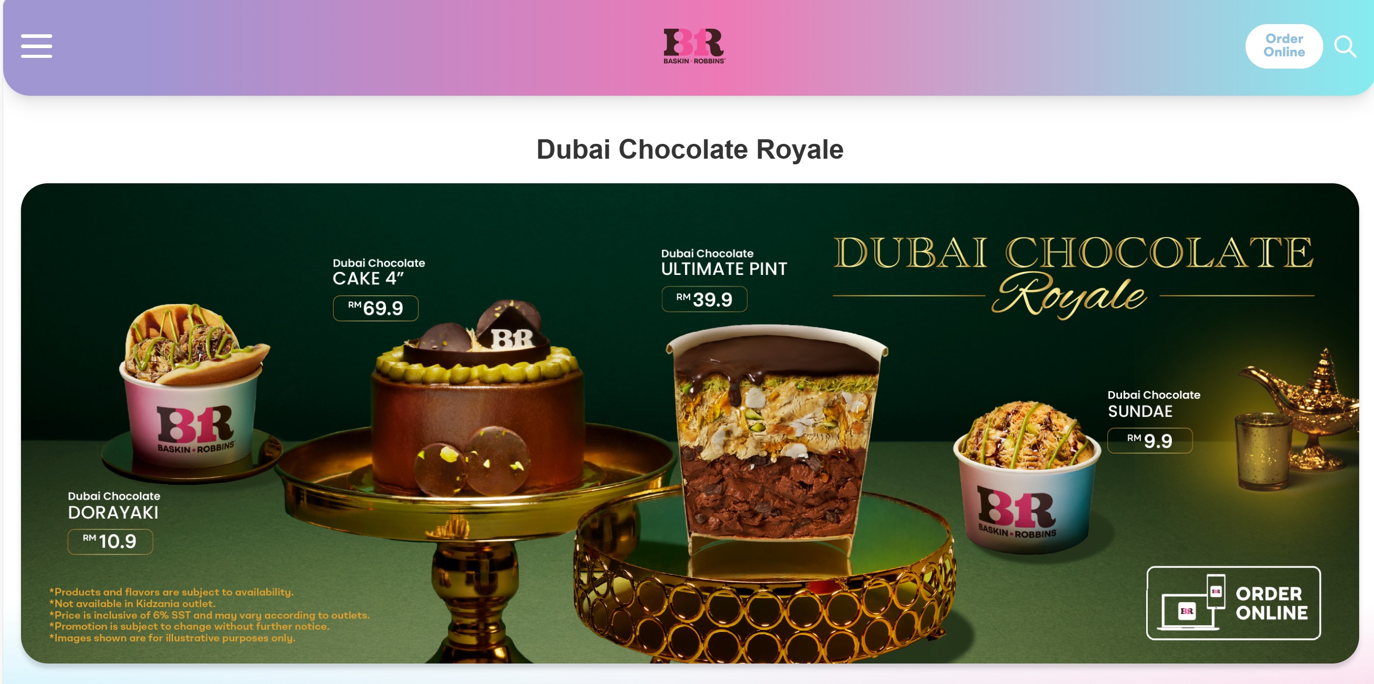 馬來西亞冰淇淋品牌Baskinrobbins官方網站,宣傳風靡網路的杜拜巧克力棒。(圖片來源:Baskinrobbins馬來西亞官方網站,i-Buzz網路口碑研究中心提供)