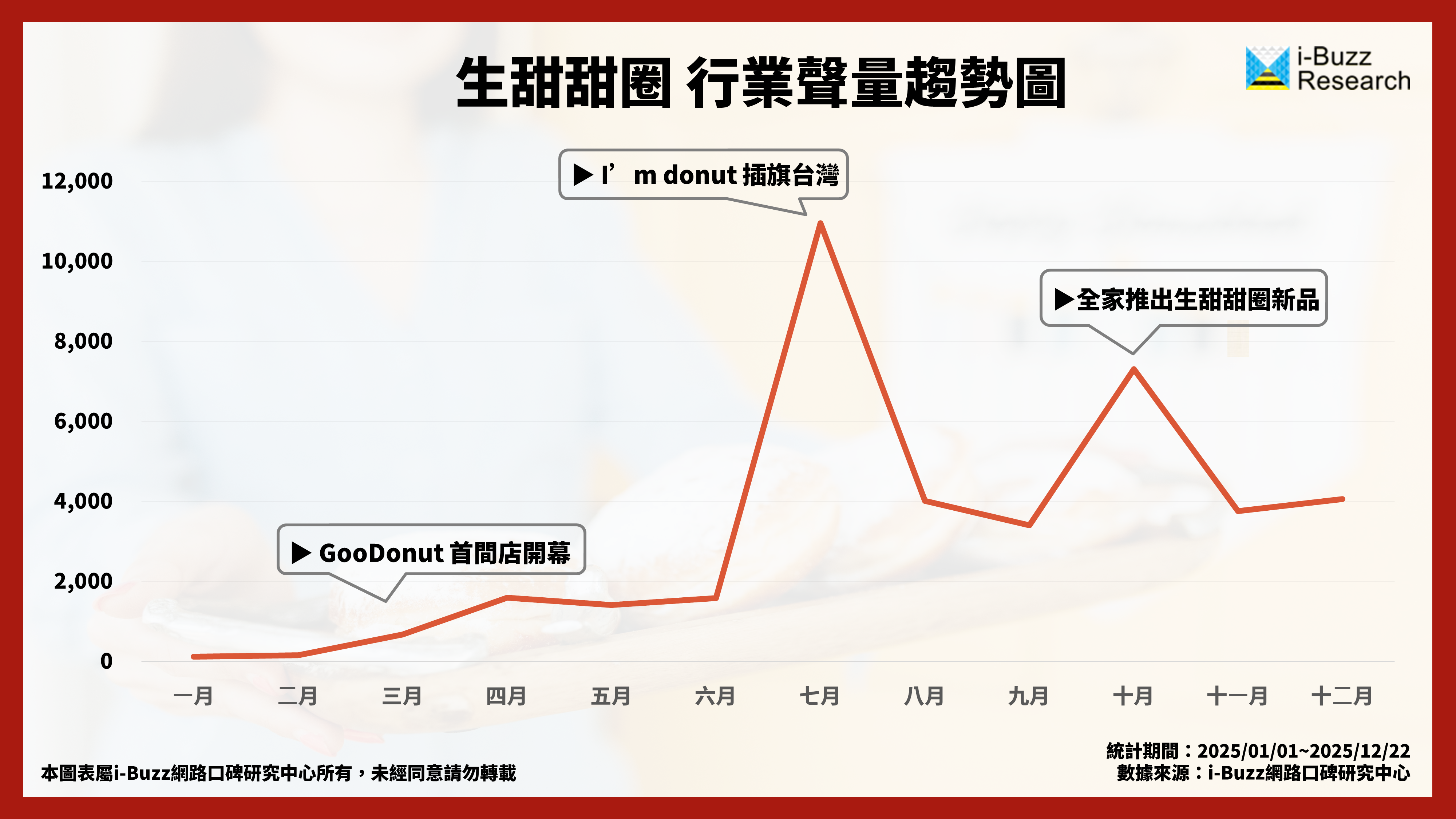 首先先從一整年的話題趨勢來看看究竟生甜甜圈是否只是短時間的話題炒作呢?生甜甜圈的熱潮的起點是2025 年初由藝人阿Ken創立的「Goodonut」開店開始。雖在開店之初吸引許多網紅和藝人曝光,但討論並未迅速被點燃,顯示消費者對於生甜甜圈的興趣還在醞釀中,且 Goodonut一天的產能和銷售量有限的情況下,許多消費者都選擇持續觀望。然而接下來就出現了生甜甜圈話題度爆炸的奇異點。