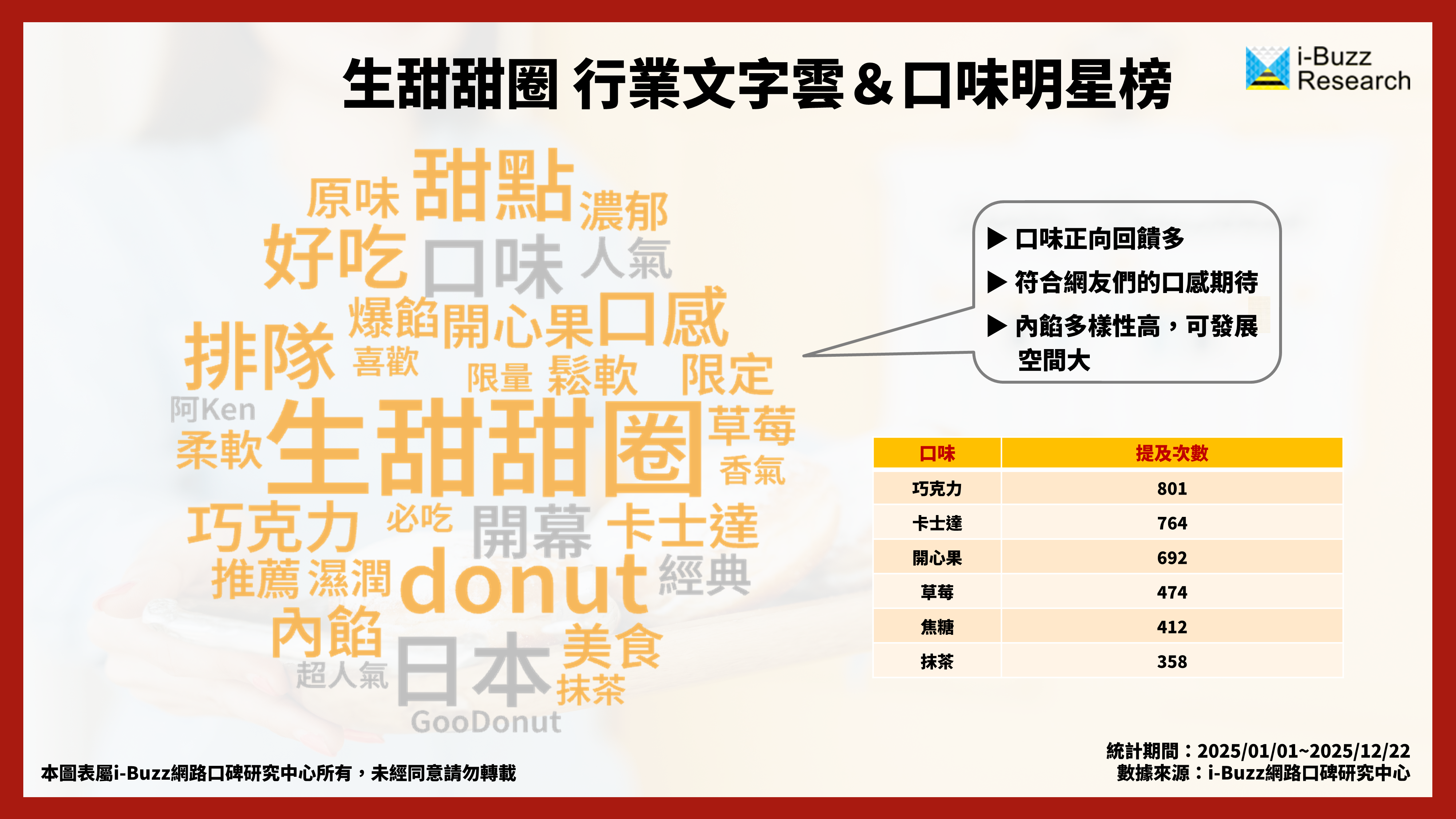進一步結合文字雲觀察可發現,生甜甜圈之所以能承接並延續社群話題,關鍵並不只在於生甜甜圈很有話題性,而是消費者對產品體驗給出了高度一致的正向回饋。文字雲中最突出的關鍵詞集中於「好吃」、「口味」、「內餡」、「口感」等實際食用感受,顯示許多網友不只是嚐鮮跟風而已,是真正的被生甜甜圈本身的魅力所折服。