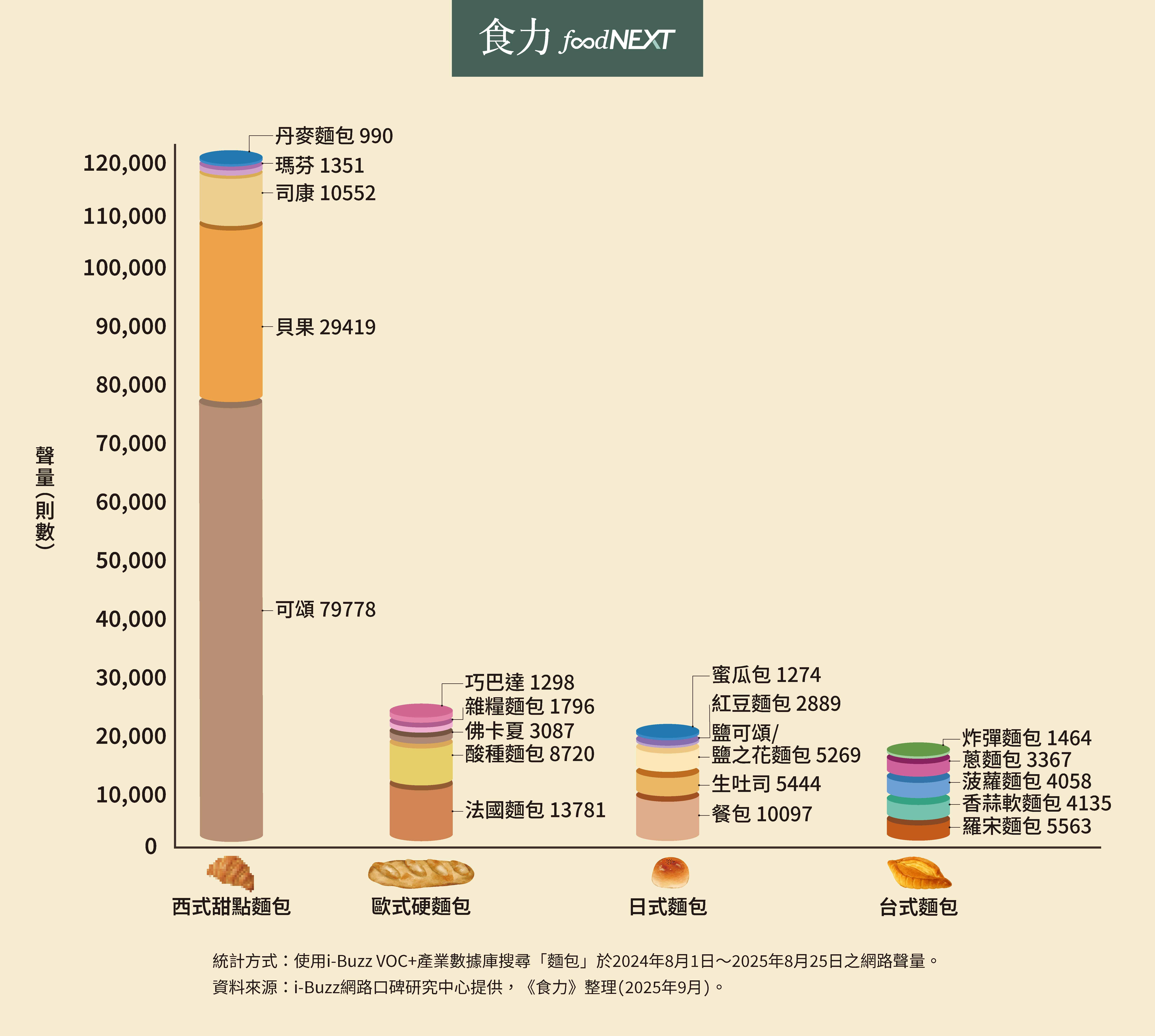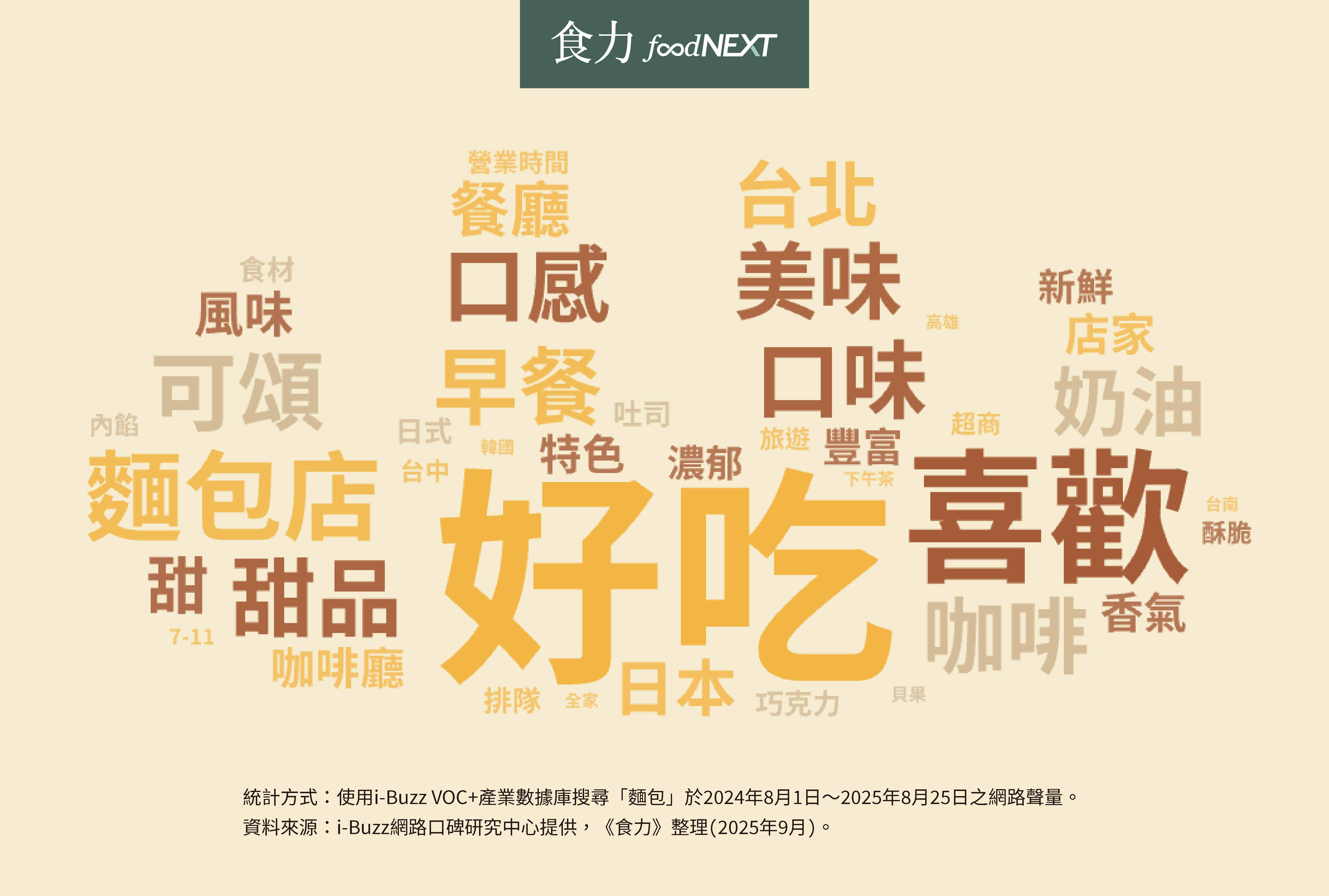 社群媒體推升麵包討論熱度,帶動韓、日及歐美流行麵包在台爆紅。超商、量販店積極投入新品與聯名,成為社群熱門話題。西式麵包如可頌、酸種麵包聲量最高,日式生吐司也掀潮。反觀台式麵包因缺乏社群經營而聲量不足,但部分師傅仍努力創新。