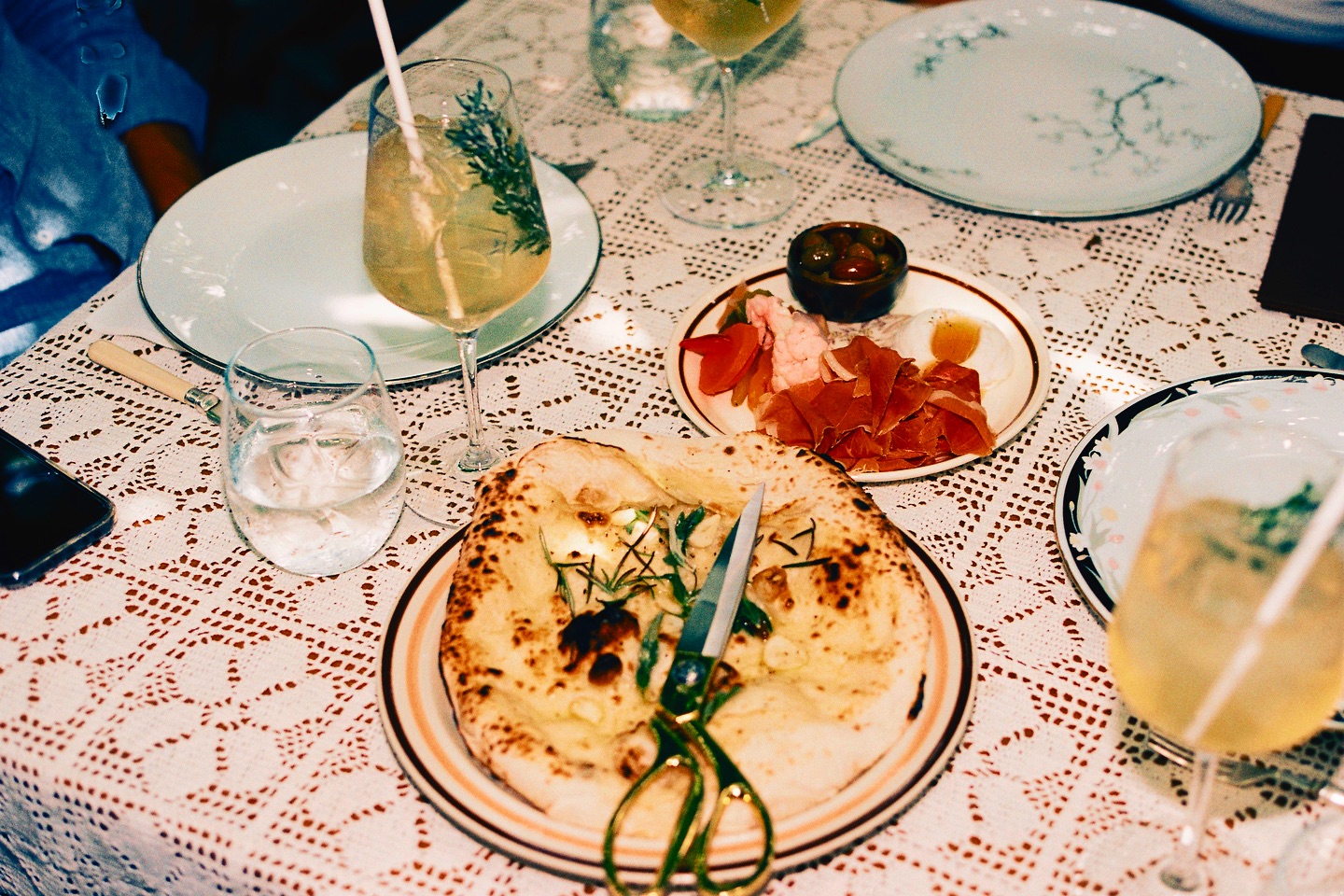 這一席無菜單的地中海午餐包含了希臘、義大利和西班牙風格的菜餚,身為希臘移民第二代的司達馬塔基司在菜單的設計上展現出自身傳承的大家族用餐文化:大份量蘊含著慷慨的胸襟,將簡單的事物做到極致,即是他定義中的地中海美饌。適合共享的餐食類似流水席般使人慢下來、流連於盤飧間:義式開胃菜(antipasti)、餐前小點、義式脆皮豬肉捲(porchetta)、現烤披薩,以及向傳統與袋鼠島致敬的壓軸甜點—無花果葉奶油蛋羹酥皮派(Galaktoboureko)。這道甜點的獨特在於用無花果糖漿取代一般常用的蜂蜜,接著是酥皮上以蜜漬的迷你青澀無花果點綴,最後加入無花果葉製作的義式冰淇淋;葉子特有的苦味近似抹茶,支撐起甜點整體的味蕾層次感。The Fig Tree將於2025年11月12日開放用餐至2026年的4月12日,官網上公布的11道菜如下(會因實際獲得的食材而異):