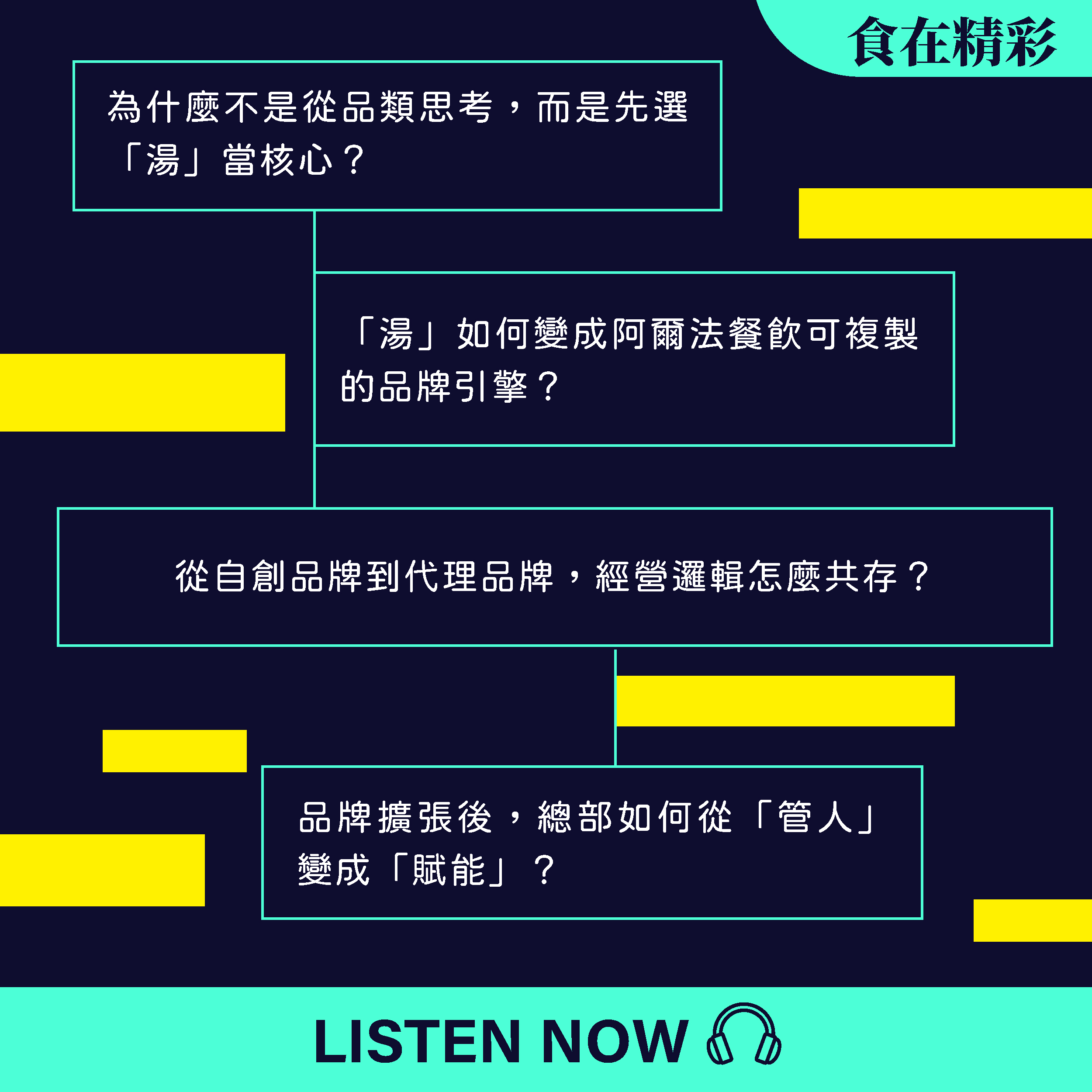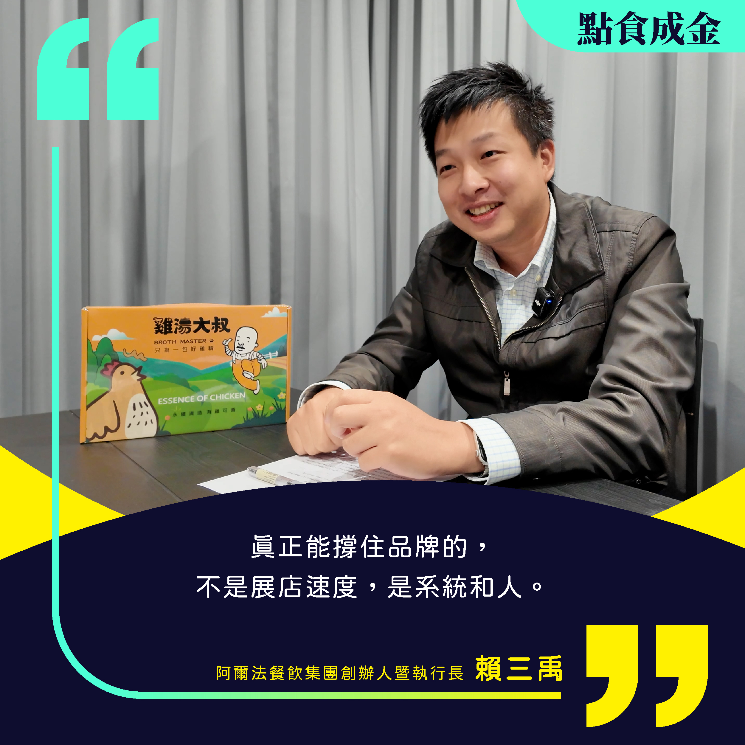 在火鍋競爭最激烈的台灣市場,阿爾法餐飲沒有選擇拚規模或話題,而是從一鍋雞湯出發,慢慢長出多品牌版圖。從「雞湯大叔」到拉麵「麵屋一燈」、「雞湯桑」,以及麻辣燙「賴山嶼」,創辦人賴三禹分享,疫情、缺工與擴張壓力如何逼他重新理解「系統」、「人」與「湯」的價值,也形塑出一套可持續演化的餐飲經營邏輯。