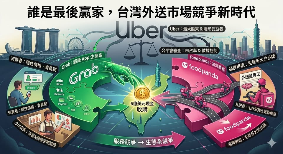 2026年3月24日,Grab以6億美元現金收購foodpanda台灣業務,從表面上看,是一樁跨國平台進軍新市場的資本操作。但若將時間軸拉長,便能看見從Uber退出東南亞、換股持有Grab,到Uber Eats收購foodpanda台灣業務遭公平會否決,再到如今Grab以相同劇本重返舞台,這其實是圍繞著「生態系主導權」所進行的長期布局。