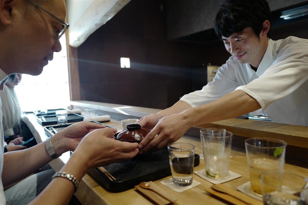 成田主廚也強調其京都名店履歷。例如椀物,不是澄澈見底的清湯,而呈乳白色澤,湯裡添了白味噌,即為京都風格,柔甜韻味中,吐露出烤青椒的碧綠清新,絲瓜的香軟綿厚,還有甘鯛,極好吃的甘鯛!鹽漬後以昆布和清酒蒸透,嫩肉絲絲緊緻又入口即化,鮮度一流。而在菜單中後段,還出現一道關西風棒壽司,以在地食材陸奧竹莢魚、三浦穴子魚製成,也是京都手筆。