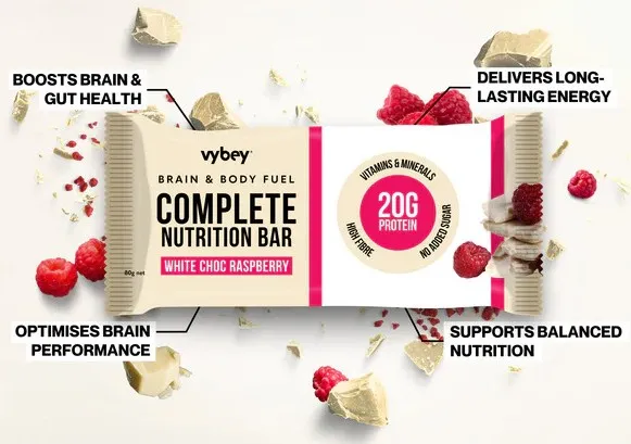 例如,品牌Vybey於2025年在澳洲市場推出的「Vybey完整營養棒(覆盆子風味)」,號稱是一款專為大腦與身體雙重燃力設計的高蛋白營養棒。每條含有20g植物蛋白、8g纖維,強調促進腸道和大腦健康,含有膳食纖維支持消化與營養吸收,添加維生素D及B族(含維生素B1–B6、B12等),以助專注、記憶及整體健康表現。宣稱透過均衡宏觀營養配比,為忙碌日常、工作途中或運動前後提供便捷可攜的輕餐或加餐選擇。