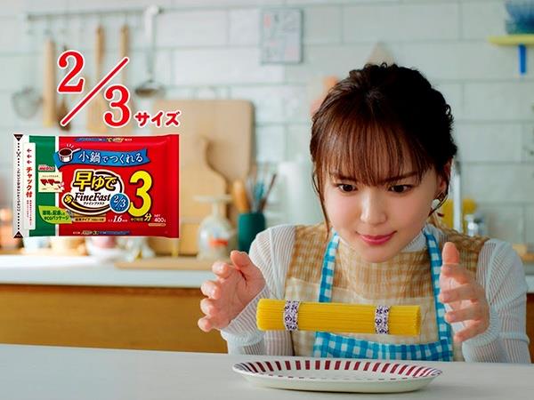為了解決這個問題,日清開發出斷面類似電風扇的「マ・マー 早ゆでスパゲティFineFast」義大利麵。透過在麵條表面切割V型切口,讓沸水更容易滲透至麵心,加速煮熟。這個概念於1986年首次商品化,當時的麵條只有一個V字切口。2011年,新一代產品進化為3個V字切口,斷面呈現風扇形狀。到了2022年,更進一步發展為4個V字切口,使烹煮時間較初期縮短一半以上。對於餐飲業者而言,這項改良帶來了極具價值的效益。
