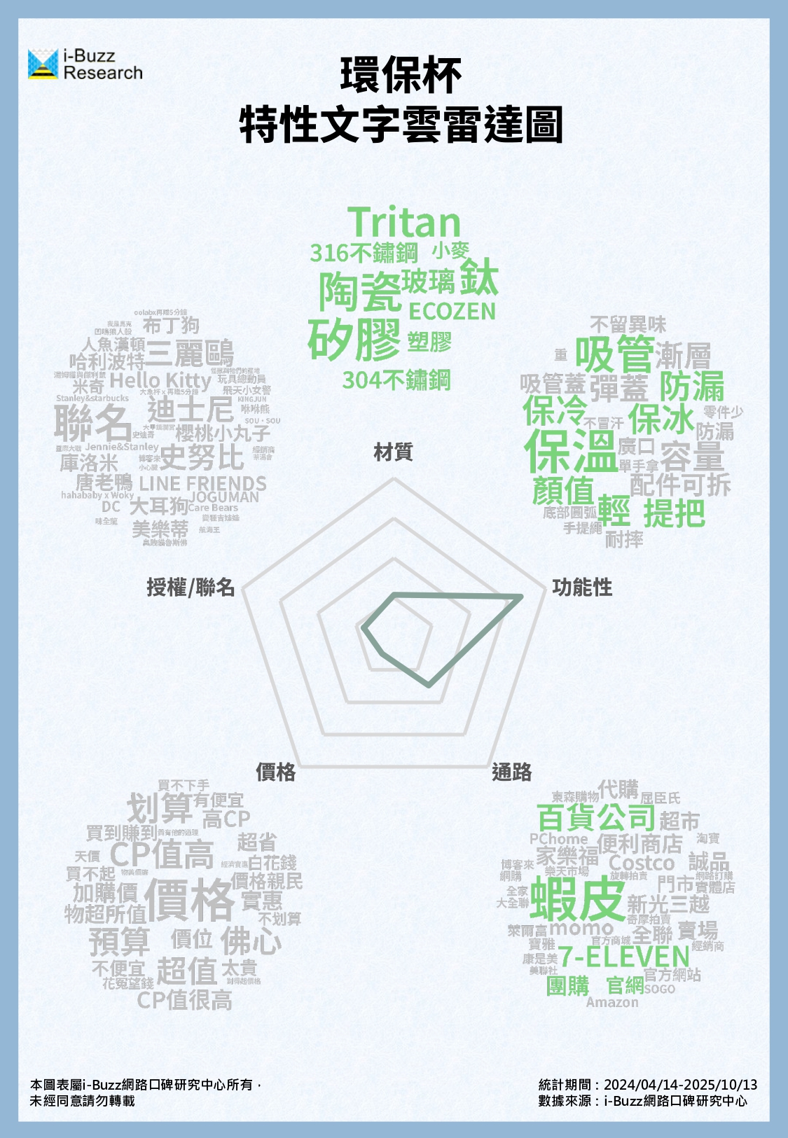 從環保杯特性文字雲雷達圖可以看到消費者的考量不僅限於價格,而是圍繞在「功能性」、「通路便利」、「材質安全」與「聯名收藏價值」等多重面向,尤其「保溫、保冰」依舊是消費者和品牌最常溝通的關鍵字之一。另外,隨著喝手搖飲的需求之大,「吸管杯」與「提把設計」成為實用與便利兼具的首選,許多網友留言大讚「有大提把設計 想掛哪都沒問題」、「吸管可以轉動,方便攪拌或吸料」。