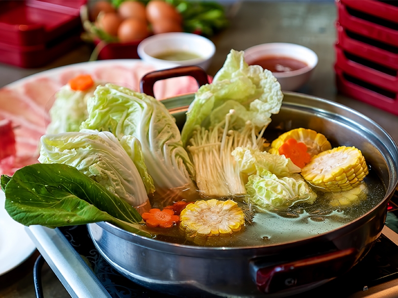 蔬菜清湯鍋:自己在家煮可用洋蔥、玉米和蘿蔔當基底,也可加入牛蒡,讓湯喝起來會有一點肉味。以蔬菜湯為湯底,加入海鮮、肉片和新鮮蔬菜,這樣是最健康的。