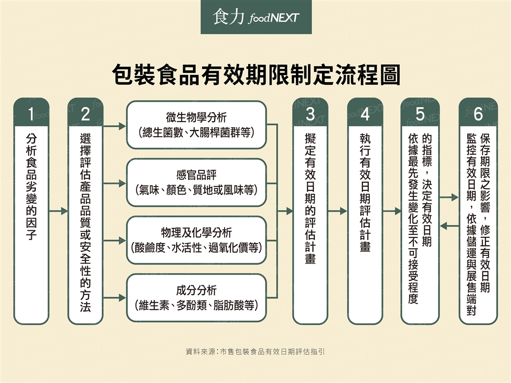 不過,在上述六步驟中,最後一步驟是業者須「監控有效日期」,尤其是產品上市後,也要監測從運輸和通路到消費者手中可能產生的變化,如果有效日期不適當,則需儘快修正。