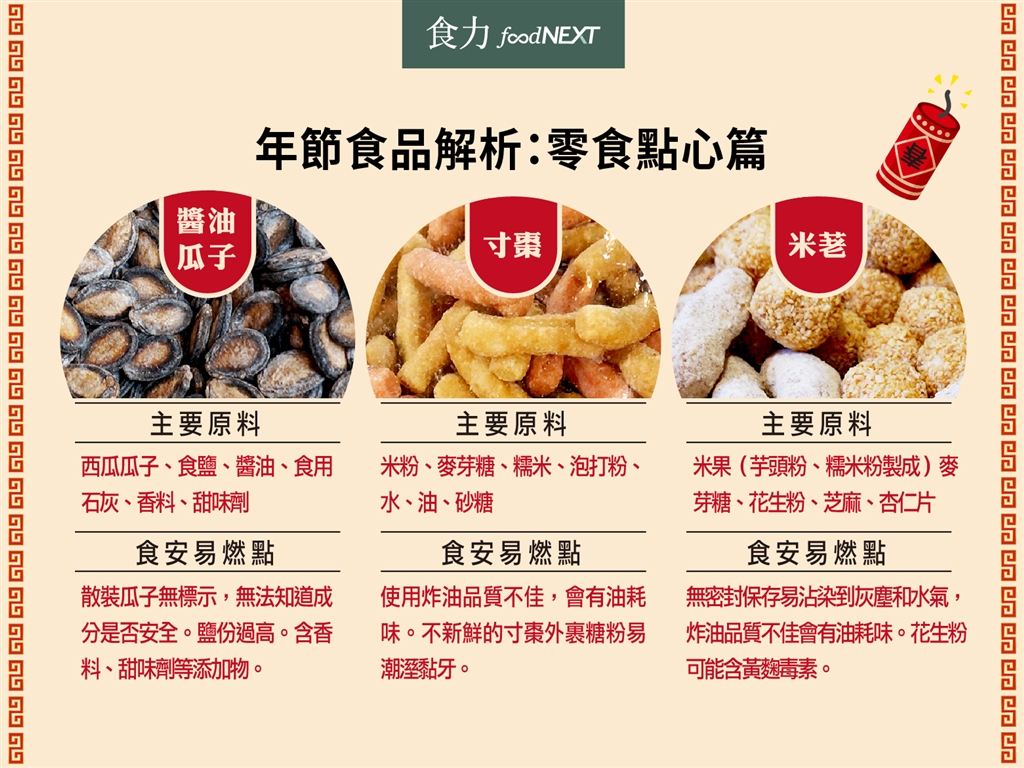 過年就是要在一嗑一吐之間悠閒度過,零食糖果必備。食力精選年節點心盤常見零食:醬油瓜子、寸棗和米荖,提醒您應該注意的食安易燃點!