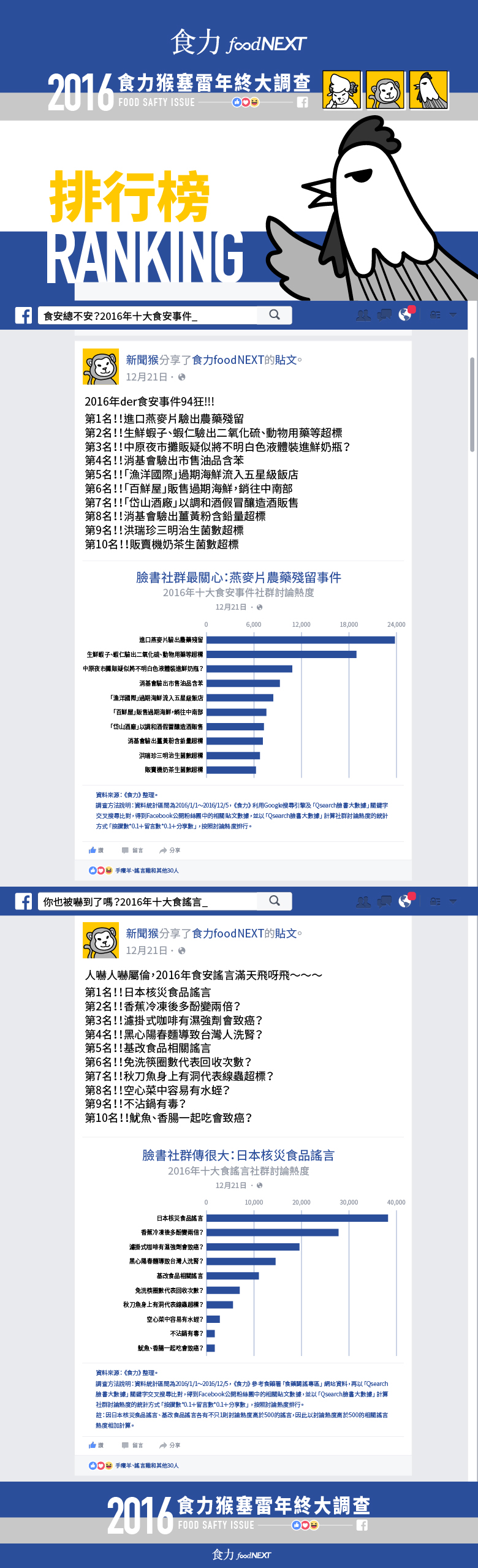 近年食安事件頻繁爆發,網路食安謠言流竄,讓民眾談到「食」就感到惶恐不安!《食力》利用「Qsearch臉書大數據」以及google關鍵字搜尋交叉比對,盤點出2016年最受Facebook網友熱議的十大食安事件,以及最受關注的十大食謠言。快跟著《食力》一起來回顧是否曾在臉書塗鴉牆上看過這樣的消息吧!