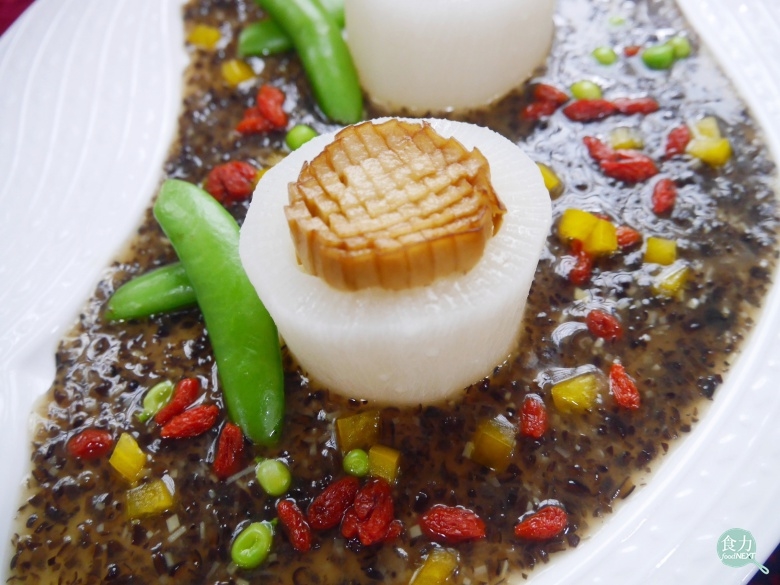Step 2將白蘿蔔去皮後,將中心挖空,入滾水中汆燙後取出,杏鮑菇切小圓段,並切上十字花紋,煎至金黃色填入白蘿蔔中,再一起蒸6分鐘後擺盤。