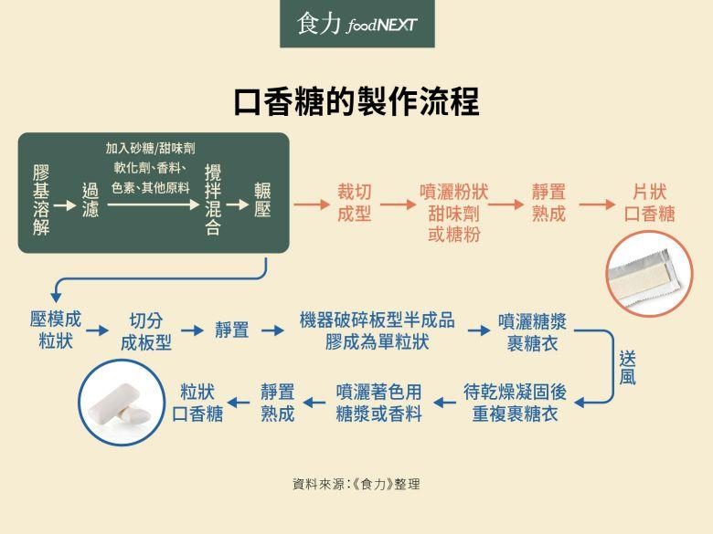 吃口香糖時,一定會呈現出一種的狀態,就是嘴巴持續咀嚼停不下來,這也成為我們常推測他人是否在吃口香糖的有趣線索,不過,為什麼吃口香糖是嚼個不停,而吃到最後會沒有了味道,便會把口香糖吐掉?我們都知道口香糖不能吞下肚,但咀嚼的口香糖究竟是什麼做的?又是如何製作?原來,口香糖是天然樹膠或合成橡膠,並透過混合糖或甜味劑、軟化劑、香料、色素等完成的食品!