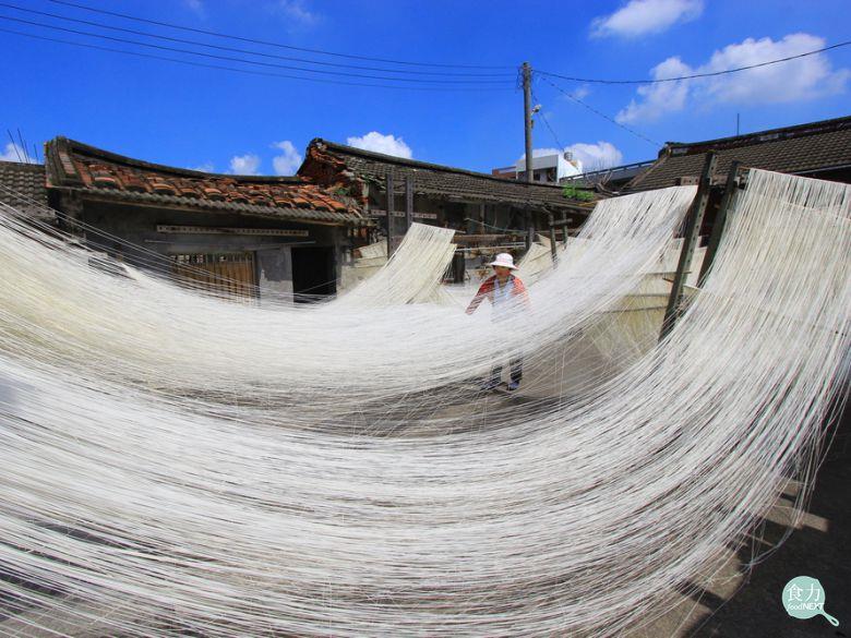 而手工麵線最大的特點則是歷經拉麵的過程,透過人力拉麵使麵條漸趨於細絲狀,使用麵粉、水以及鹽分經由攪拌揉麵後,將麵糰置入麵盤上並將麵團切割成粗條狀,再稍微搓揉麵條,將麵條以八字形繞至於麵竿上,等待略為醒麵後,以人工拉麵方式兩人各持一根麵竿進行拉麵,並運用力道及甩麵作法,添加高鹽分的麵團在此展現出高延展性,經由幾次拉麵後麵條逐漸轉細,最後再透過日曬或是室內烘乾方式完成。