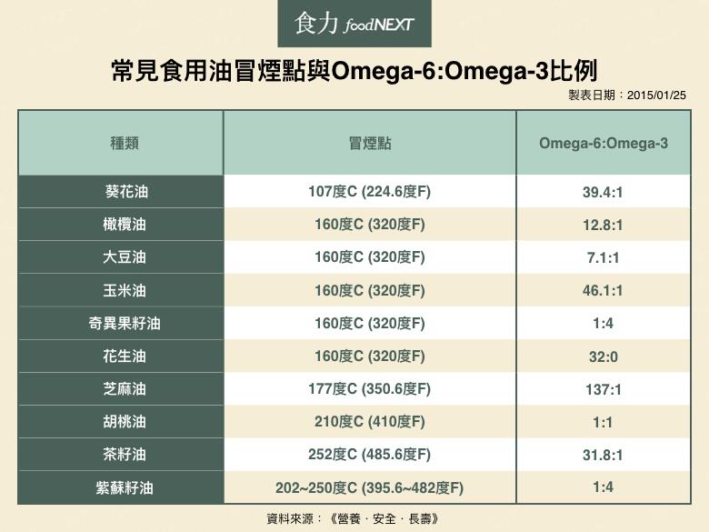 亞洲的烹調方式喜好用大火快炒或煎炸食物, 此時的溫度可達190度C (374度F),以冒煙點160度C (320度F) 的橄欖油為例,就不適合大火烹飪而更適合用作涼拌菜餚;奇異果籽油雖然Omega-6與Omega-3脂肪酸的比例優良(1 : 4),但也不適合高溫煎炒, 因為其冒煙點僅有160度C (320度F);冒煙點為200度C (392度F)的胡桃油和紫蘇籽油,大火快炒時就更為安全些。