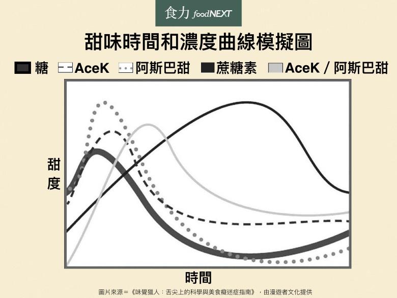 上圖說明了糖需要一點時間才會起反應,它在你口中的感受比馬上起反應的阿斯巴甜慢很多。你也可看到在糖、阿斯巴甜和AceK的甜味已經達到高峰,並且開始減退之際,蔗糖素的甜味依舊維持高濃度。而糖與「非營養性甜味劑」 (nonnutritive sweeteners)在時間和濃度上的差異,就是讓人覺得後者嘗起來味道不對勁的原因。