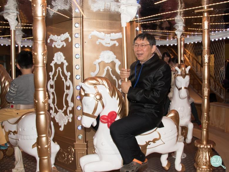 臺北市長柯文哲帶領現場的家長與小孩一同體驗親子餐廳的旋轉木馬