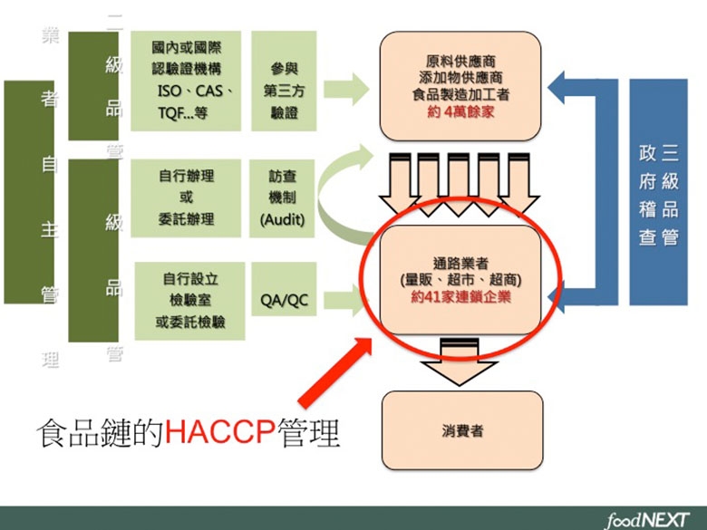 我們正在改變管理策略,將40萬家改成40家的管理。用食品業的HACCP方式來控管,通路商41家其中13家就涵蓋95%市場供應;把這13家管好,就能管制大部份商品的製造商。廠商自己要做品管(QAQC)、Audit (一級品管),產品認證 (二級品管),如果完全做好,政府只要負責第三級管理的抽驗,就能比現有的管理機制更好。