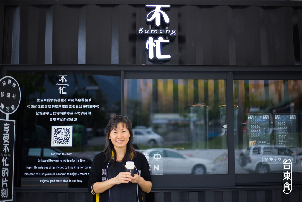 位於台東都蘭糖廠對面一間黑色的貨櫃屋,一走近玻璃窗口,老闆娘馬上笑容滿面的推開窗口。口味多樣的鐵板冰淇淋、顏色鮮亮的手工果乾、樣貌圓圓的雞蛋糕及琳琅滿目的飲品,每一樣都讓人很想嚐嚐。老闆娘說「不忙」像是一種生活態度,製作上以最少的添加展現食材原味,藉由品嚐一片果乾,為繁忙的生活偷一刻空閒,享受食物真正的味道。
