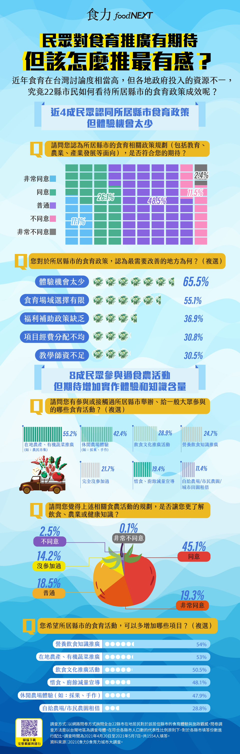 為了瞭解全台各縣市推動食育的民眾滿意度,《食力》獨家進行調查,發現有約4成民眾認為所居縣市的食育政策符合期待,但實際參與相關活動之後,仍認為目前參與機會不足、且能夠體驗的場域仍不夠多。