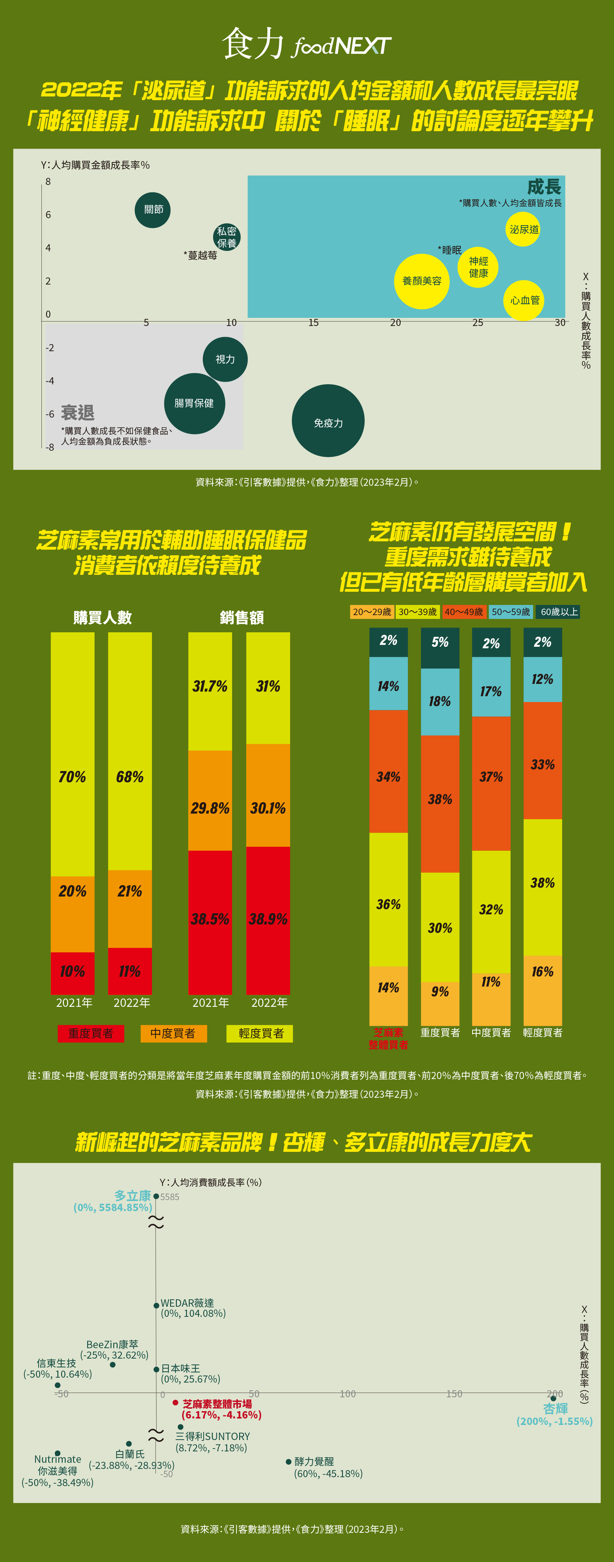 台灣因為疫情的關係,保健食品市場成長力道逐步攀升,直至2022年下半年開始減弱。《食力》和引客數據合作,探討了輔助睡眠的保健食品,並以其一成分「芝麻素」觀察消費者行為變化。