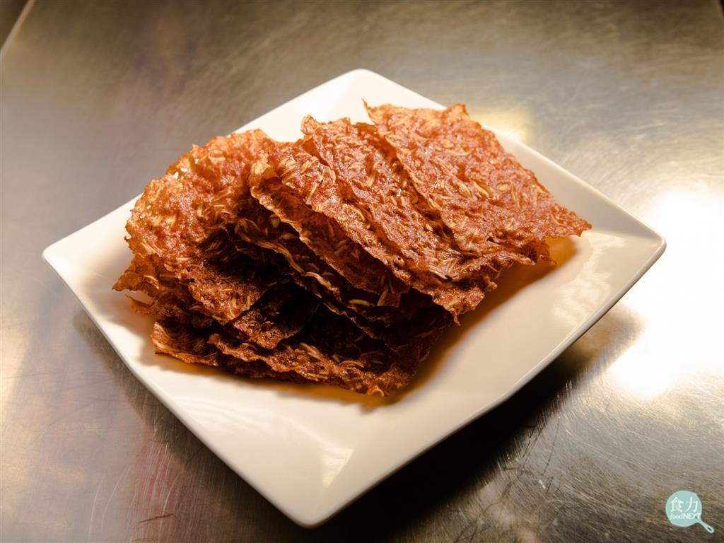 江記華隆的招牌商品「杏仁肉紙」又輕又薄,拿在手上必須注意力道,稍用力過度就會破碎,杏仁肉紙吃進嘴裡口感酥脆、杏仁與豬肉混合著一股鹹香,迷倒不少顧客,甚至紅到香港去,美食家蘇施黃、旅遊書先後介紹江記華隆的杏仁肉紙,讓許多人遠從香港慕名而來,就是為了買上一箱細細品嚐。