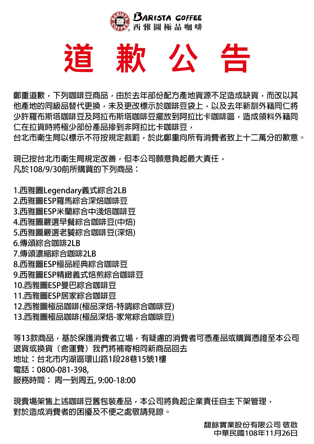 西雅圖咖啡在2019年11月26日向士林地檢坦承犯罪並繳回犯罪所得1千萬元,回頭在粉絲團發表的道歉聲明卻把錯推給「新訓外籍員工」,如今卻當庭否認犯罪,再把錯推給廠務經理,說詞前後反覆不一。(圖片來源:西雅圖極品咖啡官方粉絲團)
