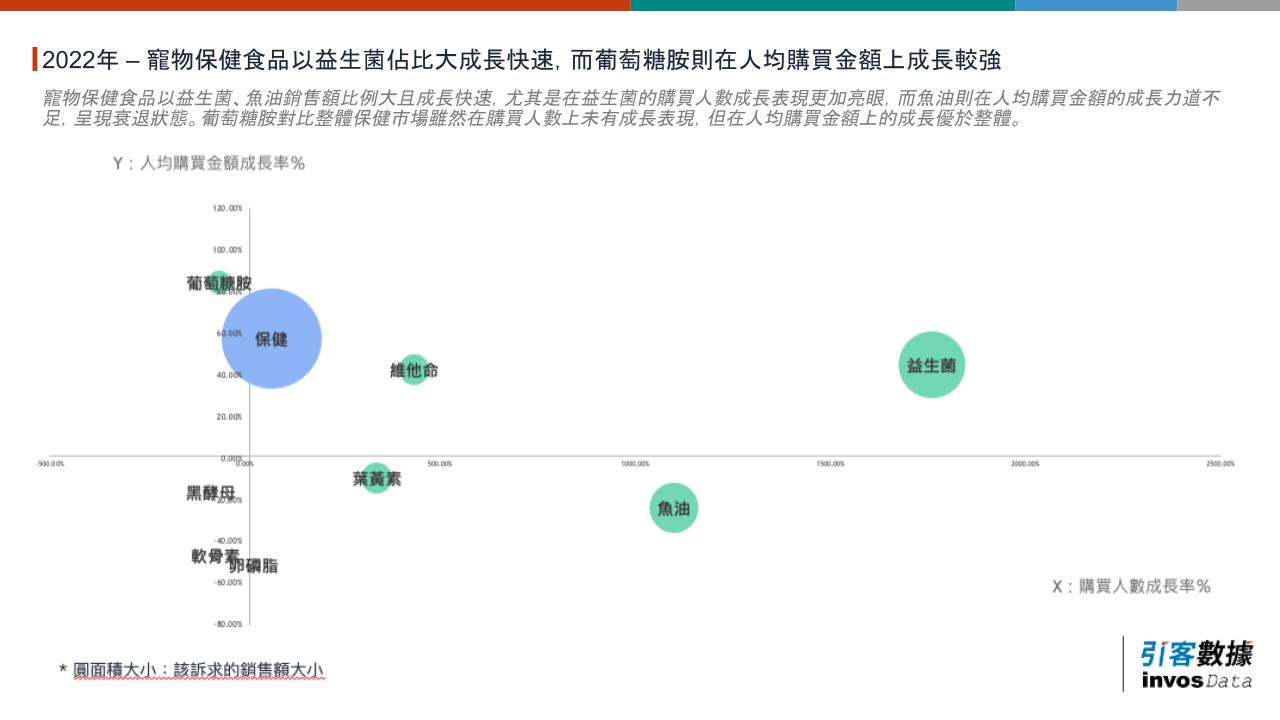 另外,葡萄糖胺在整體寵物保健食品市場中的表現值得關注。儘管在購買人數上未有顯著的成長,但葡萄糖胺在人均購買金額上的增長優於整體市場。隨著寵物的年齡增長,關節問題成為一個普遍存在的健康問題,而葡萄糖胺是一種常見的關節保健成分,具有緩解關節炎症狀和改善關節靈活性的功效。