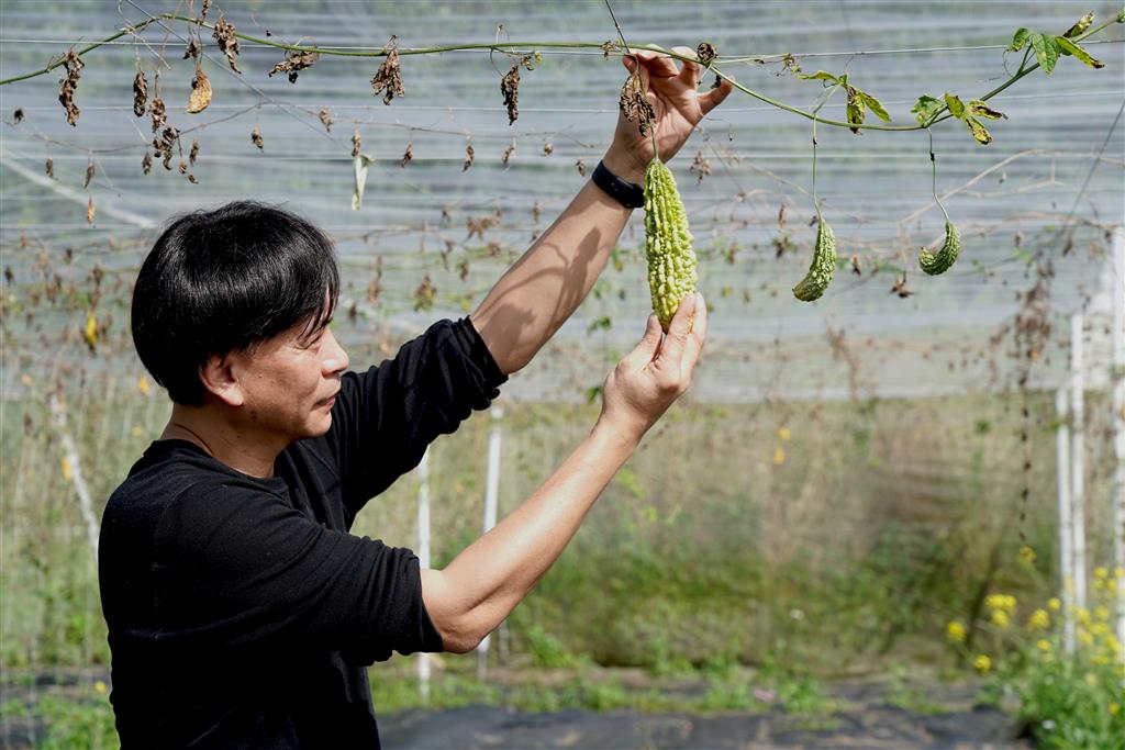 曾吉生堅持有機栽培山苦瓜,果實的蟲害嚴重賣相不佳,因此轉而將山苦瓜投入「加工」,發揮更大的價值。(翁嬿婷攝)
