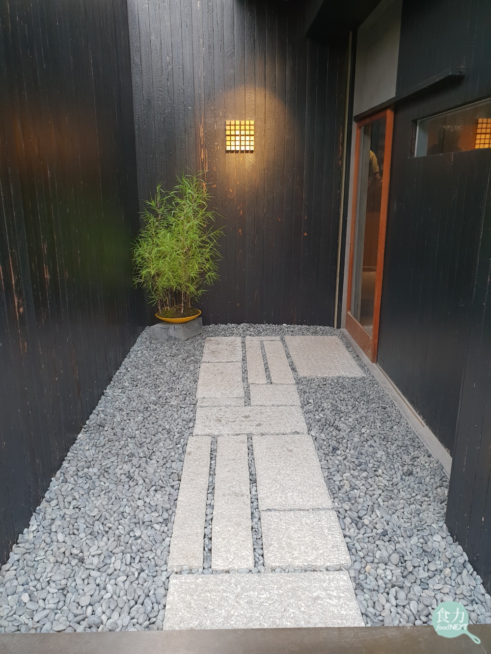 充滿濃厚日式侘寂美學的庭院,牆上佇立著以36個小方石組成的圖案,這不僅是品牌的識別,更代表著國友榮一對咖啡品嚐的「盒子」理念:用盒子盛裝咖啡豆,讓咖啡師在盒子上專注地沖調咖啡,也讓客人在如盒子般的簡潔空間中靜心品嚐咖啡。
