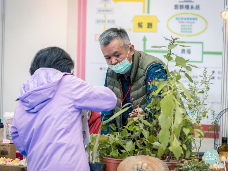 櫻之田野農莊於「2022花蓮食農博覽會」將餐廳廚餘作為推肥中野菜、飼料養牲畜,轉化為餐廳料理所需的食材的流程展示出來,傳達餐廳如何最大幅度減少浪費,希望帶動民眾一起響應。(張偉明 攝)