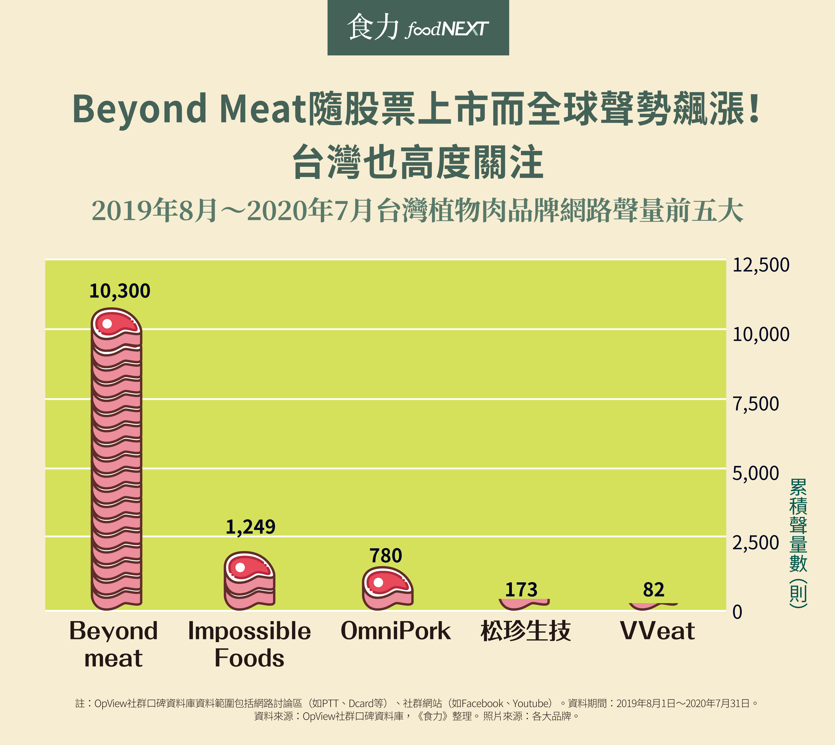 隨著國外植物肉品牌先後進駐,過去一年,植物肉幾乎成為蔬食的最「潮」話題。《食力》分析「OpView社群口碑資料庫」網路聲量發現,2019年8月至2020年7月之間,植物肉在社群的討論度最高點,多與植物肉品牌、餐飲業者聯手合作帶起話題性有關。其次大型通路業者的佈局也同步成為網路社群的關注焦點。