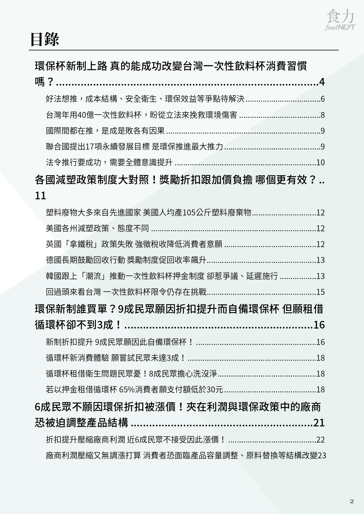 回列表 【電子雜誌】2022環保杯新制消費行為大調查 2022年7月1日《一次用飲料杯限制使用對象及實施方式》法令正式上路,規定連鎖便利商店、速食店、超市、飲料店業者等使用一次性飲料杯業者,自備飲料杯至少需給5元折扣;2023年起,連鎖超商和速食業者更需要提供循環杯服務。環保新制立意良善,但產業和消費者的環保意識和機制,真的都到位了嗎? 需要10學分 我要兌換下載