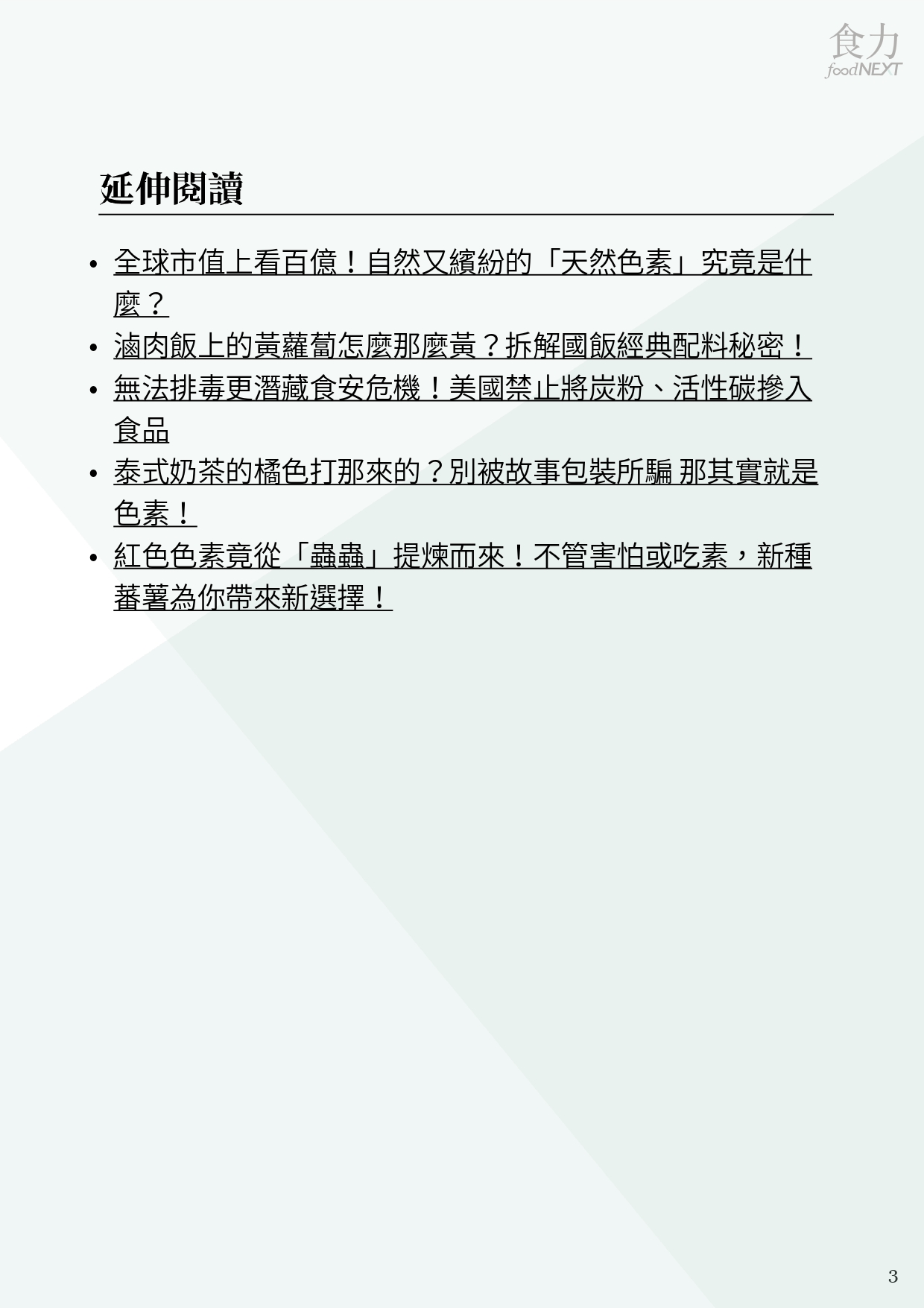 回列表 【電子雜誌】過動、致癌,都是色素的錯? 如果馬卡龍或棒棒糖失去了繽紛的色彩,你還會買單嗎?「色素」賦予食品美麗的色澤,進一步刺激了食慾與購買慾。但是你是否也擔心色素不健康,可能會引發過動症、甚至致癌?!事實上,色素真的如此不堪嗎?如果真的有問題,為什麼還被允許使用呢?就讓《食力》為你揭開色素的真面目。 需要10學分 我要兌換下載