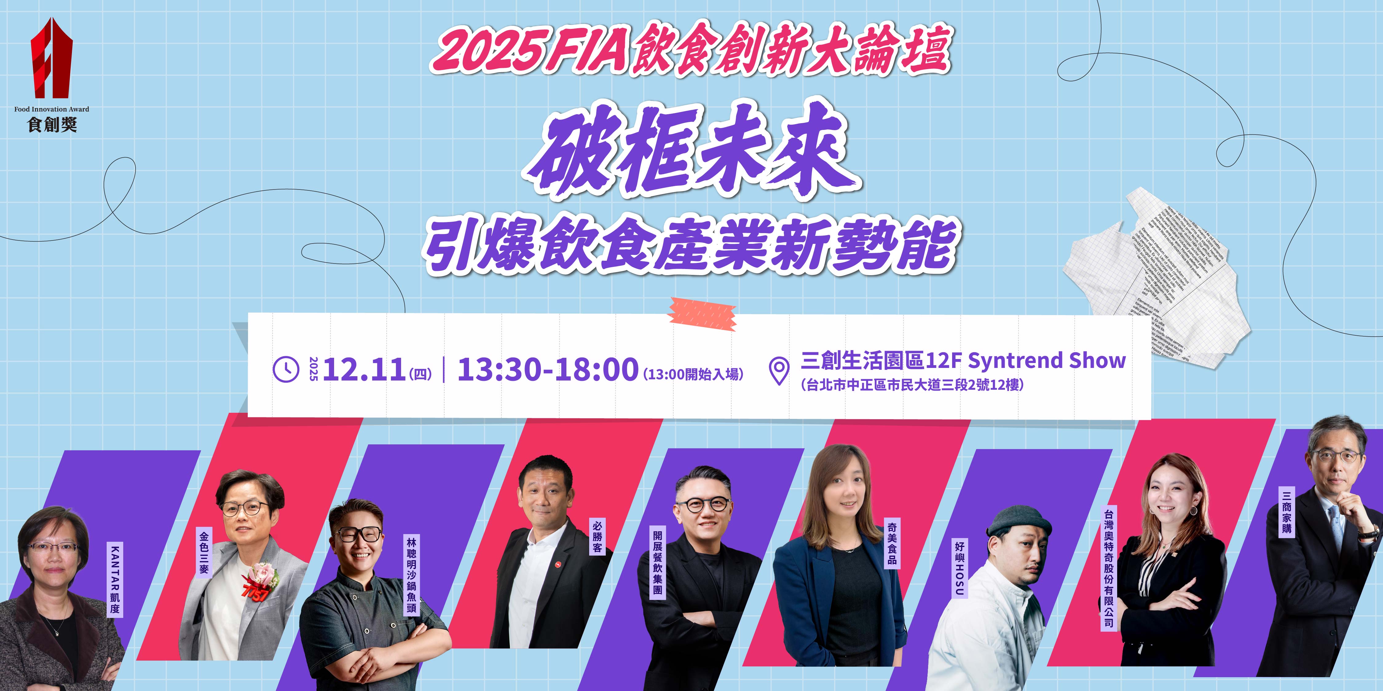 被譽為「飲食產業奧斯卡獎」的權威評鑑「食創獎」由飲食產業專業媒體《食力》、台灣第一飲食群募平台《拾光》共同主辦。典禮後的年度重磅講座「2025 FIA飲食創新大論壇」,今年度以「破框未來,引爆飲食產業新勢能」為主題,集結9大創新實踐者,探討品牌如何突破自我、突圍台灣市場,探索飲食產業如何跳脫侷限、轉化挑戰,創造下一波成長能量。