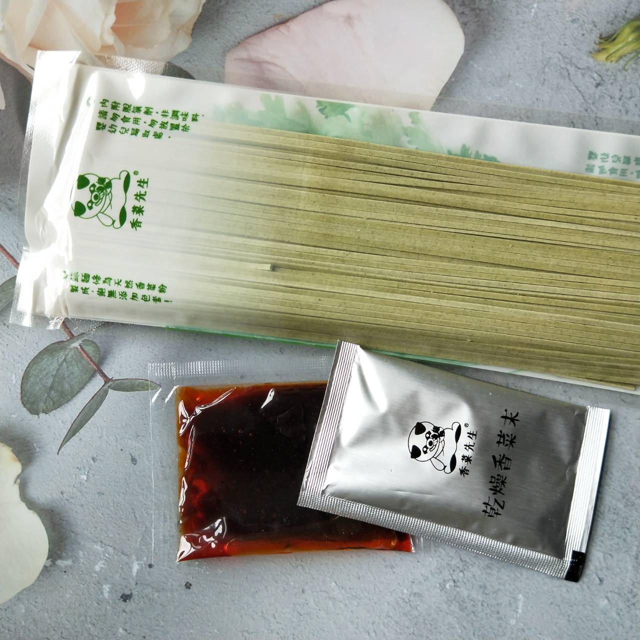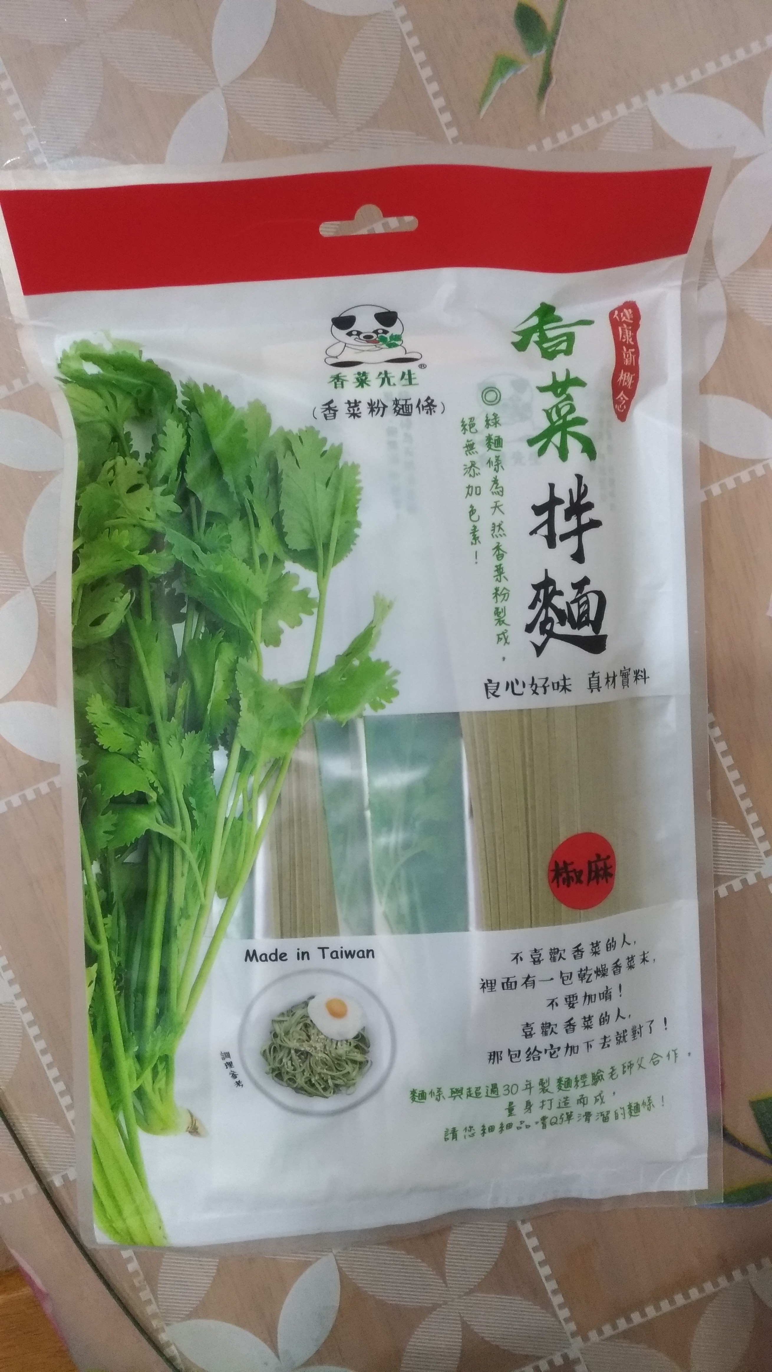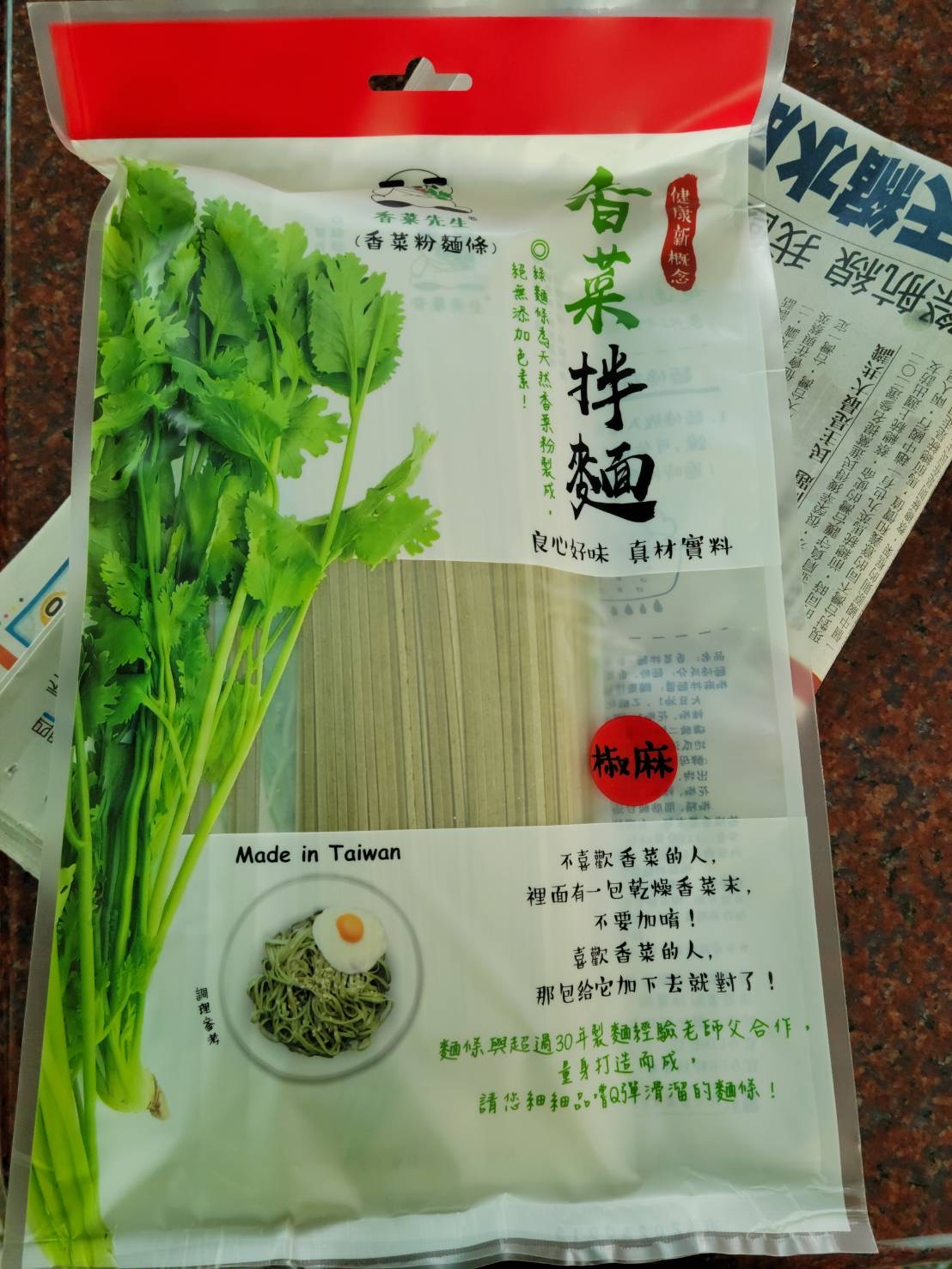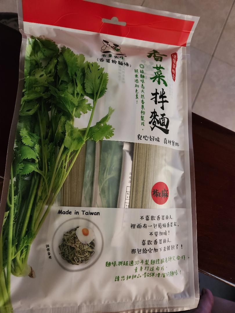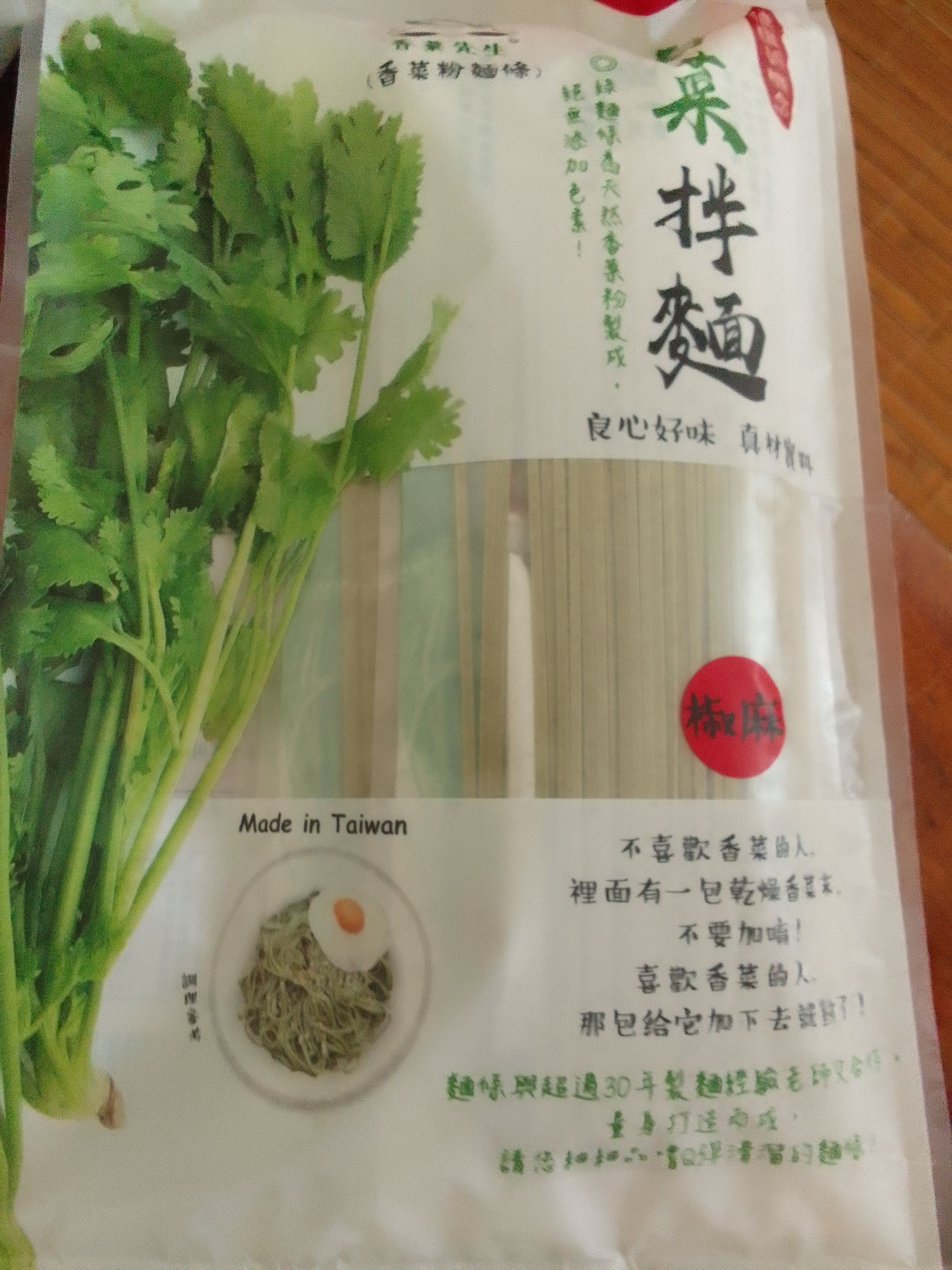 麵條成分:香菜粉、麵粉、食鹽、水。乾燥香菜末包:台灣純香菜。