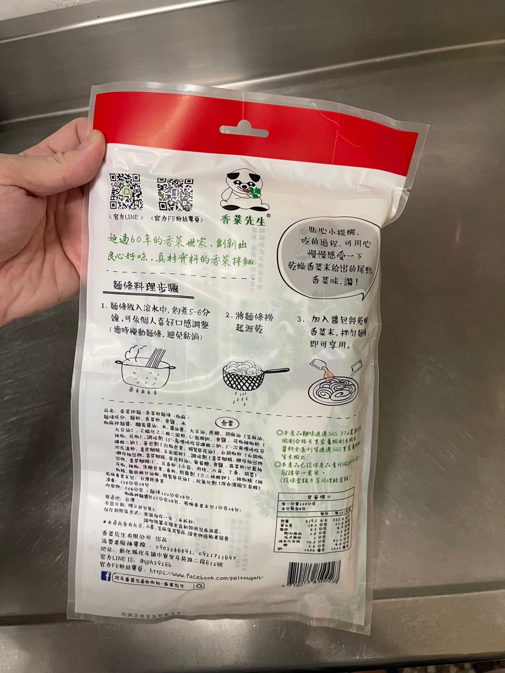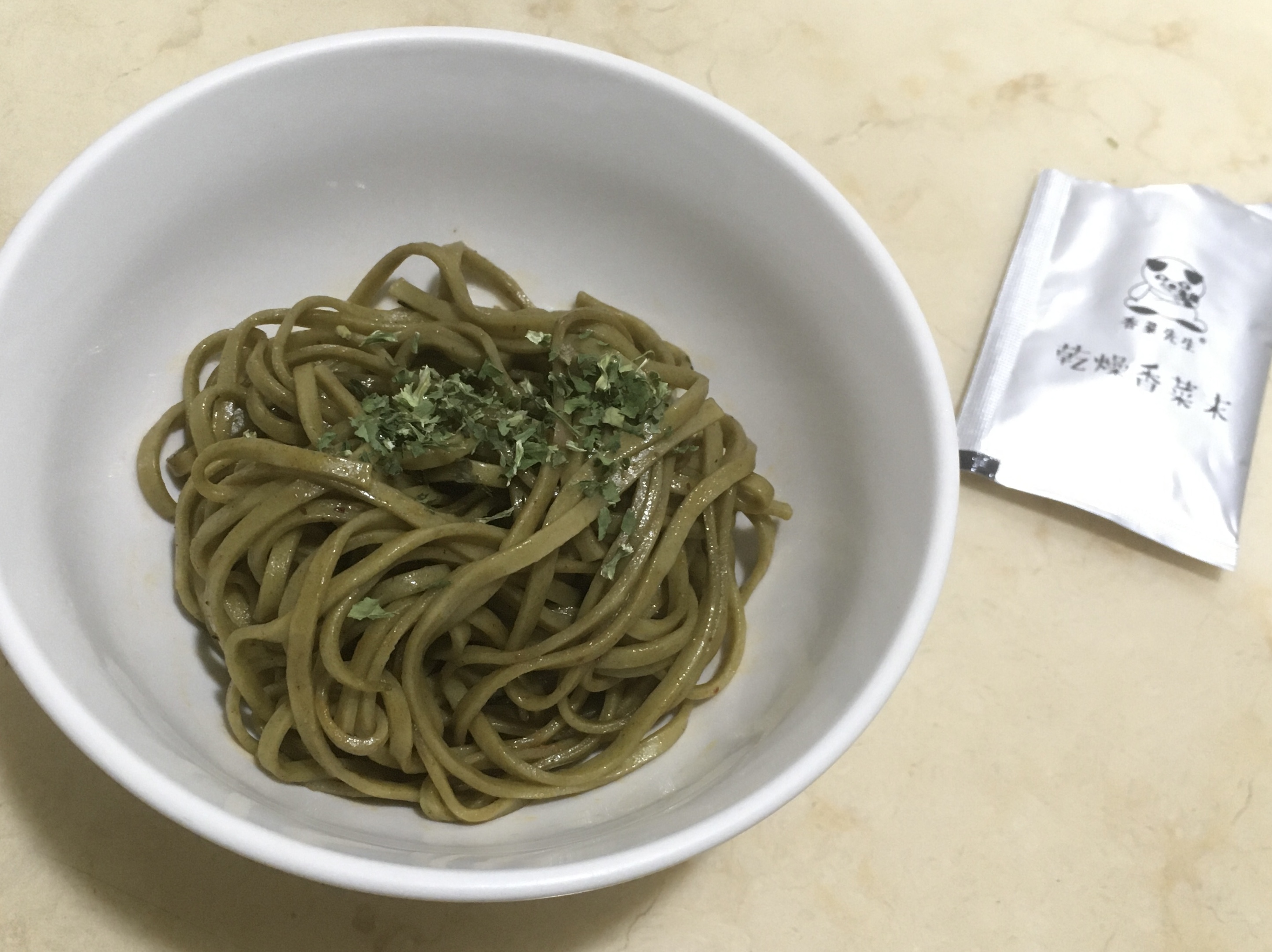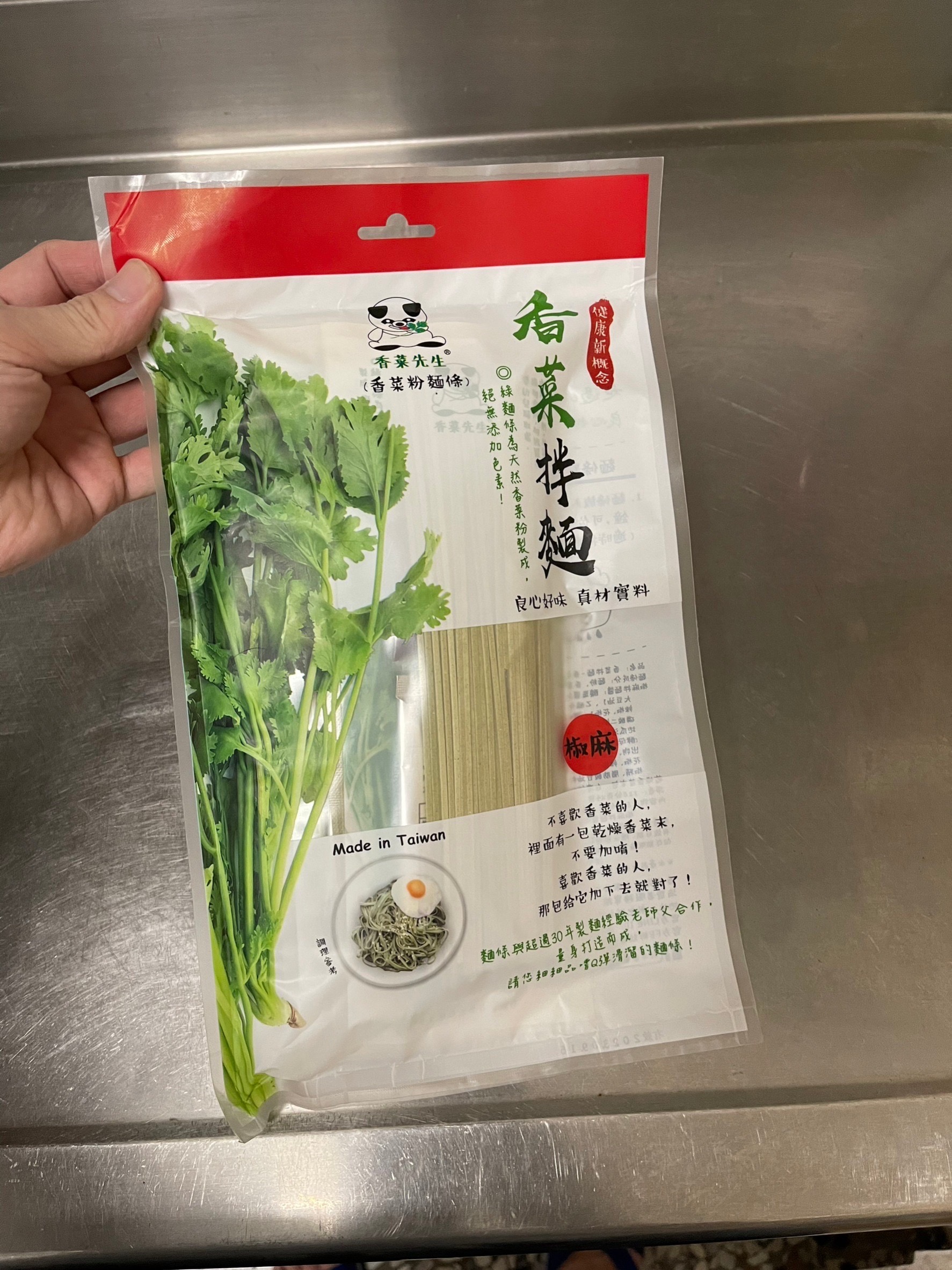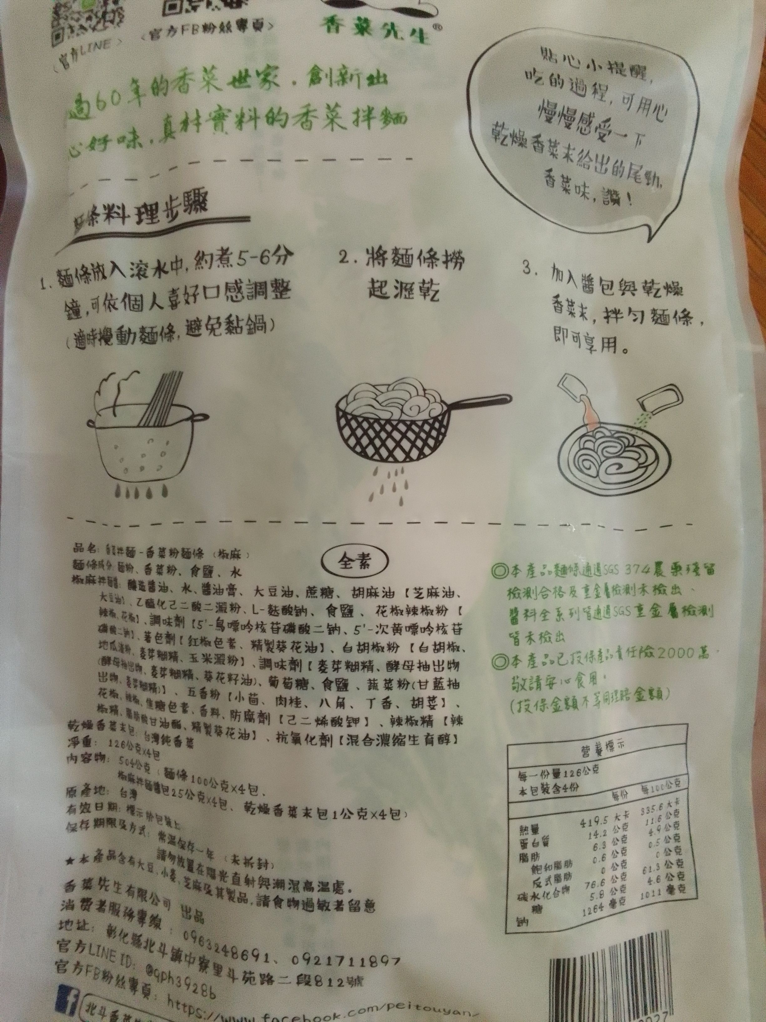 麵條成分:香菜粉、麵粉、食鹽、水。乾燥香菜末包:台灣純香菜。