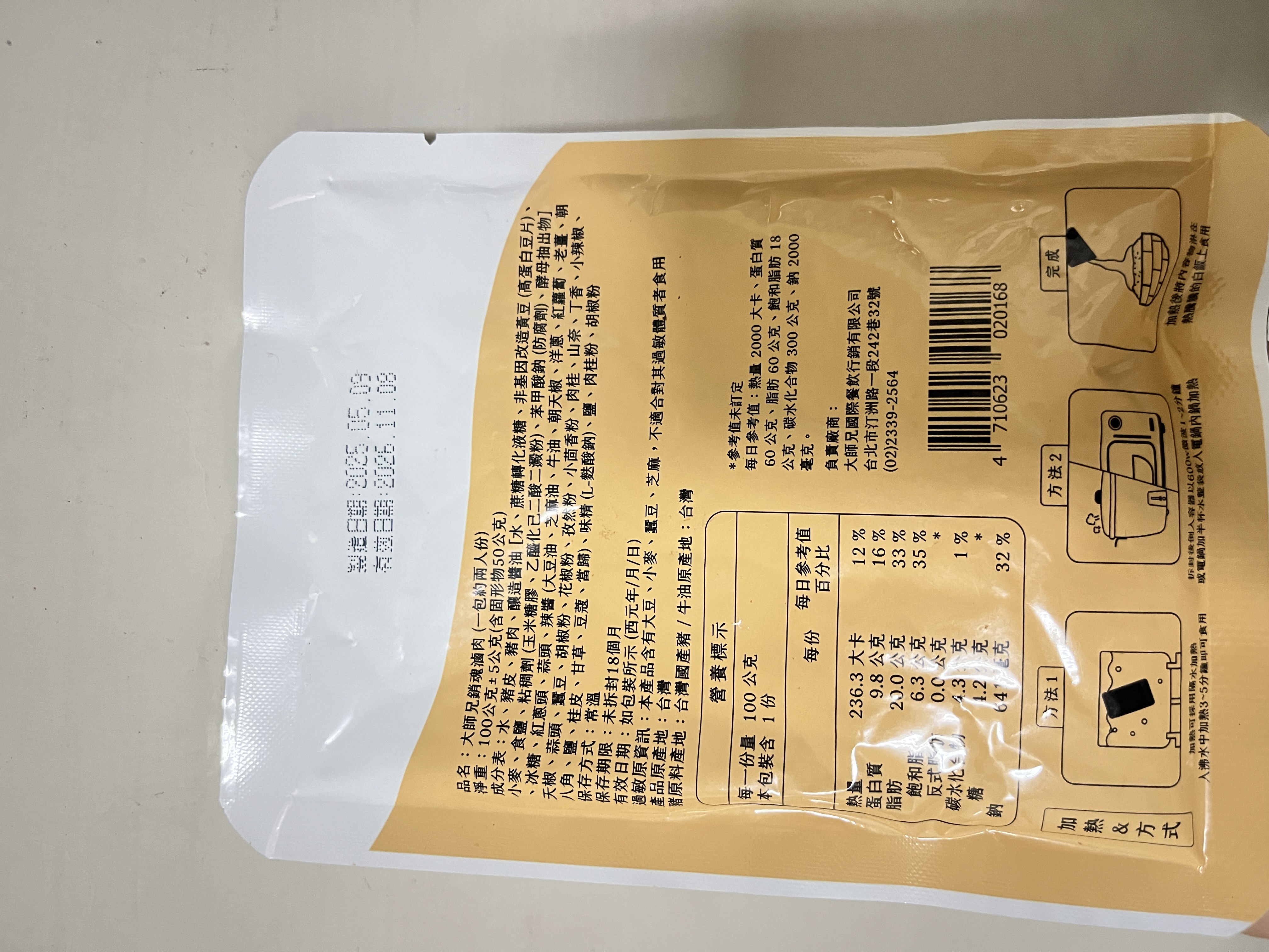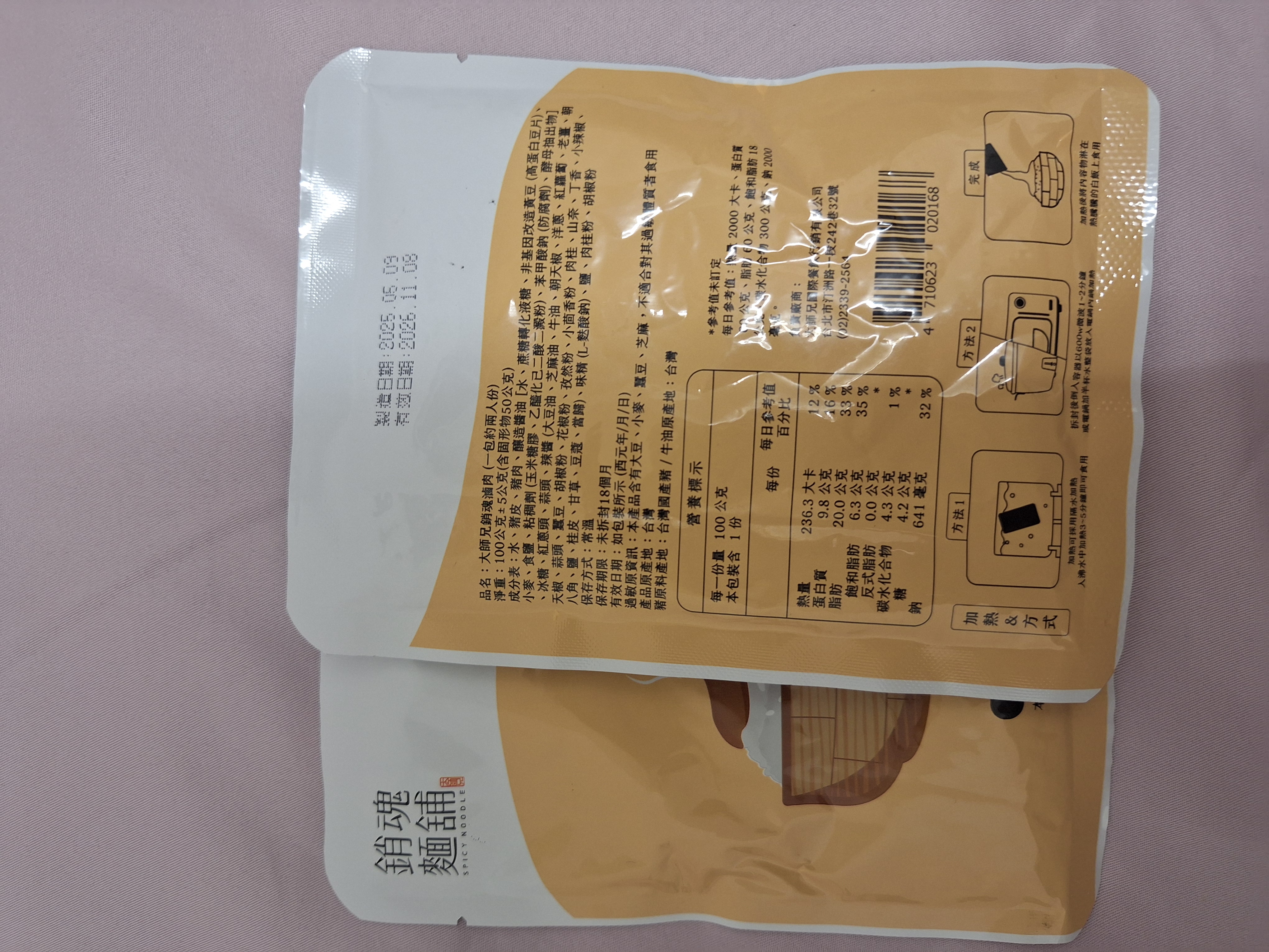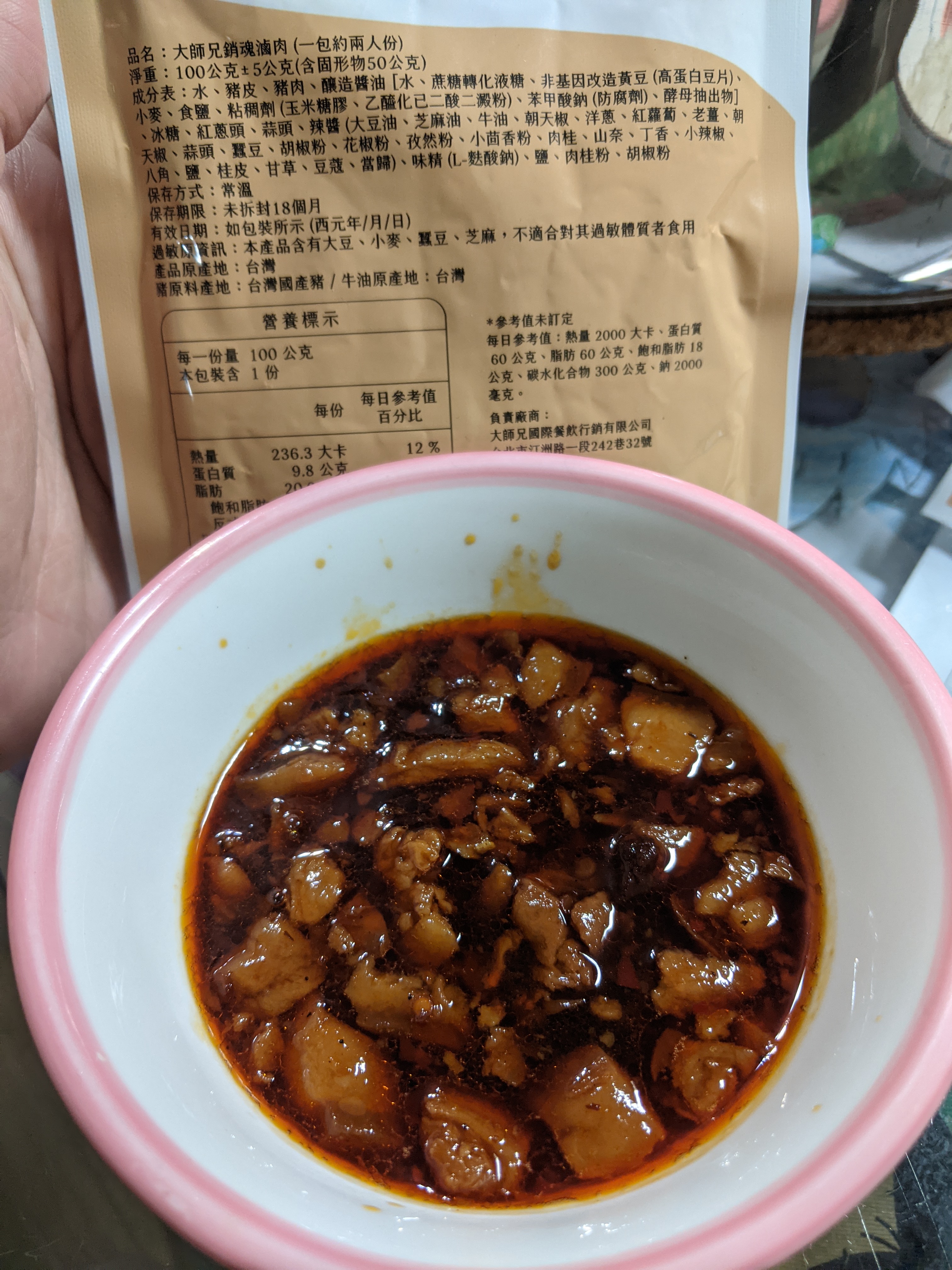 水、豬皮、豬肉、釀造醬油 [水、蔗糖轉化液糖、非基因改造黃豆 (高蛋白豆片)、小麥、食鹽、黏稠劑 (玉米糖膠、乙醯化已二酸二澱粉)、苯甲酸鈉 (防腐劑)、酵母抽出物]、冰糖、紅蔥頭、蒜頭、辣醬 (大豆油、芝麻油、牛油、朝天椒、洋蔥、紅蘿蔔、老薑、朝天椒、蒜頭、蠶豆、胡椒粉、花椒粉、孜然粉、小茴香粉、肉桂、山奈、丁香、小辣椒、八角、鹽、桂皮、甘草、荳蔻、當歸)、味精 (L-麩酸鈉)、鹽、肉桂粉、胡椒粉