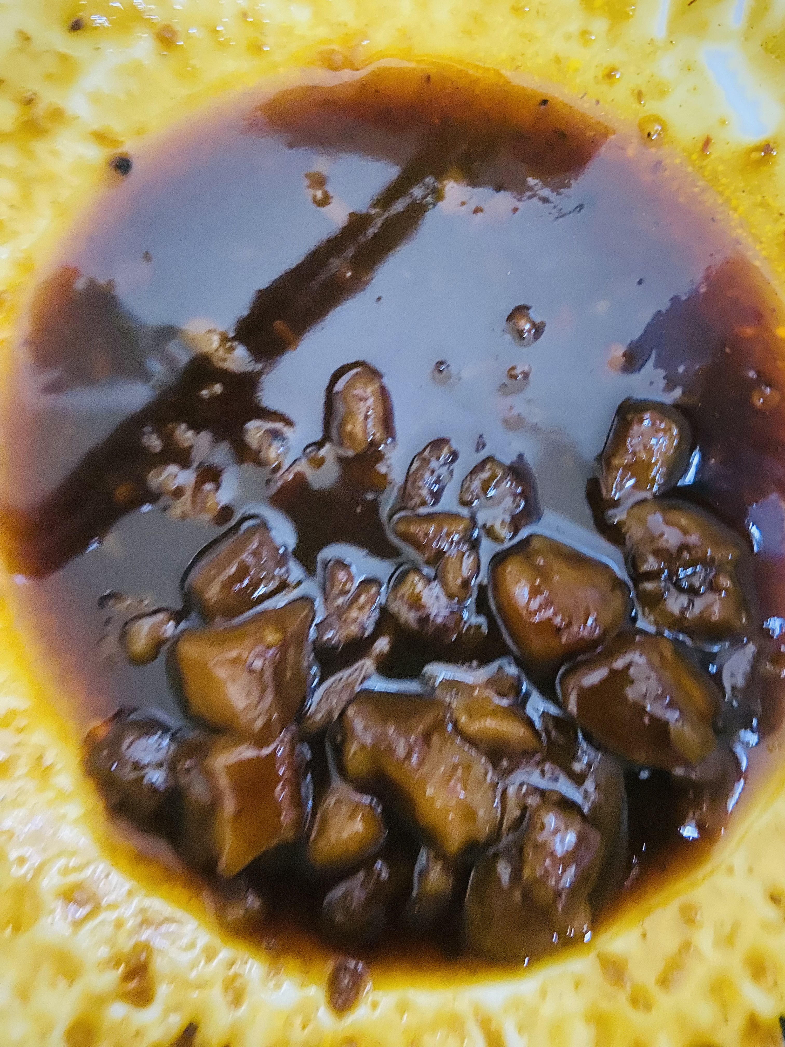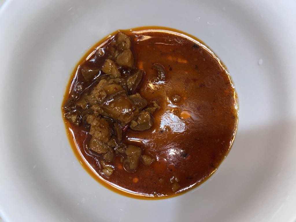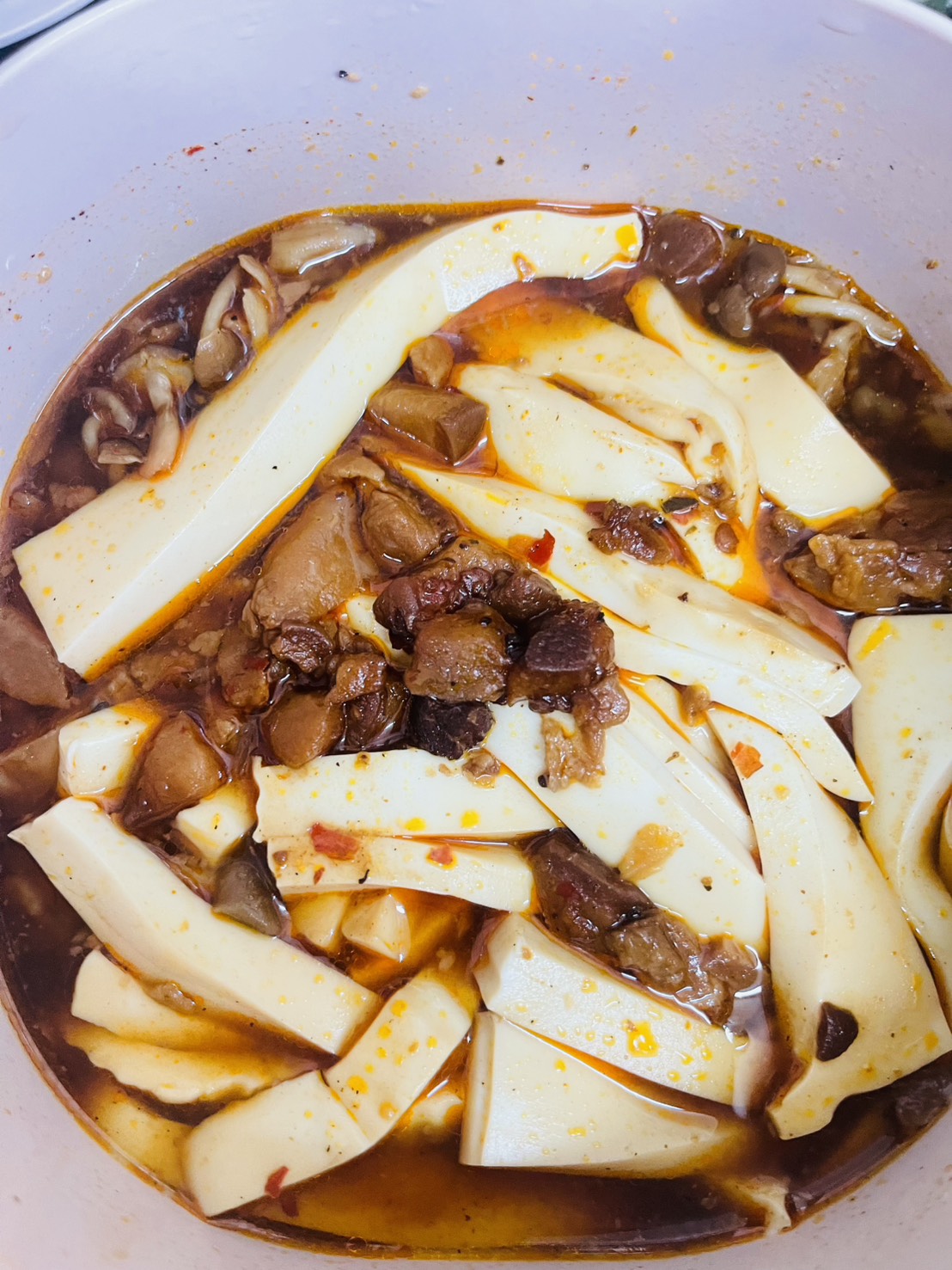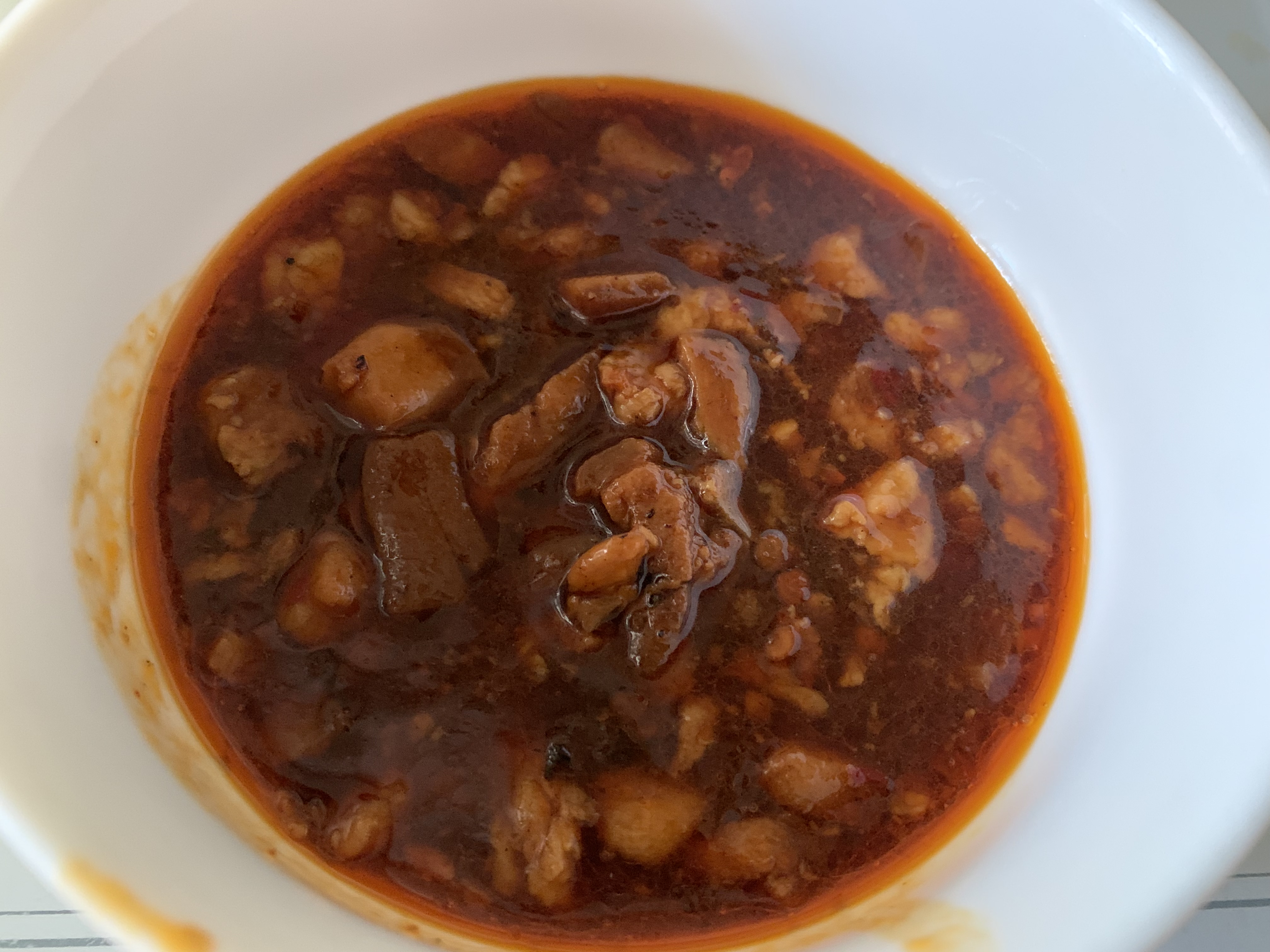 水、豬皮、豬肉、釀造醬油 [水、蔗糖轉化液糖、非基因改造黃豆 (高蛋白豆片)、小麥、食鹽、黏稠劑 (玉米糖膠、乙醯化已二酸二澱粉)、苯甲酸鈉 (防腐劑)、酵母抽出物]、冰糖、紅蔥頭、蒜頭、辣醬 (大豆油、芝麻油、牛油、朝天椒、洋蔥、紅蘿蔔、老薑、朝天椒、蒜頭、蠶豆、胡椒粉、花椒粉、孜然粉、小茴香粉、肉桂、山奈、丁香、小辣椒、八角、鹽、桂皮、甘草、荳蔻、當歸)、味精 (L-麩酸鈉)、鹽、肉桂粉、胡椒粉