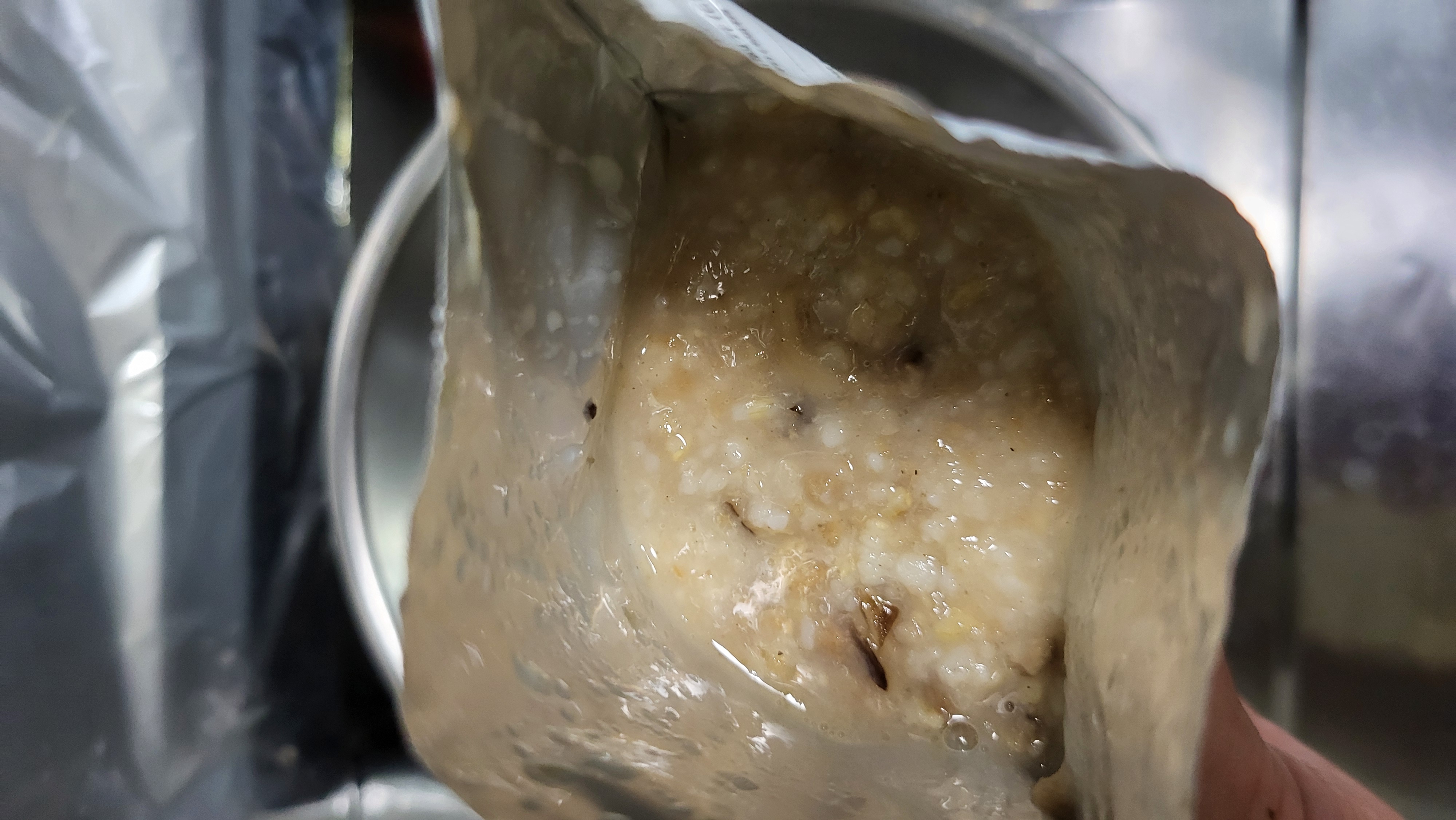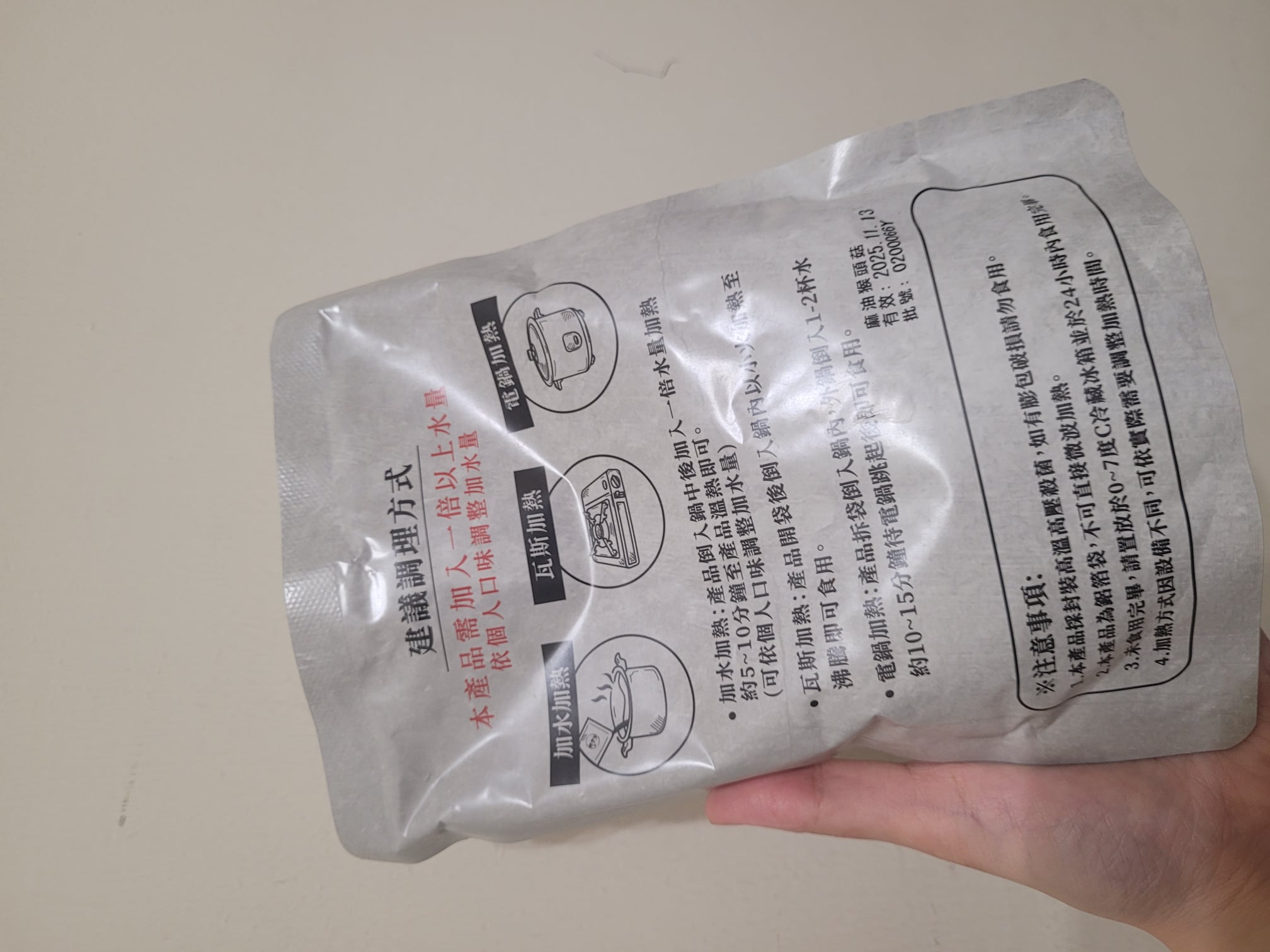 ▲隔水加熱 1.鍋內加水煮沸,將料理包放入沸水中,煮 約7-10分鐘,可依個人喜好斟酌時間。 2.撕開料理包倒在碗內,建議可搭配其他小 菜食用。
