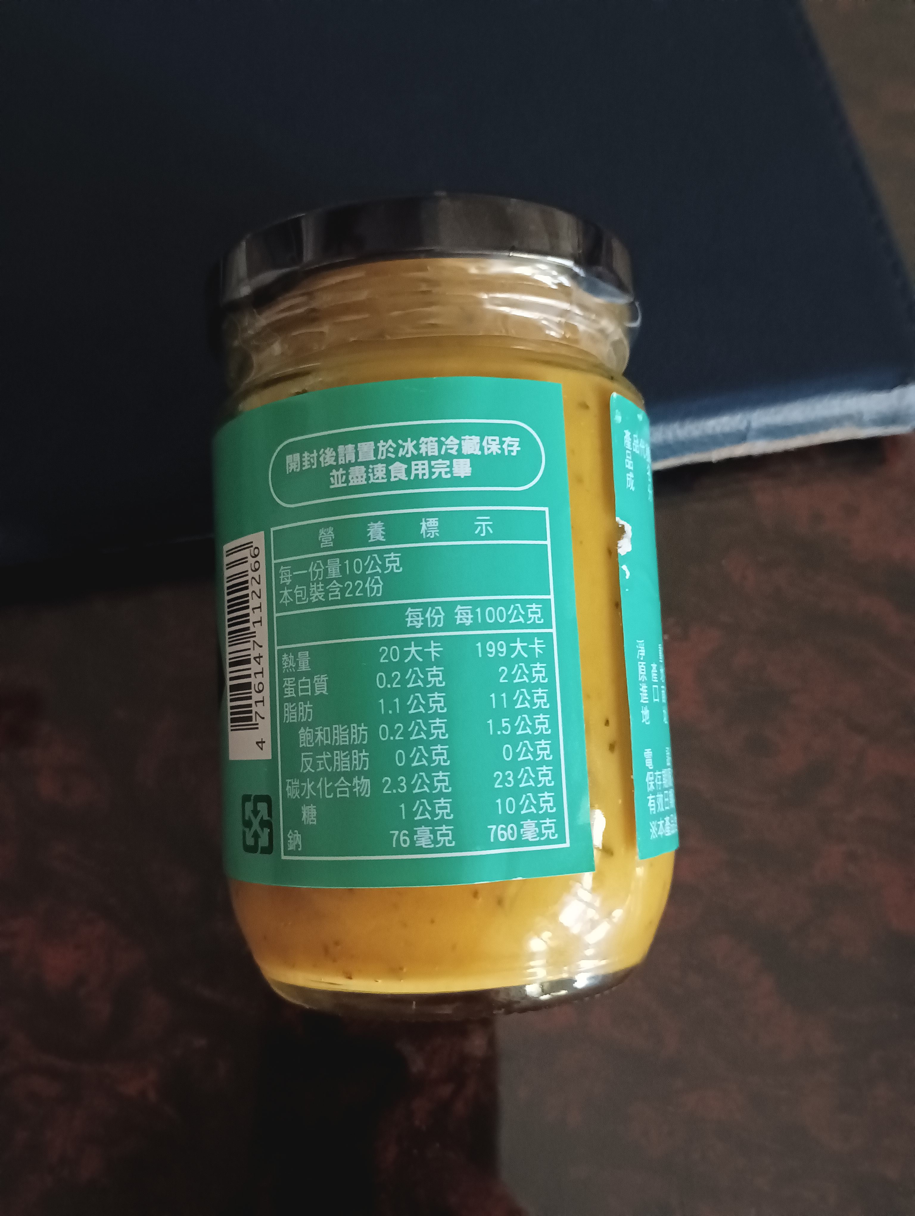 水、大蒜、複方品質改良劑(冰醋酸、磷酸鈣、碳酸鈣)、糖、葵花油、粘稠劑(羥丙基磷酸二澱粉、玉米糖膠)、羅勒、鹽、複方乳化劑(大豆卵磷脂、聚山梨醇酐脂肪酸脂八十)、羅勒香料、著色劑(食用黃色四號、食用黃色五號)
