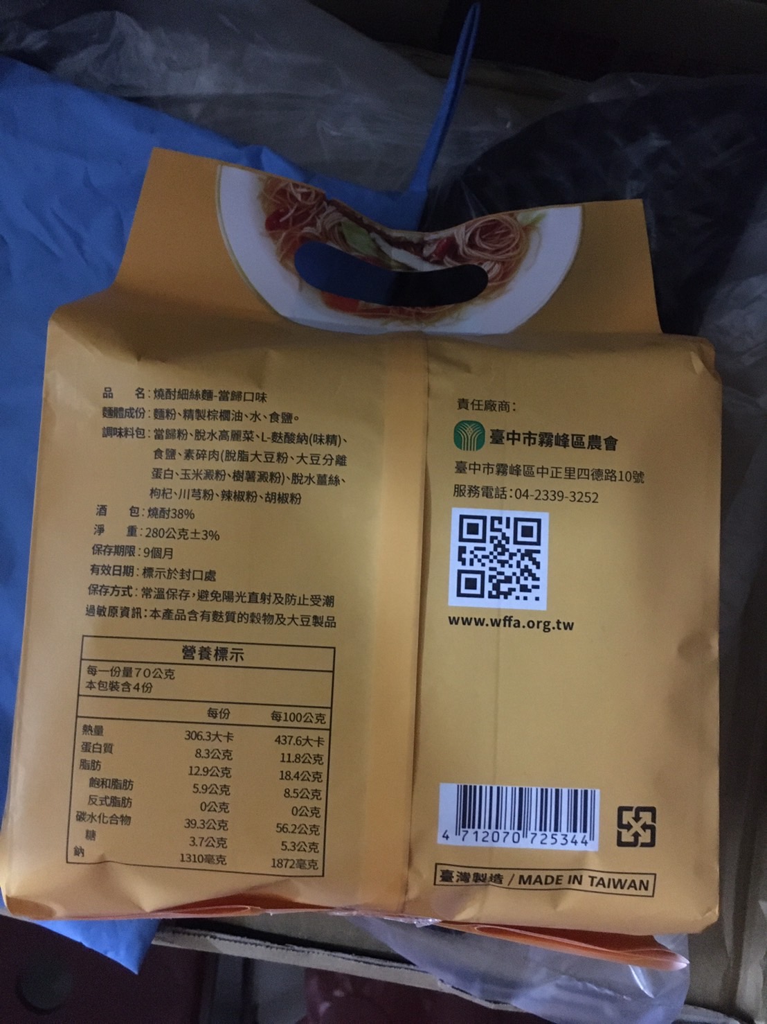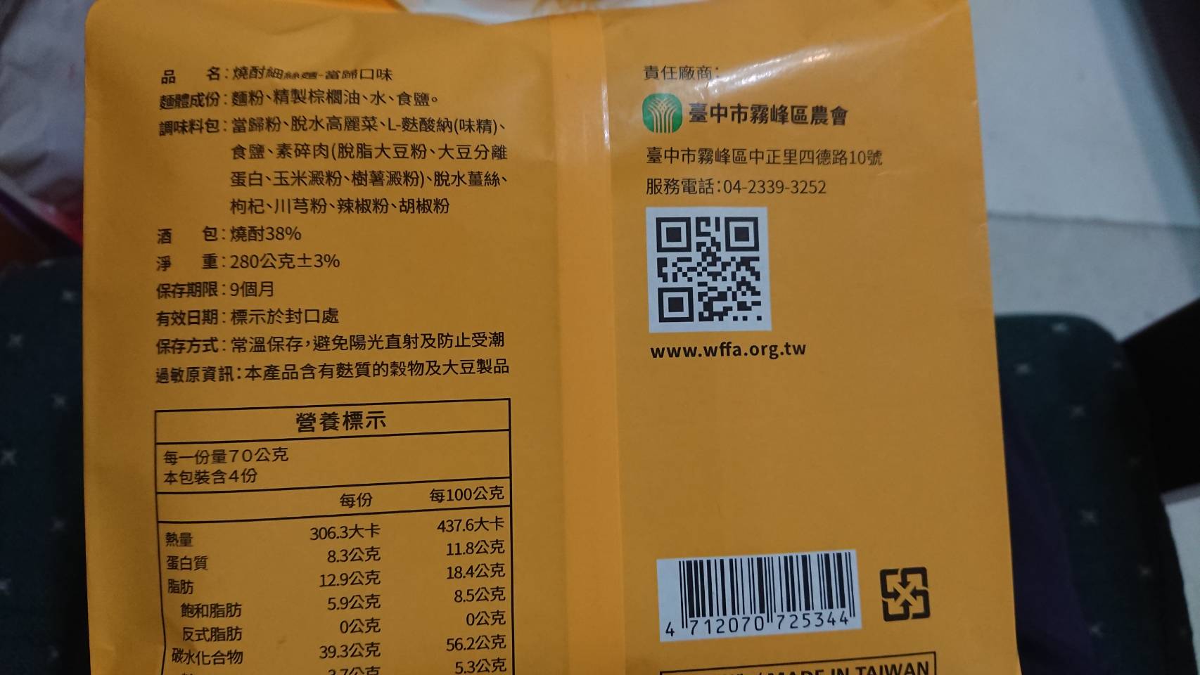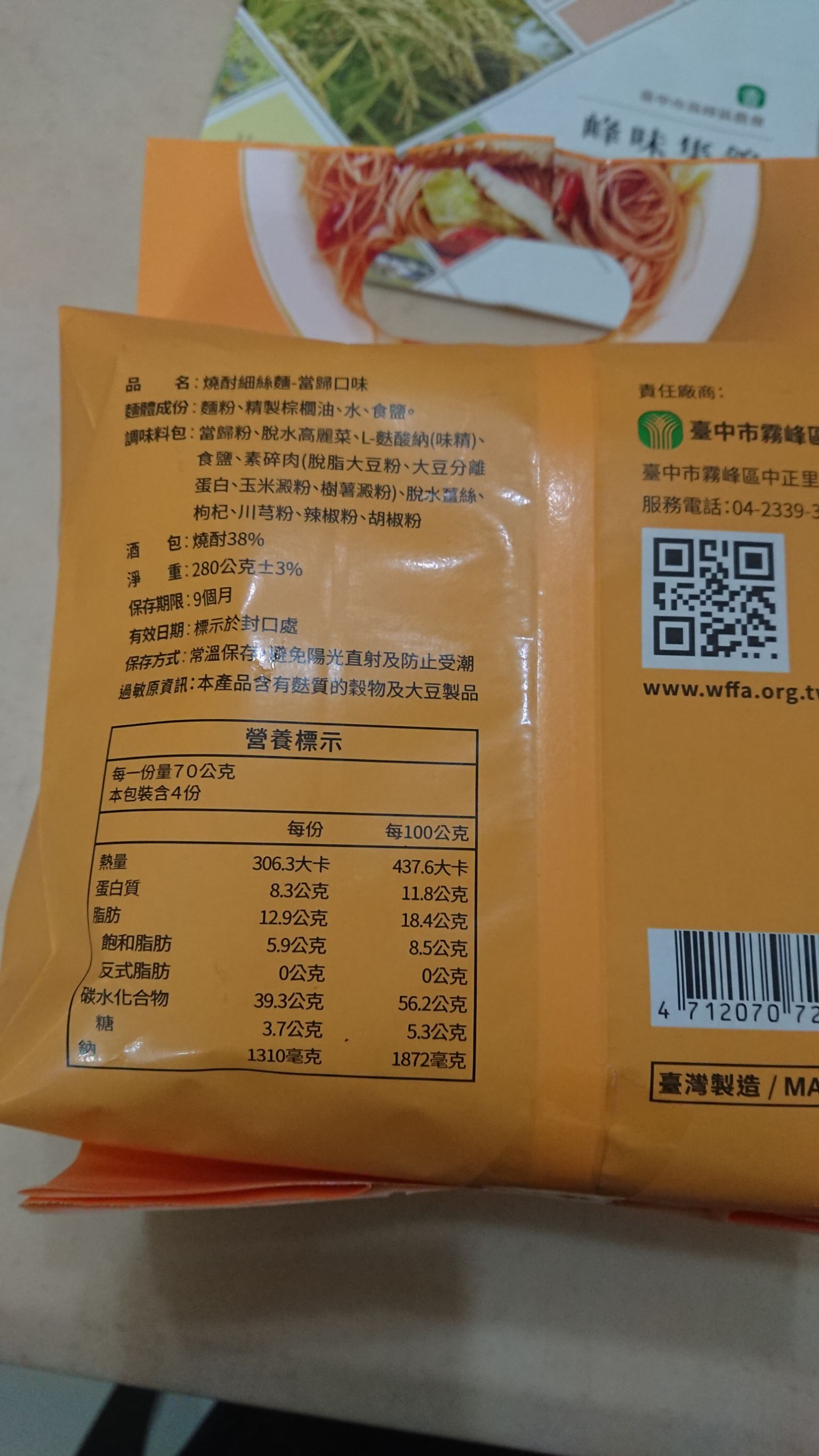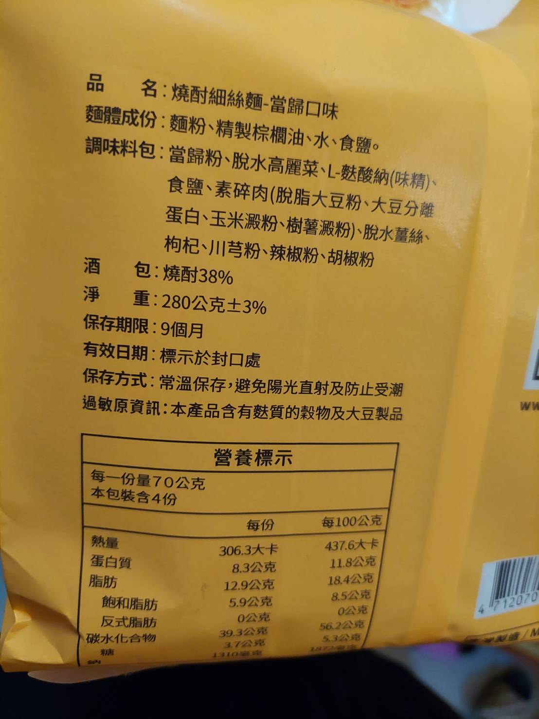 調味料包:當歸粉、脫水高麗菜、L-麩酸鈉、食鹽、素碎肉、脫水薑絲、枸杞、川芎粉、辣椒粉、胡椒粉