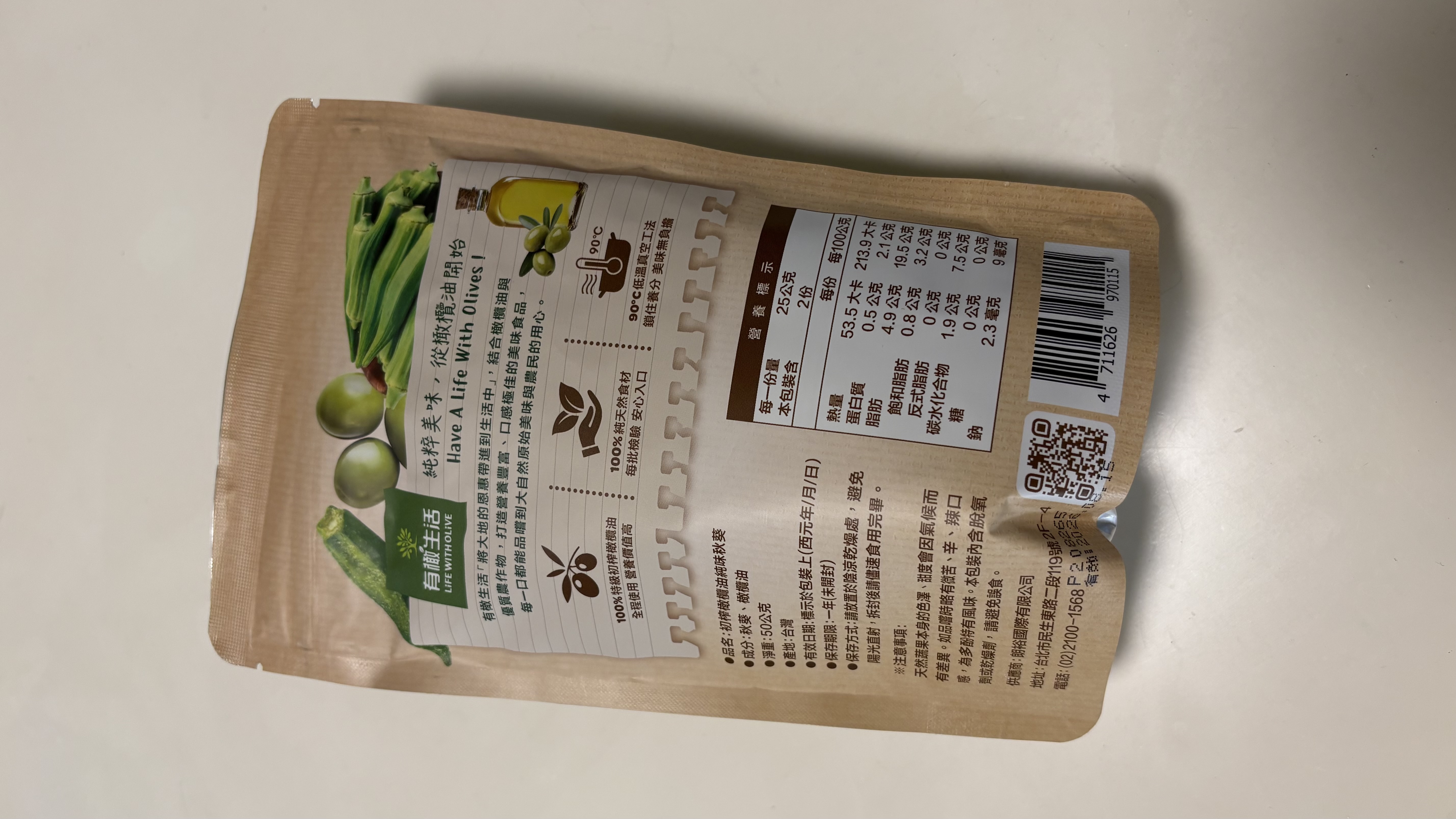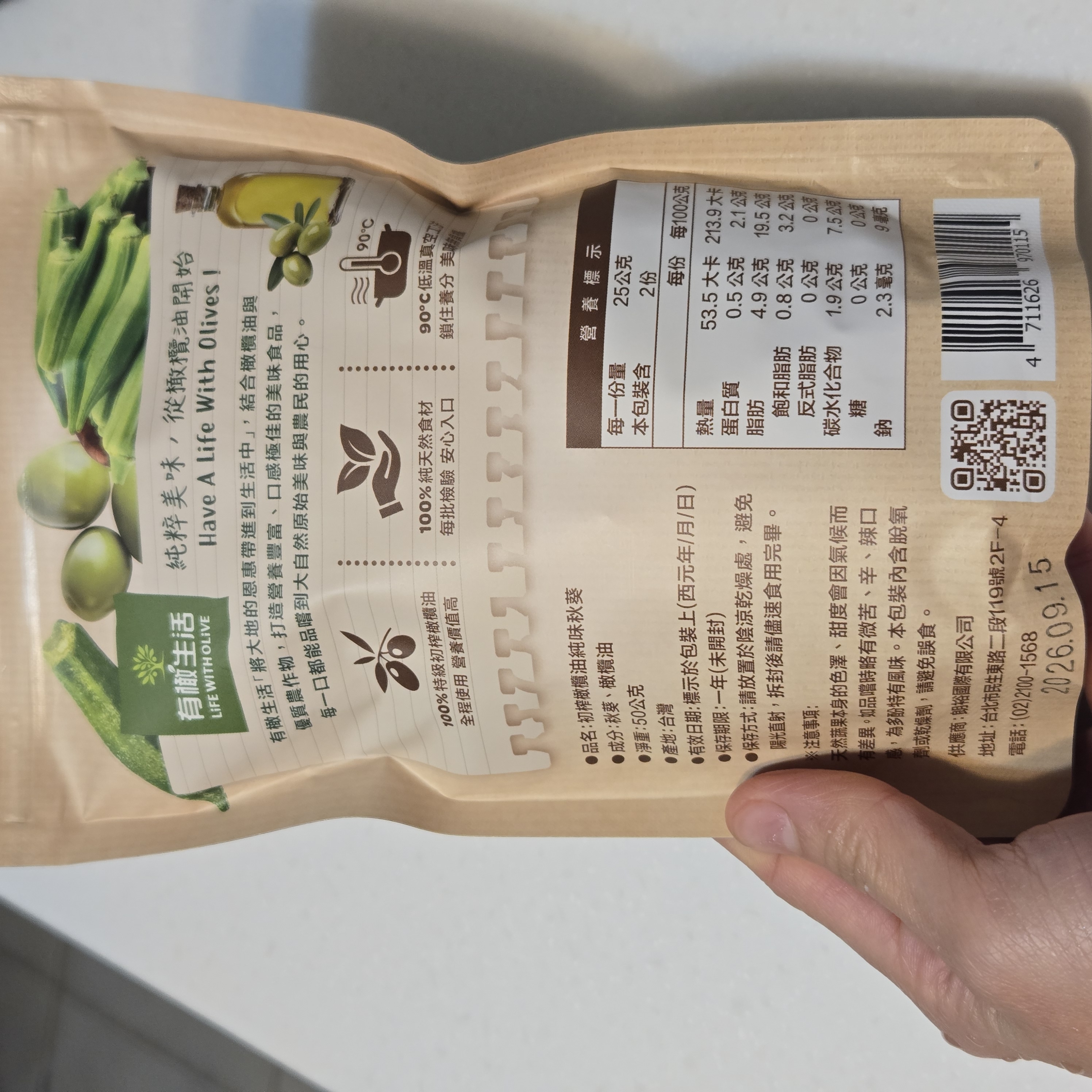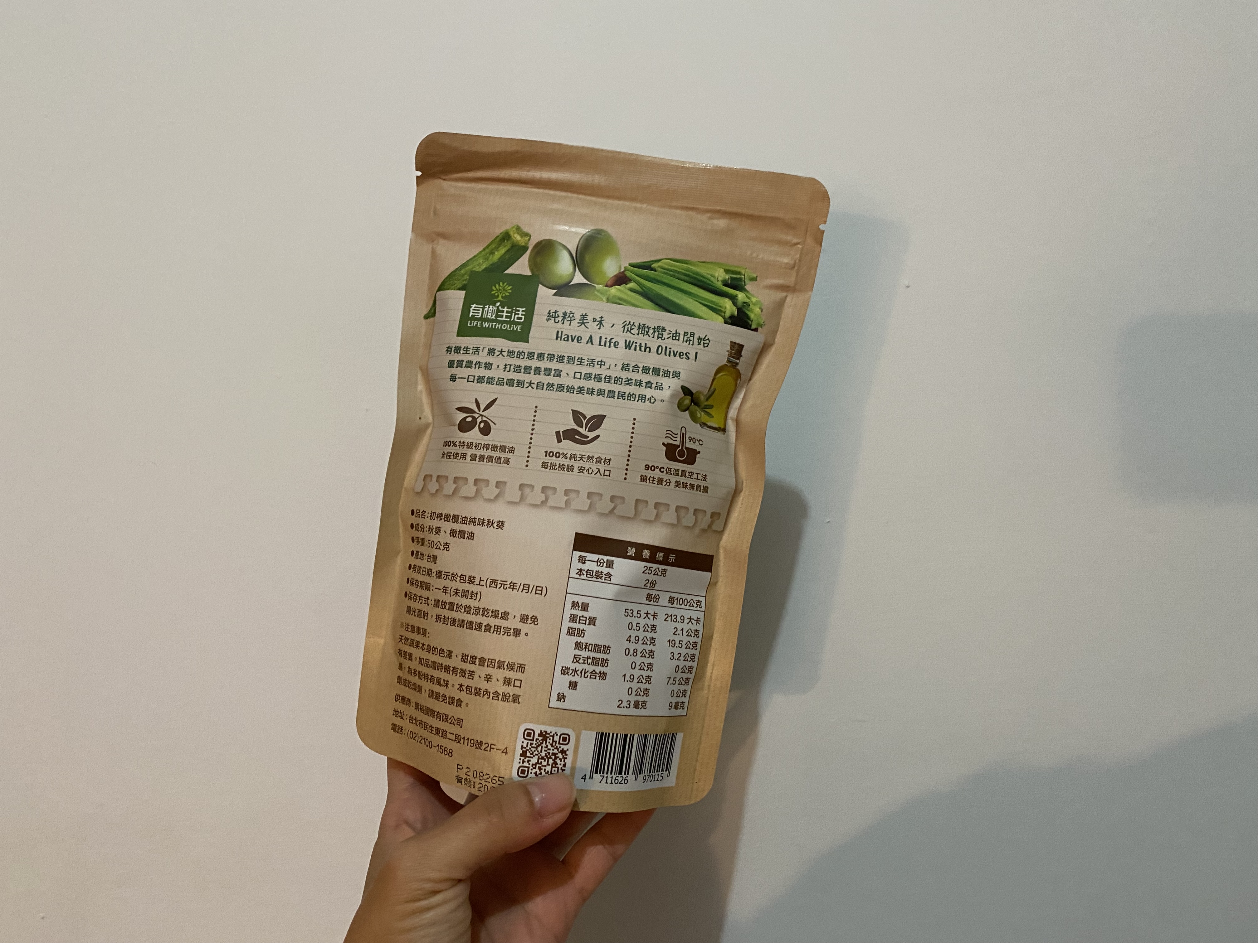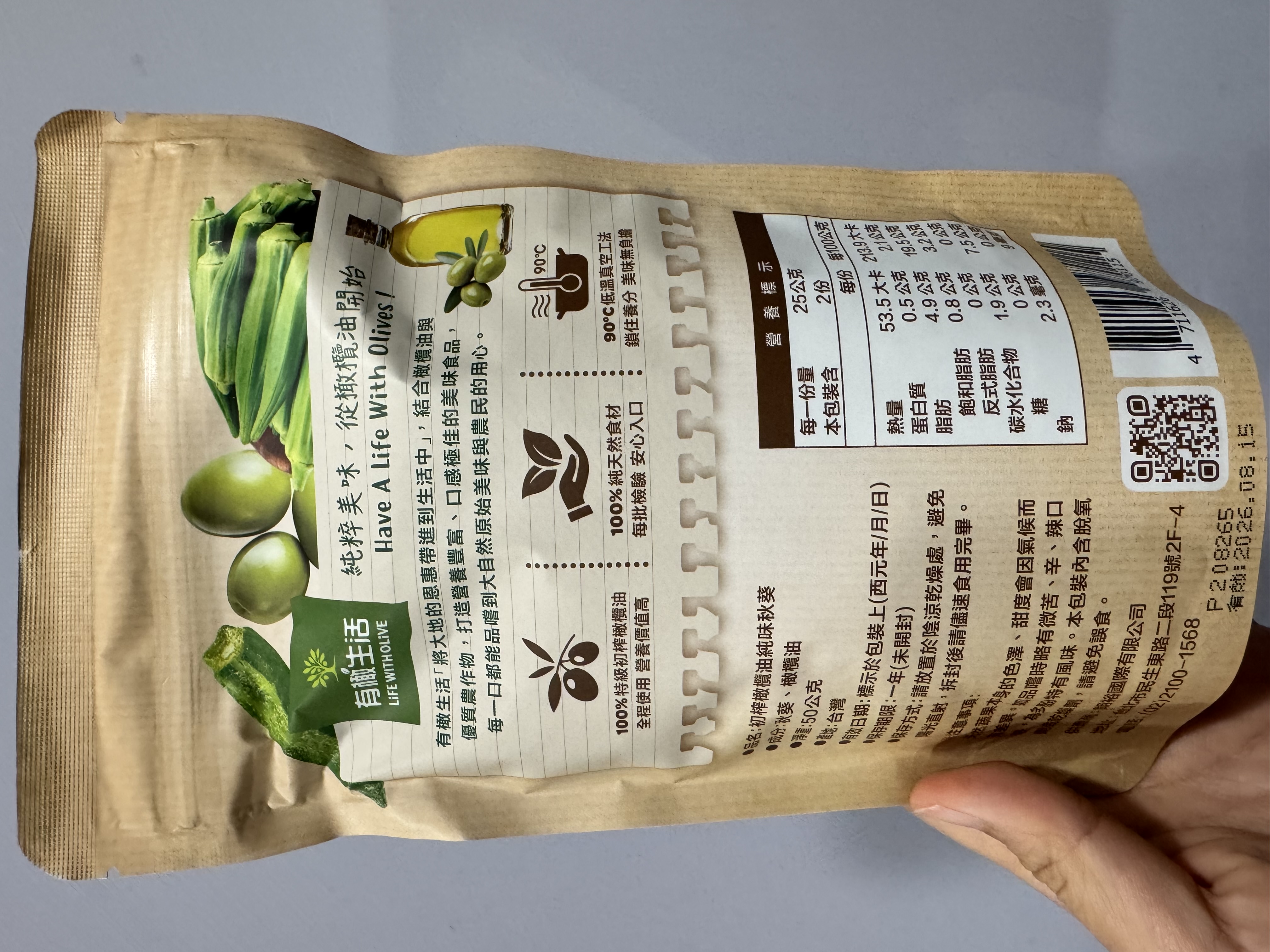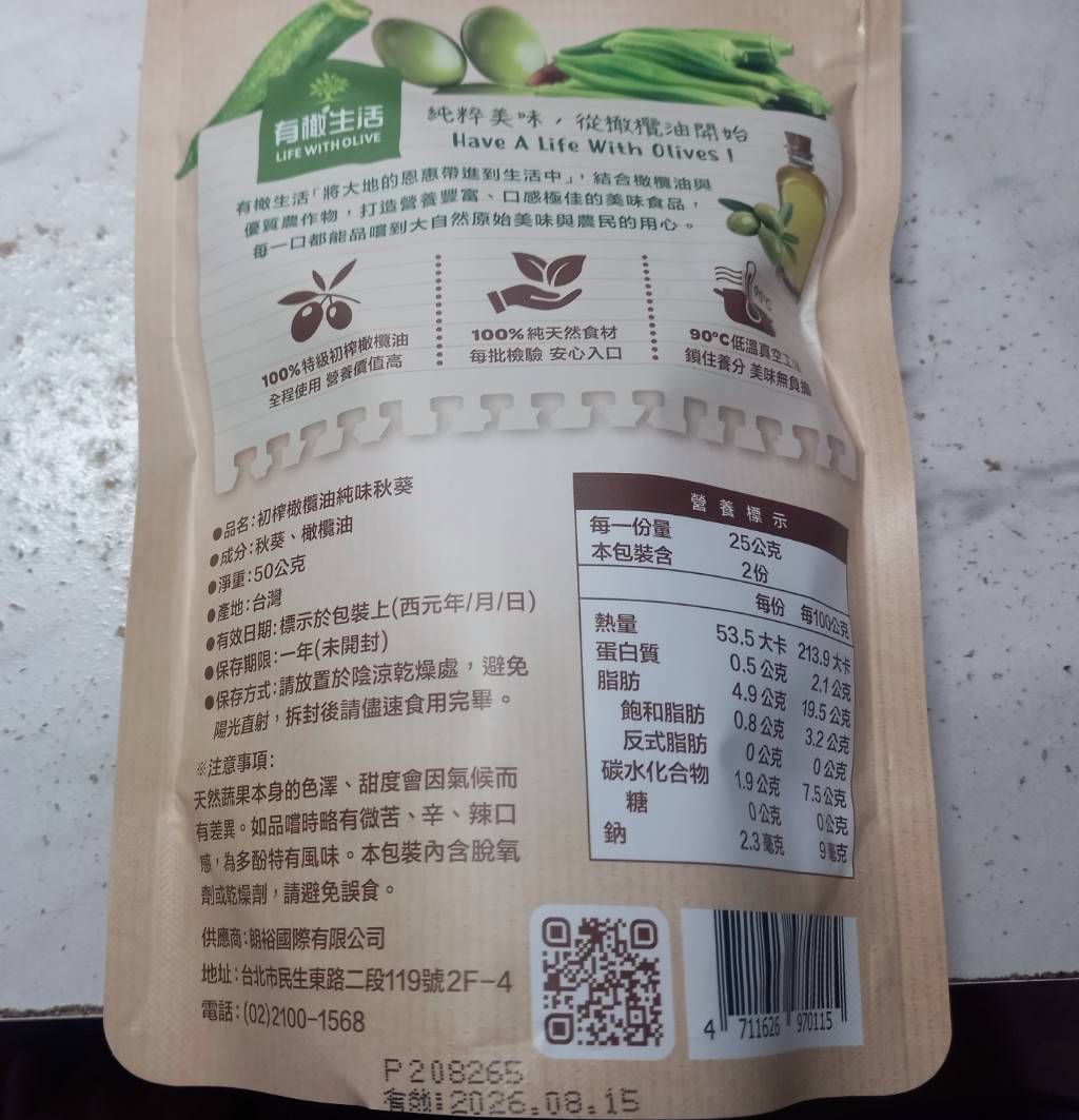 回列表 有橄生活初 榨橄欖油純味秋葵 真材實料零添加,享受無負擔美味! 市價139元 (免費申請) 所需等級 一般會員以上 所需學分 50 體驗份數 15 關注人數 1446 申請人數 250 申請截止 品牌業者:朗裕國際有限公司 負責廠商 朗裕國際有限公司 廠商地址 台北市中山區民生東路二段119號2樓之4 產地 台灣 試用產品規格 50g/包 食品業者登錄字號 A-195455661-00000-9 投保產品責任險字號 新光產物保險股份有限公司 130014AKP0P00094 心得分享 商品介紹 商品成分 使用方法 注意事項 體驗名單 9.1 有橄生活初 榨橄欖油純味秋葵 包裝美學 9.1 口感脆度 9.7 風味鹹度 8.9 涮嘴程度 8.7 建議推薦 9.2 心得分享 13則 蘇泱毓 鑽石達人 26歲 臺北市 2025/11/22 對有橄生活初 榨橄欖油純味秋葵留下評價 10 這次抽中的是「有橄生活 初榨橄欖油純味秋葵」。這個包裝有點忘記是在哪邊看到,好像是有機店,忘記是哪間了。這個品牌我是第一次接觸,甚至一開始不小心看成有趣生活ww有橄生活顧名思義就是橄欖油做的商品為主~一開始會申請秋葵脆是感覺很健康,市售凍乾食品一般會有加一些有的沒的,他們的就只有「秋葵跟橄欖油」,然後就很幸運的中了!評測項目有:包裝美學、口感脆度、風味鹹度、刷嘴程度。包裝美學部分,顏色視覺上跟口味能做連結,英文的字體給人一種高級感,好像真的是有機店會出現的東西。是夾鏈帶包裝,沒有吃完可以封好慢慢吃。不過有一點要說它真的很容易炸ww撕包裝千萬不要太用力,也不要在不能髒的桌面上吃,因為秋葵碎渣會卡在撕口邊緣,撕開難免會噴渣渣哈哈😂~口感脆度有!雖然跟我以前吃的秋葵脆有些不同(我不知道我之前吃的那款為何會有juicy的感覺,它這個感覺蠻正常的)~風味鹹度,這邊先說重口味人應該會覺得很淡。但我特別喜歡吃很原味的食材,因此我很滿意👍🏻!!它沒有過多調味,能吃出秋葵的自帶甜香原味。刷嘴程度要看個人,不過我通常會不自覺吧零食吃完ww整包吃下來不會太鹹膩~小包裝50公克,一個不小心吃光光也沒太大負擔。喔對補充個營養標示,我蠻意外每百克沒有超過300大卡!我認知的凍乾食品,普遍每百克都有超過300大卡,甚至400大卡。原因是密度高,脂肪量也很可觀。但這款只有200多大卡/百克,雖然脂肪還是不少,但已經比想像中低(我以為會有20-30克脂肪),有加橄欖油,吃完手不會油膩。他們家其他凍乾食品熱量沒有這麼漂亮,有可能秋葵不算澱粉類吧ww整體推薦!如果也喜歡這種健康零食的朋朋能試看看~ 蘇素貞 金食達人 58歲 臺北市 2025/11/22 對有橄生活初 榨橄欖油純味秋葵留下評價 10 這是我第一次吃到初榨橄欖油純味秋葵,第一口的酥脆感令人難忘,這真的是秋葵嗎?而且是完整的秋葵,現在的低溫真空油炸技術真的厲害,沒有一點油耗味。而且使用冷壓特級初榨橄欖油,保留食材最佳的營養。打開後,全家人一起來試吃,一下子就吃光了一整包!這個產品的名字叫做「初榨橄欖油純味秋葵」剛開始我還以為是油品的名字呢!「初榨橄欖油純味秋葵」的特色在於成分極其簡單,只有秋葵及橄欖油,這對於食品科系畢業的我,給予極高的評價,有一種回歸自然的純粹享受食物。現在的低溫真空工法,能讓食品美味又有營養,真是太棒了。 Hui 金食達人 27歲 桃園市 2025/11/26 對有橄生活初 榨橄欖油純味秋葵留下評價 10 很榮幸有體驗本產品的機會,家母很喜歡吃秋葵,平常也會燙秋葵來吃,在我們家中算是常見的食材。在我的認知當中,初榨橄欖油、秋葵、無添加,都是健康飲食的代表,故對於這款產品相當感興趣。此款產品外包裝很吸睛,整體配色很大自然,成分很單純,份量還滿多的,都是完整的秋葵,沒有斷裂。這次我第一次吃酥脆感的秋葵,吃起來並不會油油的,也不會脆到刮傷嘴,很清淡,完全是食材的原味!在嘴饞時很適合吃這款不會感到罪惡的小零食,我覺得最酷的地方是,咀嚼到後面會感受到一點秋葵的黏感,這是秋葵的特色,能保將黏感保留到適當程度,我覺得很加分~推薦大家試試看這款健康無負擔又特別的美味小零食! 方秋英 金食達人 67歲 新北市 2025/11/28 對有橄生活初 榨橄欖油純味秋葵留下評價 10 非常開心能夠獲選參與「有橄生活-初榨橄欖油純味秋葵」的試吃體驗活動,這次機會讓喜愛吃秋葵的媽媽和我都特別期待。有橄生活秉持「將大地的恩惠帶進生活中」的信念,採用特級初榨橄欖油與在地優質農產品,製作出健康、純天然、無添加的休閒食品,讓消費者可以輕輕鬆鬆就享受到健康無負擔的零食。此體驗商品是100%橄欖油蔬菜片系列中的秋葵,恰好我和媽媽都很喜歡吃秋葵,一收到包裹就迫不及待開箱試吃,秋葵本身沒有過多加工以及任何調味,低溫真空油炸後,入口有淡淡橄欖油的香氣,少了秋葵特有的黏稠口感,變得十分酥脆,令人驚艷,再自行撒點玫瑰鹽和黑胡椒,連不愛吃秋葵的爸爸也可以接受。唯一缺點大概就是油炸的熱量較高,要控制自己不要一根接一根吃太多(笑) 蔡佳容 金食達人 37歲 臺北市 2025/11/21 對有橄生活初 榨橄欖油純味秋葵留下評價 9 謝謝食力和製造廠商,平時就會留意產品的內容物及添加物,很開心市面上能有願意使用初榨橄欖油、而不是人造奶油或棕梠油的食品,果實油之類好的油脂對人體更友善也更健康。◆包裝:覺得產品外觀設計很漂亮,尤其背後的文字說明字也夠大夠清晰,讓人閱讀更加舒適。◆口味