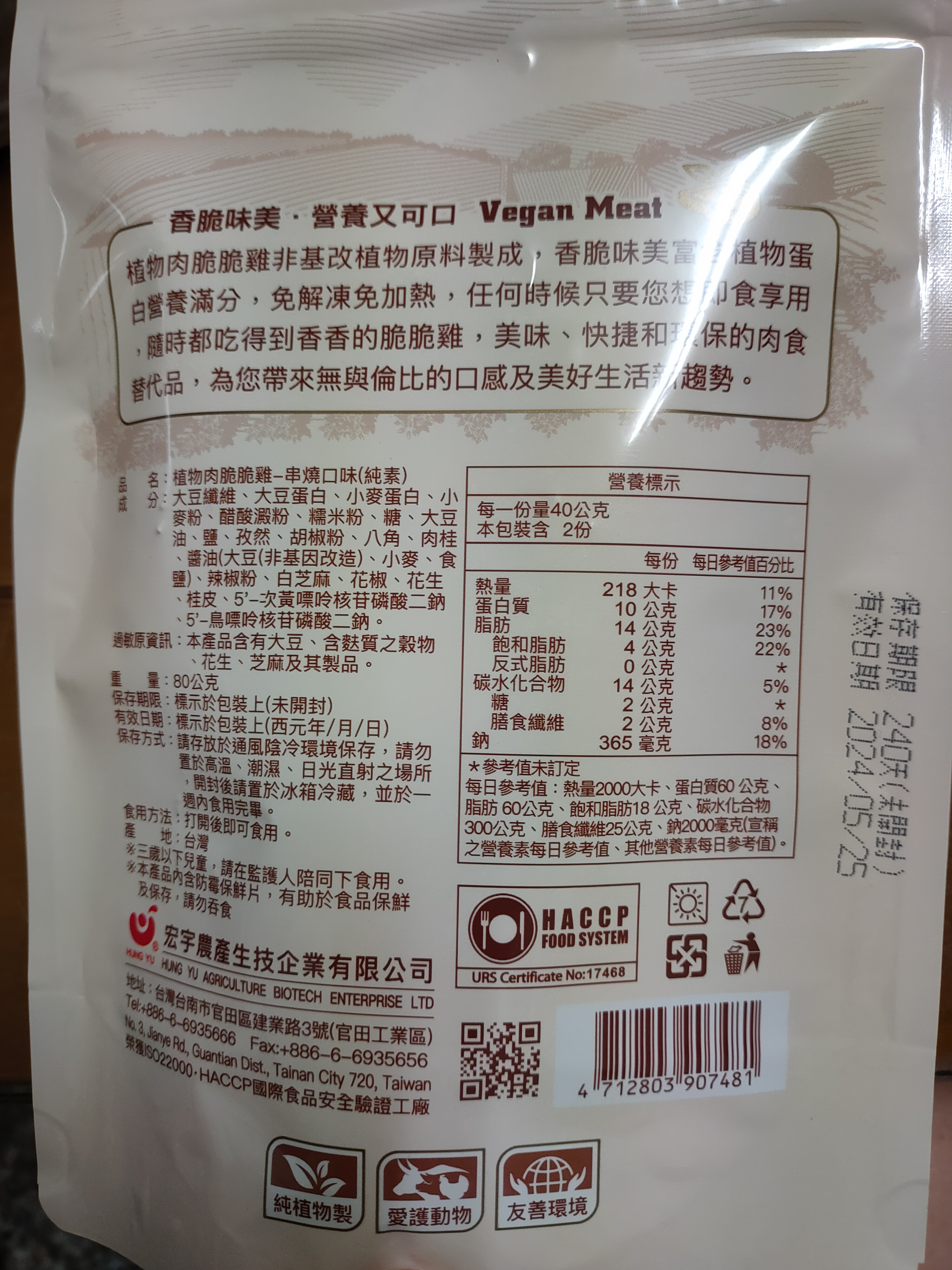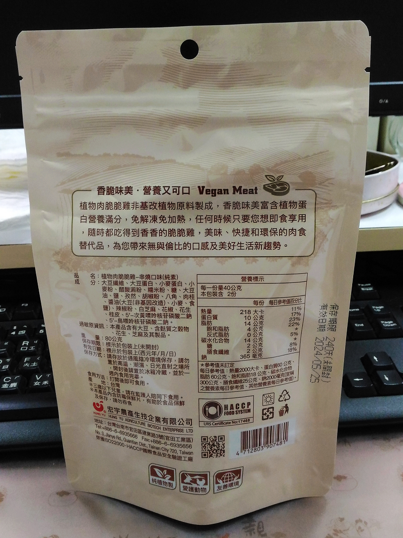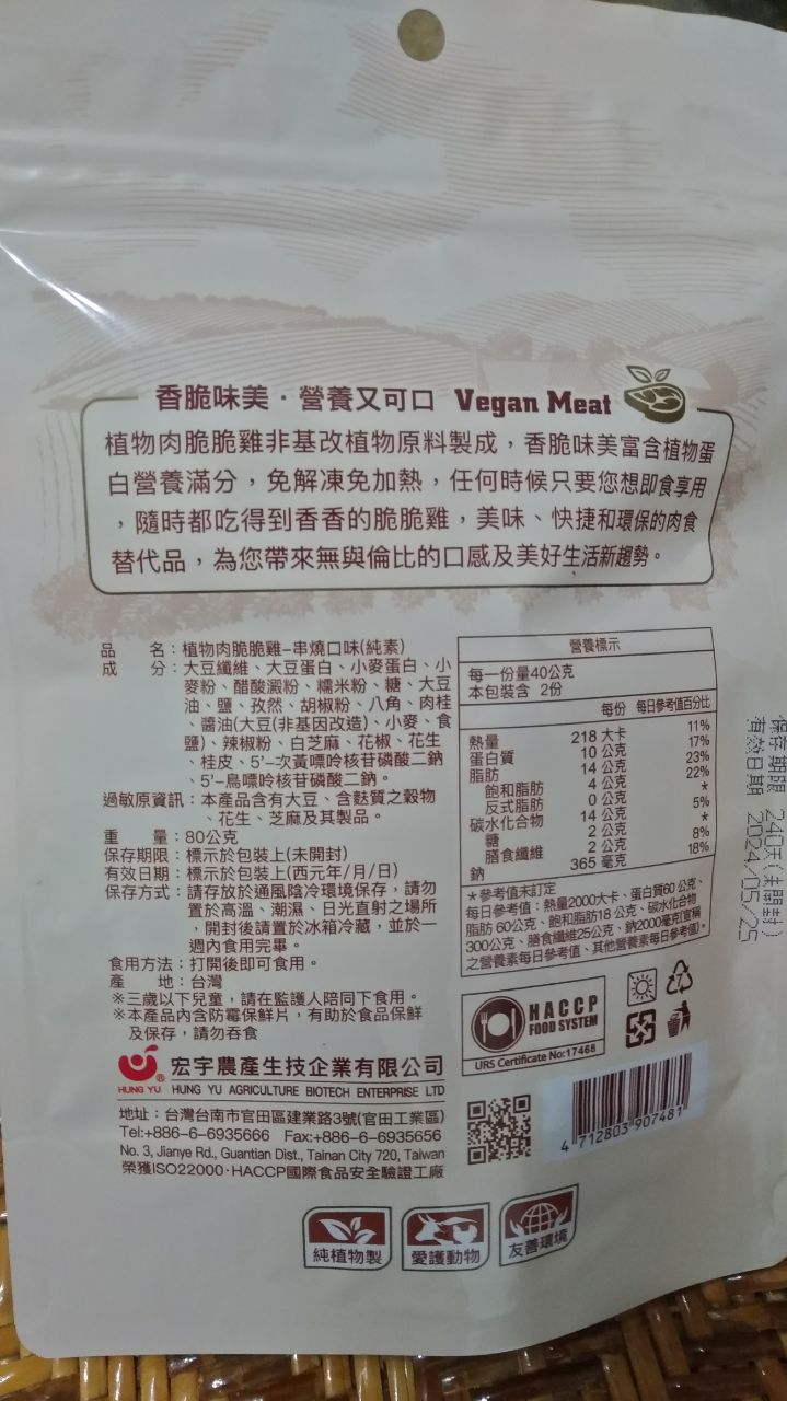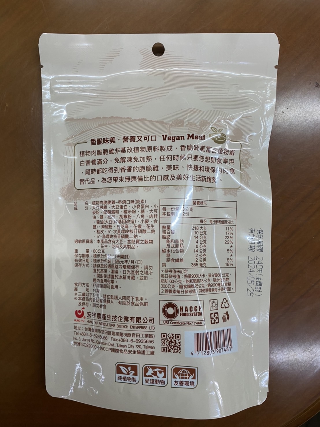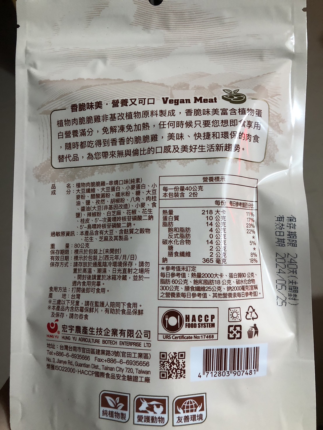 回列表 一番選 植物肉脆脆雞(串燒口味)香脆可口X營養味美 肉食替代品飲食新趨勢 市價125元(免費申請) 所需等級 一般會員以上 所需學分 50 體驗份數 15 關注人數 1361 申請人數 252 申請截止 品牌業者:宏宇一番選 負責廠商 宏宇農產生技企業有限公司 廠商地址 72046 台南市官田區建業路3號 產地 台灣 試用產品規格 80g/包 食品業者登錄字號 F-127900623-00000-2 投保產品責任險字號 心得分享 商品介紹 商品成分 使用方法 注意事項 體驗名單 8.1 一番選 植物肉脆脆雞(串燒口味) 串燒香氣 7.8 酥脆口感 8.2 順口唰嘴 7.8 方便攜帶 9.2 建議推薦 8.1 心得分享 13則 林益詠 鑽石達人 36歲 臺中市 2023/10/13 對一番選 植物肉脆脆雞(串燒口味)留下評價 10 我對植物肉脆脆雞-串燒口味的印象深刻,這款美味的純素選擇不僅為人們的味蕾提供了一場香脆的盛宴,還為人們的健康和地球環保有幫助。這些小塊的美味,每一口都充滿植物蛋白質,不僅味道出色,而且營養滿分,完全無需解凍或加熱,您隨時都能品嘗到熟悉的串燒口味,味道真是香氣滿分,尤其是胡椒的香氣讓人一吃再吃,再配上茶或咖啡就是一場完美的下午茶饗宴。這真的是肉食替代品的極致享受,讓您擁有無與倫比的口感跟美好生活。最重要的是,植物肉脆脆雞-串燒口味採用新鮮原料,不含任何人工色素、防腐劑或糖精。吃得開心,也吃得安心!每個80克的包裝都包含了豐富的大豆蛋白、小麥蛋白,以及串燒口味的各種香料,保證您的味蕾舞動不已。最重要的是,這款美食是純素友善的,適合各種飲食喜好。不要錯過這個機會,品味植物肉脆脆雞-串燒口味,為您的味蕾帶來一場不可思議的美味之旅。您的胃和地球都會感謝您選擇這款美味的素食選擇。 何采彤 金食達人 38歲 彰化縣 2023/10/19 對一番選 植物肉脆脆雞(串燒口味)留下評價 10 (一番選 植物肉脆脆雞串燒口味)包裝輕巧放近包包帶著走,好方便,吃起來脆脆的帶點硬~吃起來口感像塩酥雞很香,還有胡椒香氣,很搭,一點都不像植物製成的,很像吃真的雞肉一樣!素食者可以吃的塩酥雞,還能口饞時來幾顆,還不錯吃,去旅遊可裝進包裡想吃就有!! 林冠宇 金食達人 35歲 屏東縣 2023/10/17 對一番選 植物肉脆脆雞(串燒口味)留下評價 7 本次試吃串燒植物肉,口感酥脆且扎實,聞起來香氣足夠,但是孜然的調味過重,無法吃下太多. 或許香料調味及瑋運的延續性可以加深,咬到後期植物澱粉的味道會出現,使得消費者會把既定印象停留在素食者族群上,無法讓吃葷的民眾想嘗試,小朋友試吃結果因為孜然調味粉未到過農無法接受,或許配方再加以調整會改善許多. 林子傑 金食達人 29歲 新北市 2023/10/18 對一番選 植物肉脆脆雞(串燒口味)留下評價 9 素食脆雞零食是市面上不常見的零食,所以就很期待可以嘗試看看味道。一打開包裝就有濃濃的八角味道及常見的素食辛香料,味道是好的。口感方面,一入口是外層有點硬,但經過口水潤過後,咬下去就是非常酥脆,不會是硬的狀態,很好咬風味部分大概有60%~70%的葷食鹹酥雞味,有點驚人。整體來說很推薦,不管是葷食還是素食族群的朋友吃 鄭世昌 鑽石達人 55歲 臺中市 2023/10/18 對一番選 植物肉脆脆雞(串燒口味)留下評價 8 這種植物肉的產品,我打開包裝吃了之後,口感覺得有點硬,小孩也覺得太硬,但味道很濃香,後來我把它和粥一起混吃,它有變軟一些,比較好吃下去,之後又和冰涼無糖綠茶一起食用,味道很好,但口感還是有點硬,希望以後產品能像豆干那種軟硬適中的感覺。 劉貴鈴 金食達人 45歲 新北市 2023/10/20 對一番選 植物肉脆脆雞(串燒口味)留下評價 9 很榮幸入選「一番選 植物肉脆脆雞(串燒口味)」開封即食~吃過很多款植物肉製品,這款真的蠻特別的,如果不是「食力」這個平台,我還不知道有這款零食呢脆脆雞,真的有脆,而且比想像中的還要硬脆,很適合跟朋友聊天聚會的小零嘴,地位大概就跟吃花生、啃瓜子一樣,都是聚會小聊的好夥伴~吃起來是硬脆版的鹹酥雞,很香而且非常的唰嘴,會一口接一口停不下來,但牙口不好的人就不要輕易嚐試了,哈~ 張佑安(yuanchang) 鑽石達人 63歲 臺中市 2023/10/14 對一番選 植物肉脆脆雞(串燒口味)留下評價 8 以植物性蛋白質為基礎製成的仿肉串燒,這是為了提供素食者或減少肉類消費的人們一種替代選擇。其好處是可以使用各種植物蛋白質來製作,如大豆、豆腐、豆粉、腰果等,因此可以製作出多種口味和質地,滿足不同人的口味需求。植物肉串燒口味在環保、健康和道德層面具有許多優勢,但也需要在營養均衡和過敏風險等方面進行注意。選擇是否食用植物肉應該根據個人的偏好、價值觀和健康需求進行考慮。個人認為口味比較重,較無法刷嘴。然喜歡重口味者可能喜歡喔! 曾詠青 金食達人 45歲 高雄市 2023/10/16 對一番選 植物肉脆脆雞(串燒口味)留下評價 8 收到試用的產品還蠻開心的,因為植物肉是比較新穎特別的食材,一直都還沒有嘗試過。打開之後,可能是孜然的香氣有點嗆嗆的,產品已經都處理成一小塊,容易入口。入口覺得有點硬,但不難咬碎。一入口,口味有點偏鹹,但慢慢會有一個香氣出來,整體而言還不錯,但味道較重的關係,比較難以一口接一口,容易淺嚐即止。 HoYun 金食達人 61歲 新竹市 2023/10/17 對一番選 植物肉脆脆雞(串燒口味)留下評價 8 112/10/17試吃由宏宇一番選提供的【植物肉脆脆雞(串燒口