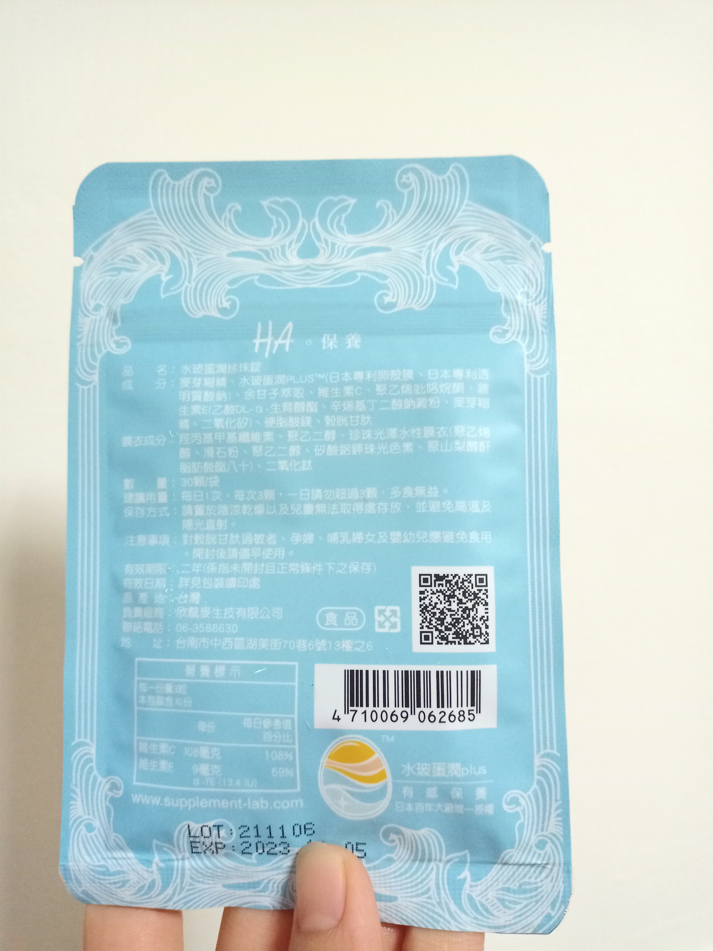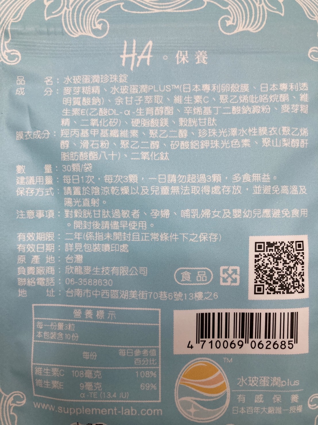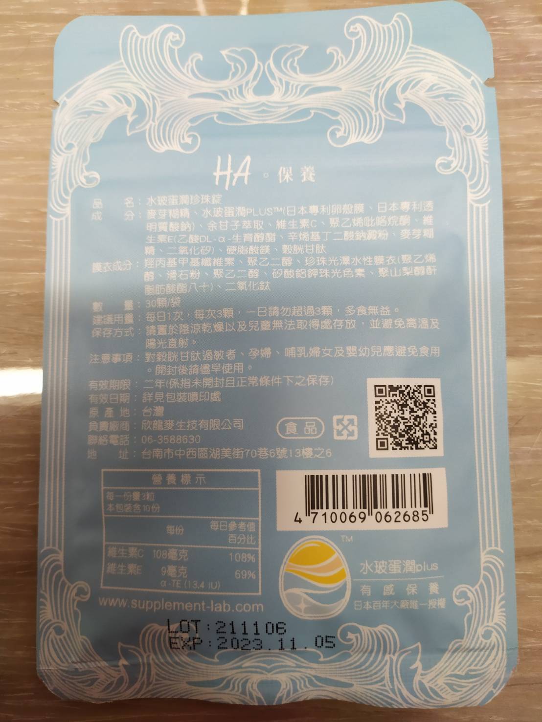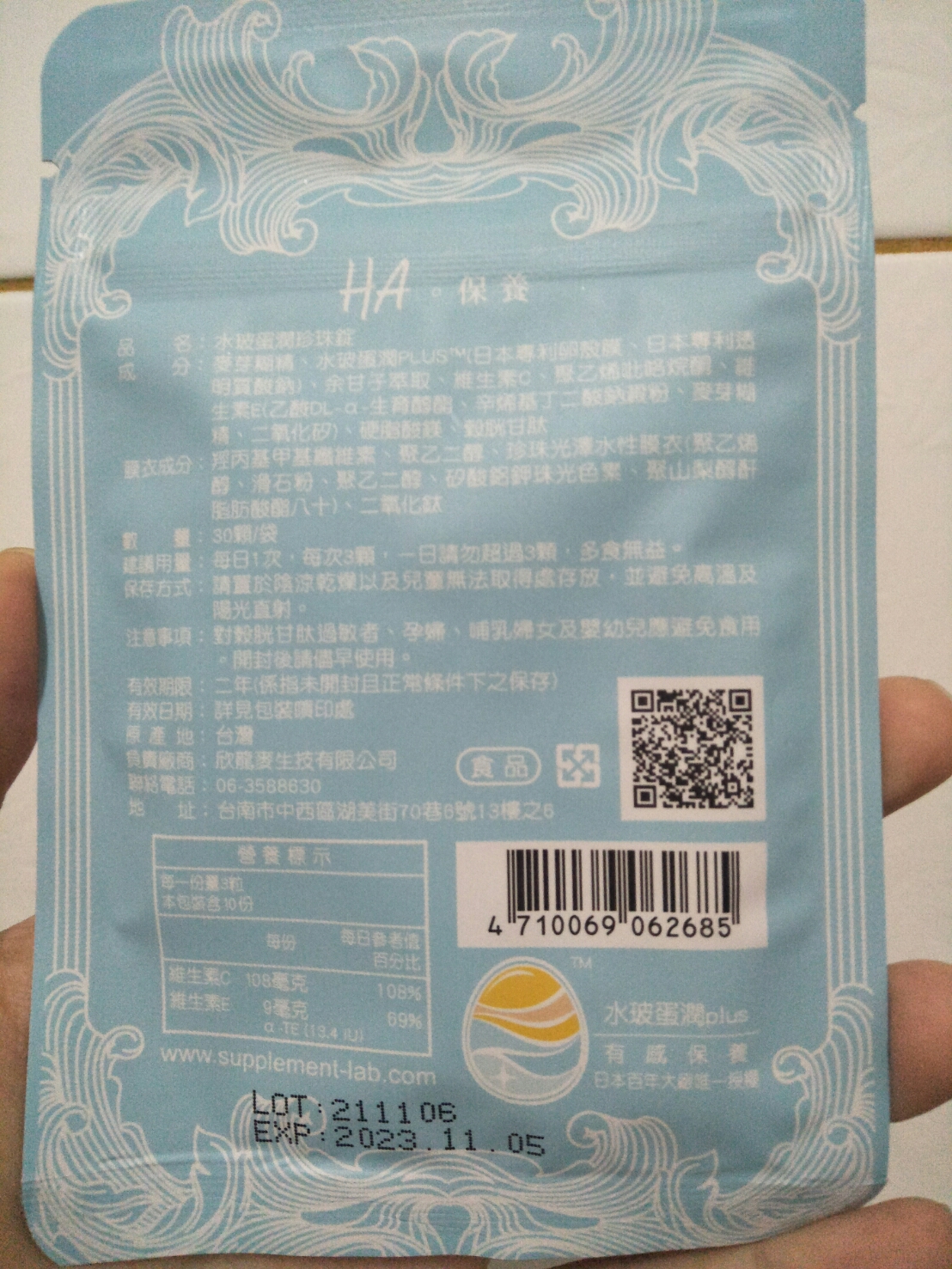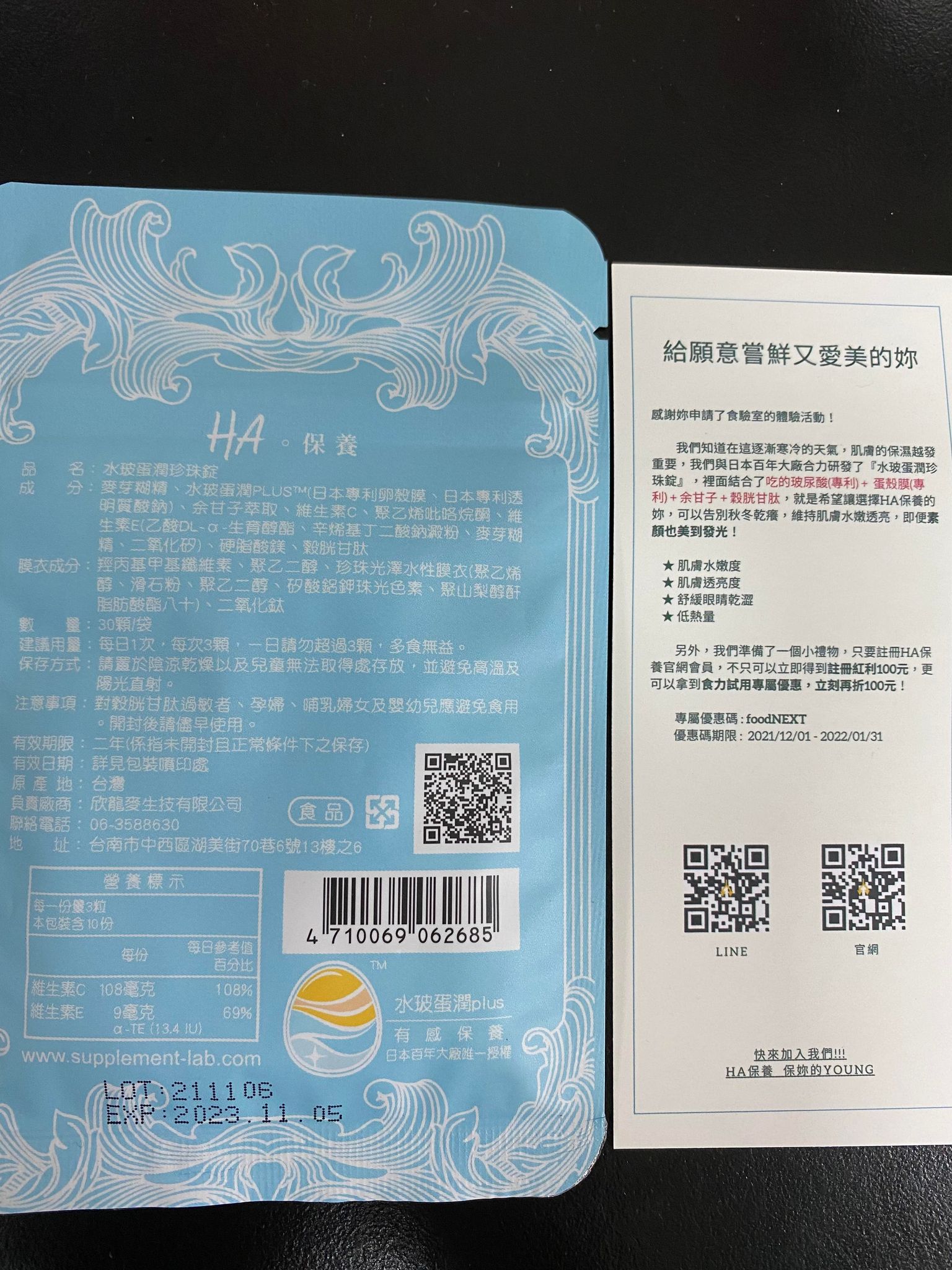 回列表 HA。保養 水玻蛋潤珍珠錠 告別暗沉、透亮再現 500元/袋 所需等級 一般會員以上 所需學分 30 體驗份數 100 關注人數 1676 申請人數 299 申請截止 立即購買 品牌業者:欣龍麥生技有限公司 負責廠商 欣龍麥生技有限公司 廠商地址 臺南市中西區湖美街70巷6號13樓之6 產地 臺灣 試用產品規格 30顆/袋,每日一次,一次三顆,十天份 食品業者登錄字號 D-191116493-00000-5 心得分享 商品介紹 商品成分 使用方法 注意事項 體驗名單 8.2 HA。保養 水玻蛋潤珍珠錠 想要養顏美容 8.3 輕鬆入口 8.8 品質信任 8.2 美學設計 8.5 建議推薦 8.0 心得分享 90則 李庭 金食達人 33歲 臺北市 2021/11/21 對HA。保養 水玻蛋潤珍珠錠留下評價 10 讓我先自首一下,對於各種貼心小語真的是無法抵抗,拆開包裝盒後除了柔和的配色非常吸睛,就是他附上的小卡【be a star for your life】直接入坑! 看看他的成分,【穀胱甘肽】、【維生素C】,因為之前短暫接觸過相關產業,知道多補充是可以達到美白效果,一白遮三醜,身為女生的我很是需要吶~如果聽起來很可疑,有一句老話說,睡飽睡好就會變漂亮,其實是增加代謝率,跟穀胱甘肽功效-幫助睡眠、抗氧化、提高代謝,這樣聽起來能讓人信服了吧!另外,他採用夾鏈袋封口,可以避免潮濕、掉出的風險,還可以重複使用,非常貼心耶,老實說,剛收到的時候一度卡關在夾鏈的部分,差點直接剪掉哩~保養品是需要長時間使用的,找到一個合你眼又安心的產品是很重要的:) 一起成為透亮自信、甩掉濾鏡的女孩吧! 黑貓 金食達人 37歲 臺北市 2021/11/20 對HA。保養 水玻蛋潤珍珠錠留下評價 9 包裝很美,是水藍色很清爽,放在包包裡拿出來吃也不會被當成吃保健食品,在辦公室吃也不尷尬。產品圓圓的還有珍珠光澤,超級喜歡,像是真的吃珍珠,需要配溫開水吞服,聞起來沒有味道,但不建議咬碎,會有一點藥味(笑),整體很喜歡。整包30顆,可以吃10天,不會有負擔,期待煥然一新的自己。 期果威 金食達人 29歲 臺北市 2021/11/20 對HA。保養 水玻蛋潤珍珠錠留下評價 9 會試用幾乎都是因為想要養顏美容吧!包裝外觀很精緻也偏日系,賞心悅目到不小心忘記先拍照就拆封~錠劑本身輕鬆好入口,最令人驚喜的部分是沒有任何特殊氣味!不過一天竟然要服用到三顆覺得有點太多,很像老人家服藥多種。且必須承認因為相關數據提供較少,還有一個美白有效成分寫在成分表最後面(這是表示含量很稀少吧嗎?),所以對於品質信任會持較為懷疑的態度,總體來說很特別,若有成效會再去購買的。 黃念怡 金食達人 32歲 桃園市 2021/11/21 對HA。保養 水玻蛋潤珍珠錠留下評價 10 以前總覺得內服的保健品臭又大顆難嚥下總將保養一昧著重在外敷為主但細想我們體內的器官又得靠什麼保健呢?很開心能被000邀約體驗 HA。保養 水玻蛋潤珍珠錠雖然只是10天的份量可能沒那麼快感受到保養的實質功效但我覺得顆粒大小適中、顏色不鮮豔、無味就已經取勝了👍👍👍是可以睡前直接三顆吞下服用的大小完全不用321深呼吸一顆顆的吞然後擔心會反嘔出來身為一名社工進進出出辦公室、案家、法院、法扶基金會、各種面訪地點即使擦了保養品也有可能因為外勤而無法徹底防護反而一層灰塵跟你說嗨這小巧包裝攜帶方便顏色讓人看了很想去海邊看看海景呢而我認真覺得水玻蛋,社工必須得要有一罐-社工不外勤的時候長時間就得待在冷氣房與記錄搏鬥-社工跑訪奔波還要忍受風吹日曬被個案放鳥的可能又或者案家整個大亂鬥心很累的時候-不論你是男社工女社工都要注意日常保養室內室外的溫度抨擊都有可能讓我們…容易過敏、泛紅甚至乾癢適度的日常保養換取新鮮好心情適度的調整放鬆換取新鮮肝最後的最後,貼心小提醒❗️孕婦、哺乳婦女還有嬰幼兒🈲️食用呦! 陳奕丞 鑽石達人 37歲 新北市 2021/11/22 對HA。保養 水玻蛋潤珍珠錠留下評價 8 首先感欣龍麥生技有限公司和食力提供本次試用的機會,因為工作常常要熬夜加班,三不五時我會有黑眼圈及皮膚粗糙的現象,所以我有特別留意這方面的保養,得知本次的試用體驗,我非常的期待,服用後,果然不失所望,效果還不錯,黑眼圈及皮膚黯淡的現象有一點點的改善,相信長期服用後,效果會更加明顯,使用吞嚥上也相當方便,一次只要吞嚥三顆,不像一些其他的品牌,一次要吞的顆粒數量眾多,這對吞嚥較為困難的朋友比較不友善。而且外觀包裝獨立設計,這點對於攜帶外出使用相當方便,不像某些品牌採整罐包裝設計,這對於外出使用較不方便。我十分推薦(HA。保養 水玻蛋潤珍珠錠)給大家,也感謝食力&欣龍麥生技有限公司提供這次的試用機會,再次謝謝 林強 金食達人 46歲 高雄市 2021/11/22 對HA。保養 水玻蛋潤珍珠錠留下評價 9 包裝設計讓人覺得很有趣包裝袋上線條布局有種覺得相當活潑的感覺符合這產品專利、創新、高科技的形象與設計基調但是藍白的色調搭配上略顯的單調尤其當包裝後說明字體過小、文字較多整體看來比較容易「一片白」倘色調豐富點,較能帶有「青春」、「活力」感覺更能符合產品「保養」的調性至於產品內容則容易吞嚥顆粒看起來也很光潤誘人值得推薦 林敬智 金食達人 31歲 臺中市 2021/11/22 對HA。保養 水玻蛋潤珍珠錠留下評價 9 這個水玻蛋珍珠錠對我來說是一個很好吞的吃的保養品,具有日本專利技術,加上是台灣廠商,所以很放心食