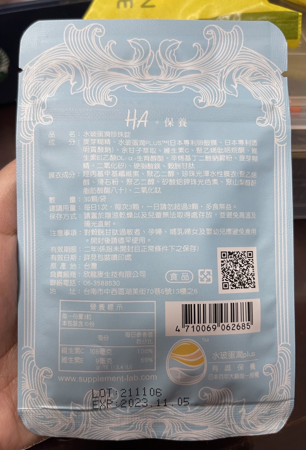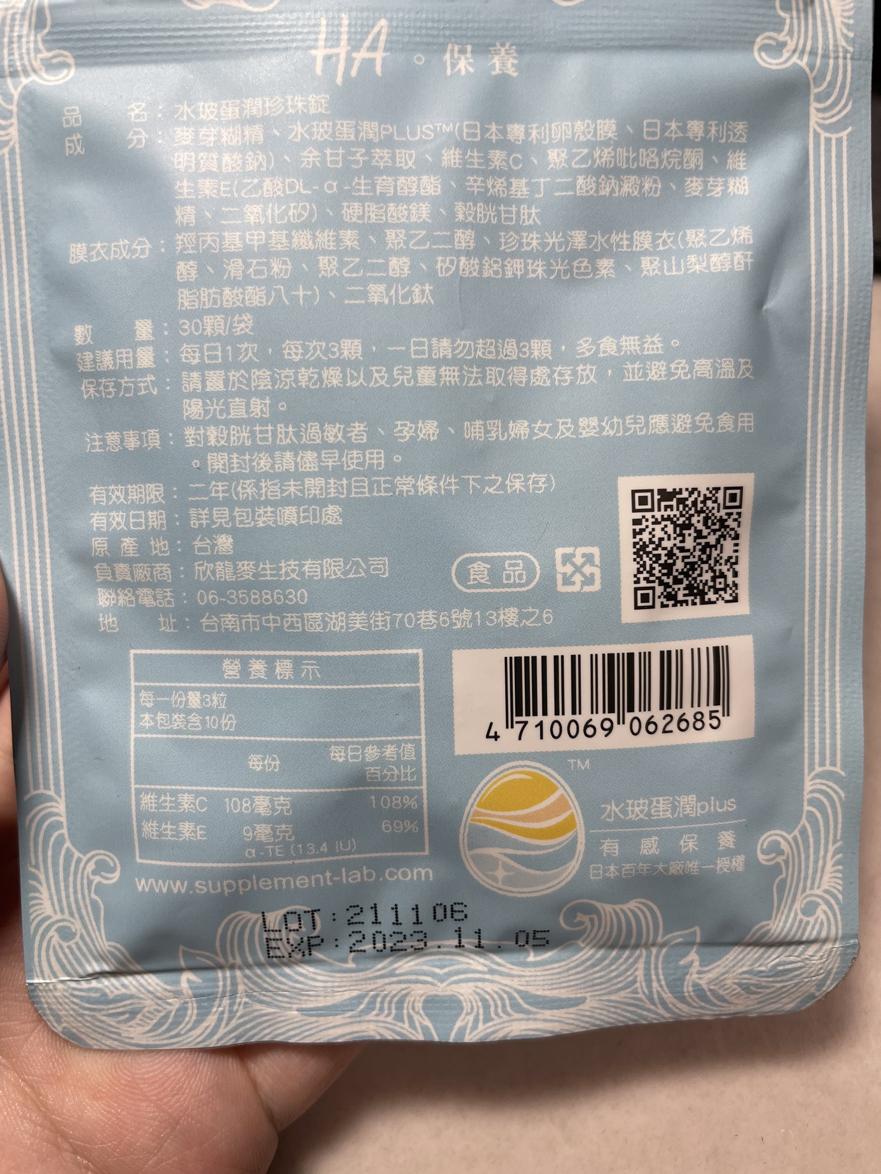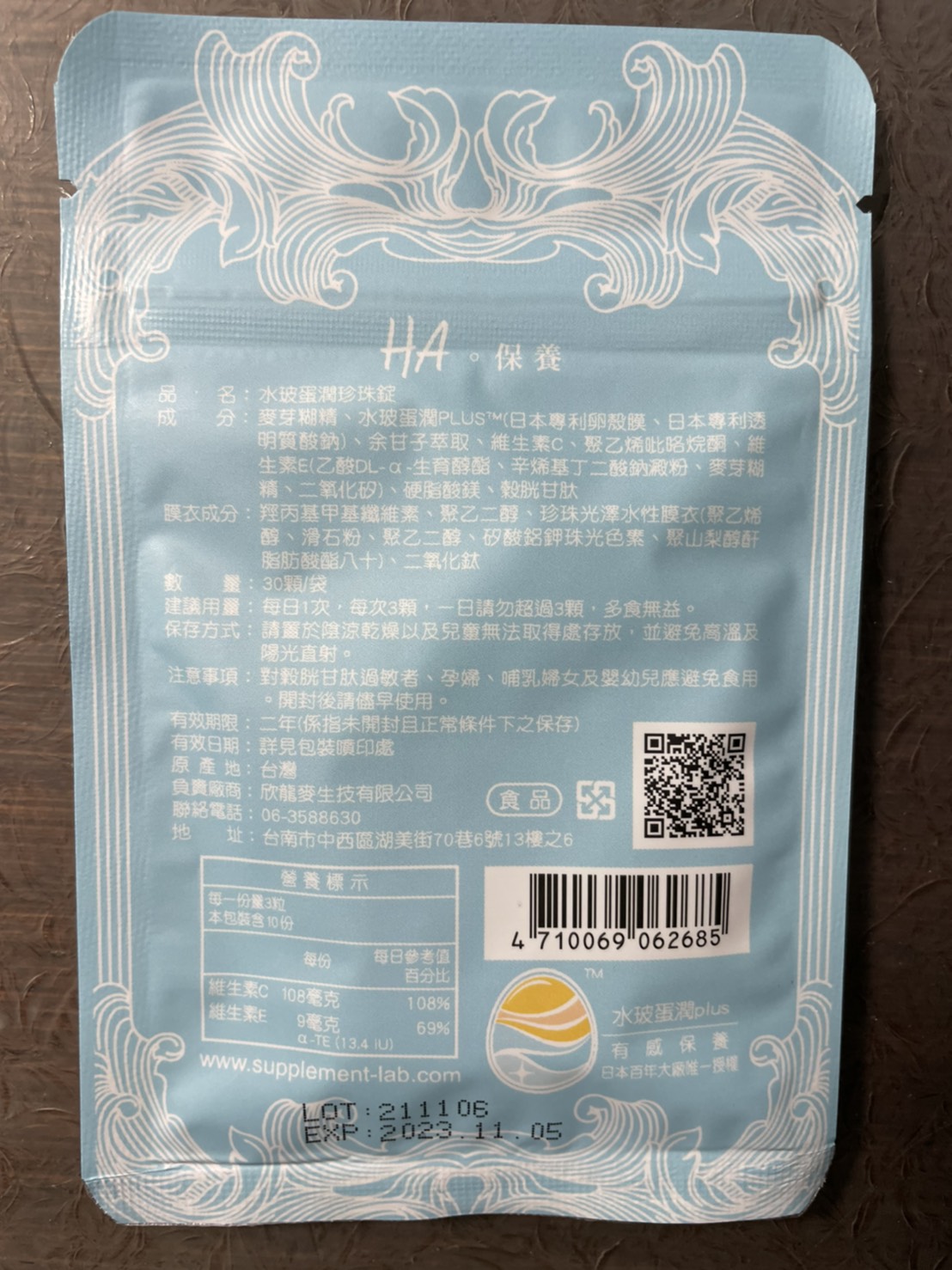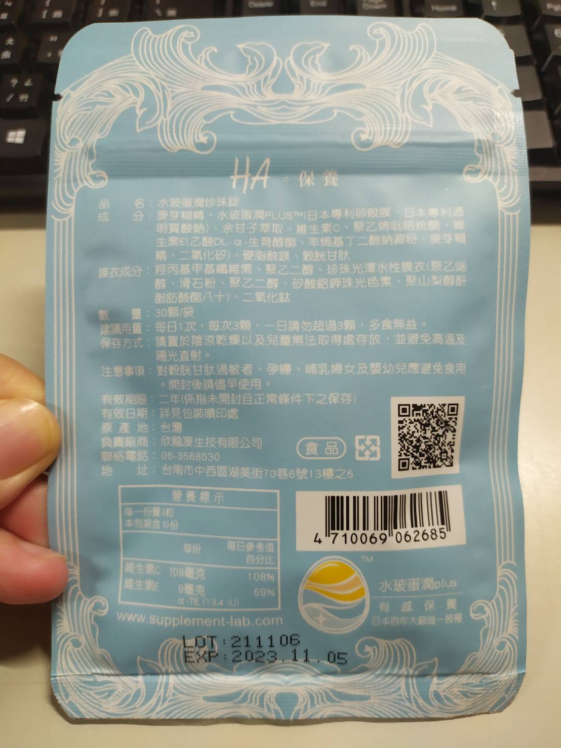 回列表 HA。保養 水玻蛋潤珍珠錠 告別暗沉、透亮再現 500元/袋 所需等級 一般會員以上 所需學分 30 體驗份數 100 關注人數 1676 申請人數 299 申請截止 立即購買 品牌業者:欣龍麥生技有限公司 負責廠商 欣龍麥生技有限公司 廠商地址 臺南市中西區湖美街70巷6號13樓之6 產地 臺灣 試用產品規格 30顆/袋,每日一次,一次三顆,十天份 食品業者登錄字號 D-191116493-00000-5 心得分享 商品介紹 商品成分 使用方法 注意事項 體驗名單 8.2 HA。保養 水玻蛋潤珍珠錠 想要養顏美容 8.3 輕鬆入口 8.8 品質信任 8.2 美學設計 8.5 建議推薦 8.0 心得分享 90則 李庭 金食達人 33歲 臺北市 2021/11/21 對HA。保養 水玻蛋潤珍珠錠留下評價 10 讓我先自首一下,對於各種貼心小語真的是無法抵抗,拆開包裝盒後除了柔和的配色非常吸睛,就是他附上的小卡【be a star for your life】直接入坑! 看看他的成分,【穀胱甘肽】、【維生素C】,因為之前短暫接觸過相關產業,知道多補充是可以達到美白效果,一白遮三醜,身為女生的我很是需要吶~如果聽起來很可疑,有一句老話說,睡飽睡好就會變漂亮,其實是增加代謝率,跟穀胱甘肽功效-幫助睡眠、抗氧化、提高代謝,這樣聽起來能讓人信服了吧!另外,他採用夾鏈袋封口,可以避免潮濕、掉出的風險,還可以重複使用,非常貼心耶,老實說,剛收到的時候一度卡關在夾鏈的部分,差點直接剪掉哩~保養品是需要長時間使用的,找到一個合你眼又安心的產品是很重要的:) 一起成為透亮自信、甩掉濾鏡的女孩吧! 黑貓 金食達人 37歲 臺北市 2021/11/20 對HA。保養 水玻蛋潤珍珠錠留下評價 9 包裝很美,是水藍色很清爽,放在包包裡拿出來吃也不會被當成吃保健食品,在辦公室吃也不尷尬。產品圓圓的還有珍珠光澤,超級喜歡,像是真的吃珍珠,需要配溫開水吞服,聞起來沒有味道,但不建議咬碎,會有一點藥味(笑),整體很喜歡。整包30顆,可以吃10天,不會有負擔,期待煥然一新的自己。 期果威 金食達人 29歲 臺北市 2021/11/20 對HA。保養 水玻蛋潤珍珠錠留下評價 9 會試用幾乎都是因為想要養顏美容吧!包裝外觀很精緻也偏日系,賞心悅目到不小心忘記先拍照就拆封~錠劑本身輕鬆好入口,最令人驚喜的部分是沒有任何特殊氣味!不過一天竟然要服用到三顆覺得有點太多,很像老人家服藥多種。且必須承認因為相關數據提供較少,還有一個美白有效成分寫在成分表最後面(這是表示含量很稀少吧嗎?),所以對於品質信任會持較為懷疑的態度,總體來說很特別,若有成效會再去購買的。 黃念怡 金食達人 32歲 桃園市 2021/11/21 對HA。保養 水玻蛋潤珍珠錠留下評價 10 以前總覺得內服的保健品臭又大顆難嚥下總將保養一昧著重在外敷為主但細想我們體內的器官又得靠什麼保健呢?很開心能被000邀約體驗 HA。保養 水玻蛋潤珍珠錠雖然只是10天的份量可能沒那麼快感受到保養的實質功效但我覺得顆粒大小適中、顏色不鮮豔、無味就已經取勝了👍👍👍是可以睡前直接三顆吞下服用的大小完全不用321深呼吸一顆顆的吞然後擔心會反嘔出來身為一名社工進進出出辦公室、案家、法院、法扶基金會、各種面訪地點即使擦了保養品也有可能因為外勤而無法徹底防護反而一層灰塵跟你說嗨這小巧包裝攜帶方便顏色讓人看了很想去海邊看看海景呢而我認真覺得水玻蛋,社工必須得要有一罐-社工不外勤的時候長時間就得待在冷氣房與記錄搏鬥-社工跑訪奔波還要忍受風吹日曬被個案放鳥的可能又或者案家整個大亂鬥心很累的時候-不論你是男社工女社工都要注意日常保養室內室外的溫度抨擊都有可能讓我們…容易過敏、泛紅甚至乾癢適度的日常保養換取新鮮好心情適度的調整放鬆換取新鮮肝最後的最後,貼心小提醒❗️孕婦、哺乳婦女還有嬰幼兒🈲️食用呦! 陳奕丞 鑽石達人 37歲 新北市 2021/11/22 對HA。保養 水玻蛋潤珍珠錠留下評價 8 首先感欣龍麥生技有限公司和食力提供本次試用的機會,因為工作常常要熬夜加班,三不五時我會有黑眼圈及皮膚粗糙的現象,所以我有特別留意這方面的保養,得知本次的試用體驗,我非常的期待,服用後,果然不失所望,效果還不錯,黑眼圈及皮膚黯淡的現象有一點點的改善,相信長期服用後,效果會更加明顯,使用吞嚥上也相當方便,一次只要吞嚥三顆,不像一些其他的品牌,一次要吞的顆粒數量眾多,這對吞嚥較為困難的朋友比較不友善。而且外觀包裝獨立設計,這點對於攜帶外出使用相當方便,不像某些品牌採整罐包裝設計,這對於外出使用較不方便。我十分推薦(HA。保養 水玻蛋潤珍珠錠)給大家,也感謝食力&欣龍麥生技有限公司提供這次的試用機會,再次謝謝 林強 金食達人 46歲 高雄市 2021/11/22 對HA。保養 水玻蛋潤珍珠錠留下評價 9 包裝設計讓人覺得很有趣包裝袋上線條布局有種覺得相當活潑的感覺符合這產品專利、創新、高科技的形象與設計基調但是藍白的色調搭配上略顯的單調尤其當包裝後說明字體過小、文字較多整體看來比較容易「一片白」倘色調豐富點,較能帶有「青春」、「活力」感覺更能符合產品「保養」的調性至於產品內容則容易吞嚥顆粒看起來也很光潤誘人值得推薦 林敬智 金食達人 31歲 臺中市 2021/11/22 對HA。保養 水玻蛋潤珍珠錠留下評價 9 這個水玻蛋珍珠錠對我來說是一個很好吞的吃的保養品,具有日本專利技術,加上是台灣廠商,所以很放心食