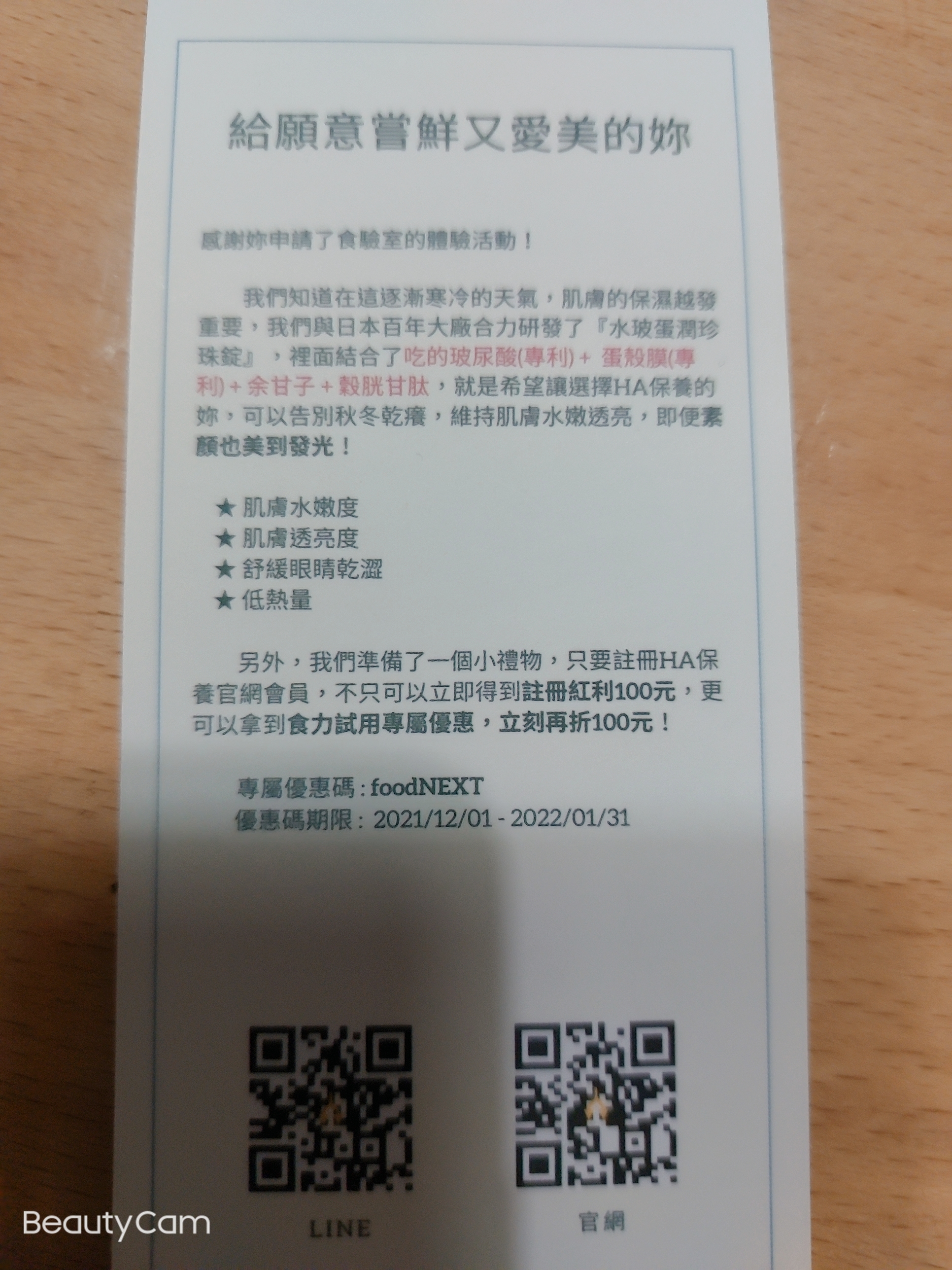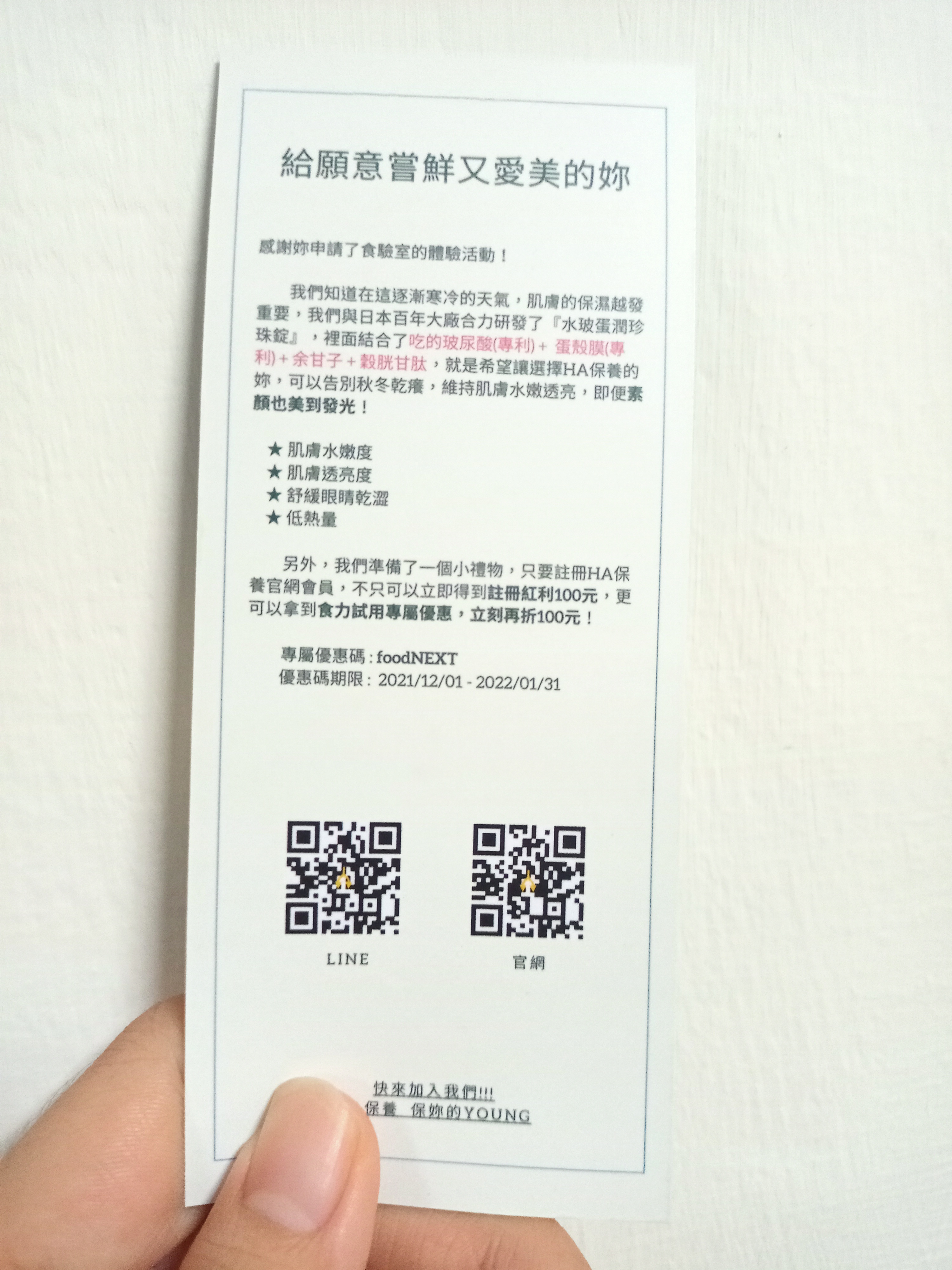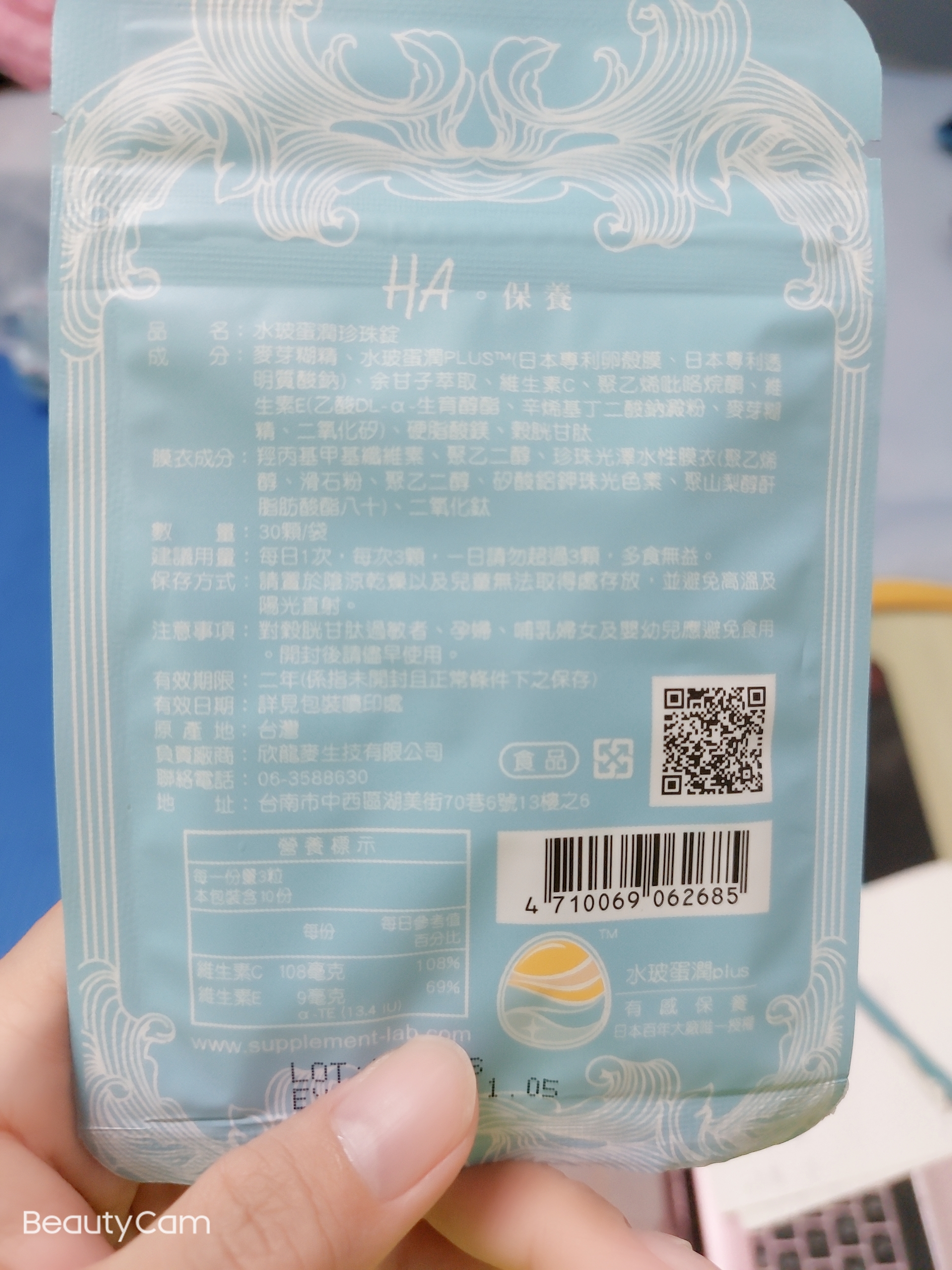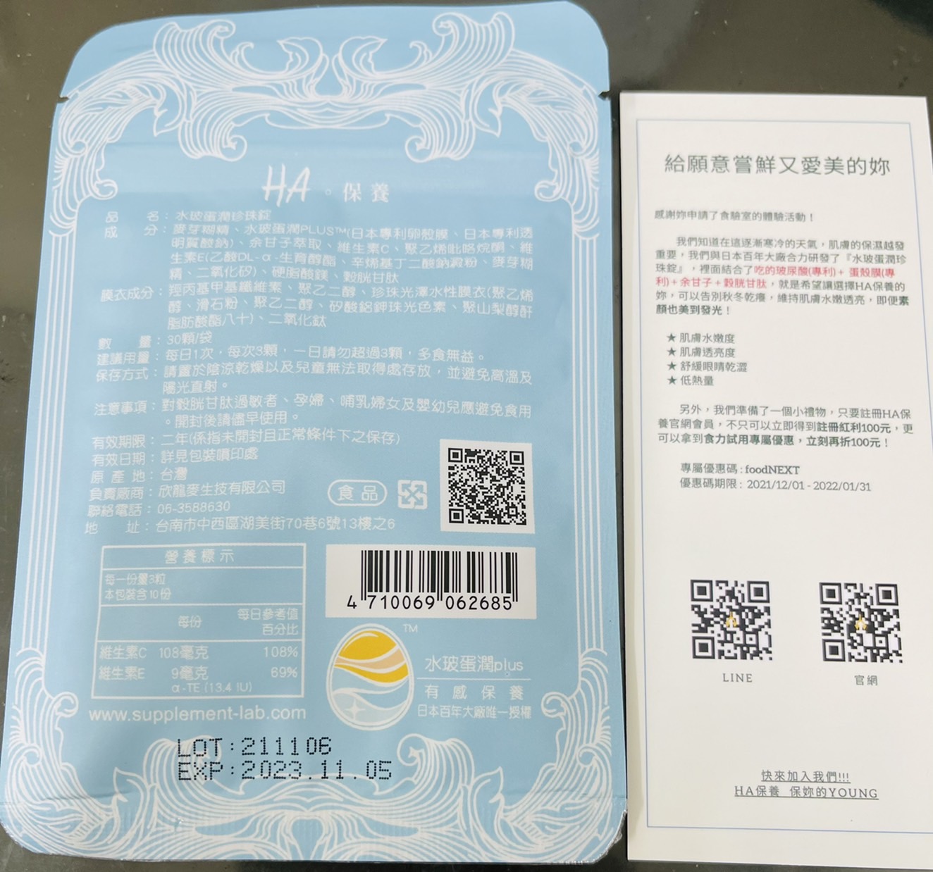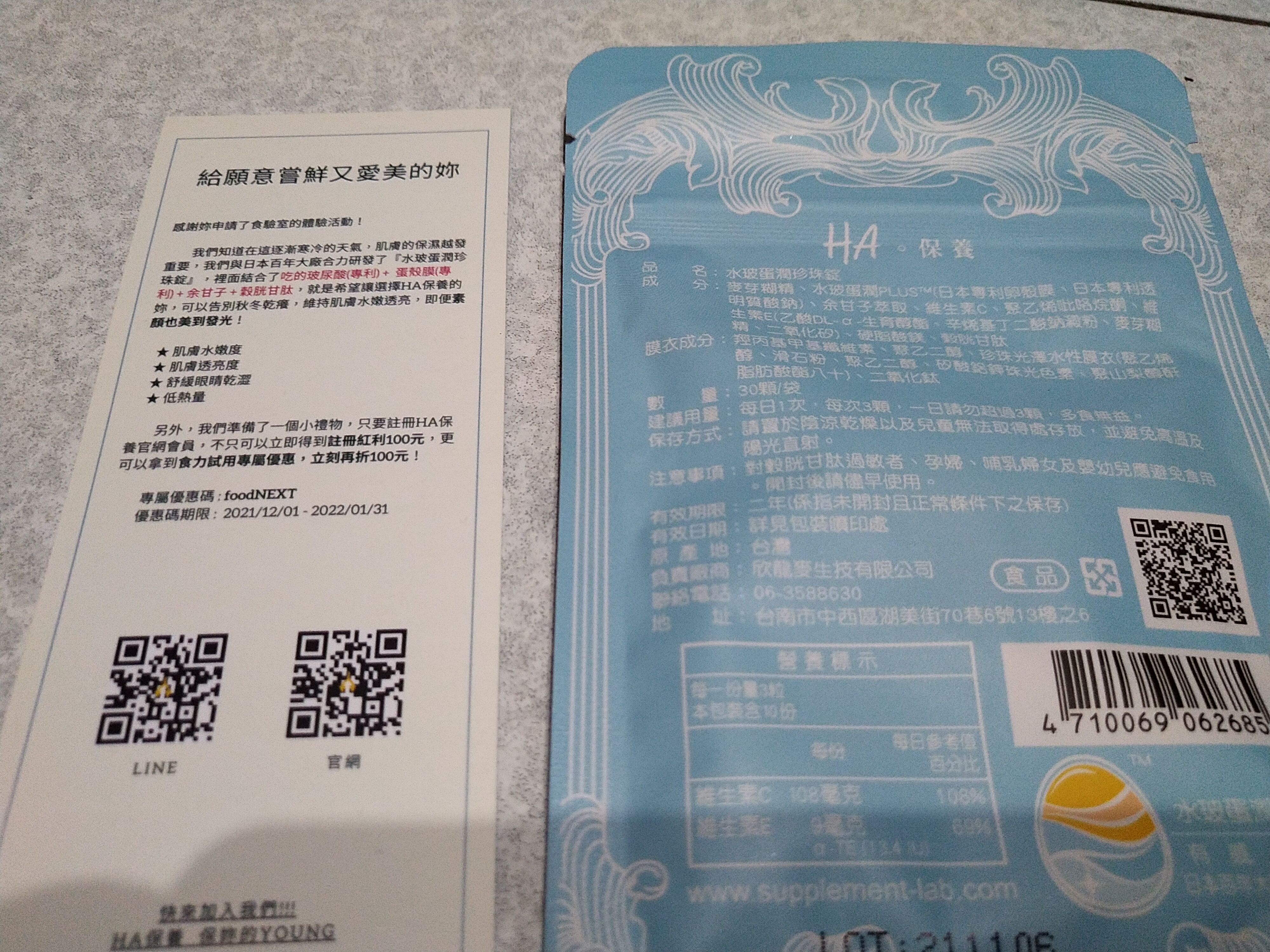 回列表 HA。保養 水玻蛋潤珍珠錠 告別暗沉、透亮再現 500元/袋 所需等級 一般會員以上 所需學分 30 體驗份數 100 關注人數 1676 申請人數 299 申請截止 立即購買 品牌業者:欣龍麥生技有限公司 負責廠商 欣龍麥生技有限公司 廠商地址 臺南市中西區湖美街70巷6號13樓之6 產地 臺灣 試用產品規格 30顆/袋,每日一次,一次三顆,十天份 食品業者登錄字號 D-191116493-00000-5 心得分享 商品介紹 商品成分 使用方法 注意事項 體驗名單 8.2 HA。保養 水玻蛋潤珍珠錠 想要養顏美容 8.3 輕鬆入口 8.8 品質信任 8.2 美學設計 8.5 建議推薦 8.0 心得分享 90則 李庭 金食達人 33歲 臺北市 2021/11/21 對HA。保養 水玻蛋潤珍珠錠留下評價 10 讓我先自首一下,對於各種貼心小語真的是無法抵抗,拆開包裝盒後除了柔和的配色非常吸睛,就是他附上的小卡【be a star for your life】直接入坑! 看看他的成分,【穀胱甘肽】、【維生素C】,因為之前短暫接觸過相關產業,知道多補充是可以達到美白效果,一白遮三醜,身為女生的我很是需要吶~如果聽起來很可疑,有一句老話說,睡飽睡好就會變漂亮,其實是增加代謝率,跟穀胱甘肽功效-幫助睡眠、抗氧化、提高代謝,這樣聽起來能讓人信服了吧!另外,他採用夾鏈袋封口,可以避免潮濕、掉出的風險,還可以重複使用,非常貼心耶,老實說,剛收到的時候一度卡關在夾鏈的部分,差點直接剪掉哩~保養品是需要長時間使用的,找到一個合你眼又安心的產品是很重要的:) 一起成為透亮自信、甩掉濾鏡的女孩吧! 黑貓 金食達人 37歲 臺北市 2021/11/20 對HA。保養 水玻蛋潤珍珠錠留下評價 9 包裝很美,是水藍色很清爽,放在包包裡拿出來吃也不會被當成吃保健食品,在辦公室吃也不尷尬。產品圓圓的還有珍珠光澤,超級喜歡,像是真的吃珍珠,需要配溫開水吞服,聞起來沒有味道,但不建議咬碎,會有一點藥味(笑),整體很喜歡。整包30顆,可以吃10天,不會有負擔,期待煥然一新的自己。 期果威 金食達人 29歲 臺北市 2021/11/20 對HA。保養 水玻蛋潤珍珠錠留下評價 9 會試用幾乎都是因為想要養顏美容吧!包裝外觀很精緻也偏日系,賞心悅目到不小心忘記先拍照就拆封~錠劑本身輕鬆好入口,最令人驚喜的部分是沒有任何特殊氣味!不過一天竟然要服用到三顆覺得有點太多,很像老人家服藥多種。且必須承認因為相關數據提供較少,還有一個美白有效成分寫在成分表最後面(這是表示含量很稀少吧嗎?),所以對於品質信任會持較為懷疑的態度,總體來說很特別,若有成效會再去購買的。 黃念怡 金食達人 32歲 桃園市 2021/11/21 對HA。保養 水玻蛋潤珍珠錠留下評價 10 以前總覺得內服的保健品臭又大顆難嚥下總將保養一昧著重在外敷為主但細想我們體內的器官又得靠什麼保健呢?很開心能被000邀約體驗 HA。保養 水玻蛋潤珍珠錠雖然只是10天的份量可能沒那麼快感受到保養的實質功效但我覺得顆粒大小適中、顏色不鮮豔、無味就已經取勝了👍👍👍是可以睡前直接三顆吞下服用的大小完全不用321深呼吸一顆顆的吞然後擔心會反嘔出來身為一名社工進進出出辦公室、案家、法院、法扶基金會、各種面訪地點即使擦了保養品也有可能因為外勤而無法徹底防護反而一層灰塵跟你說嗨這小巧包裝攜帶方便顏色讓人看了很想去海邊看看海景呢而我認真覺得水玻蛋,社工必須得要有一罐-社工不外勤的時候長時間就得待在冷氣房與記錄搏鬥-社工跑訪奔波還要忍受風吹日曬被個案放鳥的可能又或者案家整個大亂鬥心很累的時候-不論你是男社工女社工都要注意日常保養室內室外的溫度抨擊都有可能讓我們…容易過敏、泛紅甚至乾癢適度的日常保養換取新鮮好心情適度的調整放鬆換取新鮮肝最後的最後,貼心小提醒❗️孕婦、哺乳婦女還有嬰幼兒🈲️食用呦! 陳奕丞 鑽石達人 37歲 新北市 2021/11/22 對HA。保養 水玻蛋潤珍珠錠留下評價 8 首先感欣龍麥生技有限公司和食力提供本次試用的機會,因為工作常常要熬夜加班,三不五時我會有黑眼圈及皮膚粗糙的現象,所以我有特別留意這方面的保養,得知本次的試用體驗,我非常的期待,服用後,果然不失所望,效果還不錯,黑眼圈及皮膚黯淡的現象有一點點的改善,相信長期服用後,效果會更加明顯,使用吞嚥上也相當方便,一次只要吞嚥三顆,不像一些其他的品牌,一次要吞的顆粒數量眾多,這對吞嚥較為困難的朋友比較不友善。而且外觀包裝獨立設計,這點對於攜帶外出使用相當方便,不像某些品牌採整罐包裝設計,這對於外出使用較不方便。我十分推薦(HA。保養 水玻蛋潤珍珠錠)給大家,也感謝食力&欣龍麥生技有限公司提供這次的試用機會,再次謝謝 林強 金食達人 46歲 高雄市 2021/11/22 對HA。保養 水玻蛋潤珍珠錠留下評價 9 包裝設計讓人覺得很有趣包裝袋上線條布局有種覺得相當活潑的感覺符合這產品專利、創新、高科技的形象與設計基調但是藍白的色調搭配上略顯的單調尤其當包裝後說明字體過小、文字較多整體看來比較容易「一片白」倘色調豐富點,較能帶有「青春」、「活力」感覺更能符合產品「保養」的調性至於產品內容則容易吞嚥顆粒看起來也很光潤誘人值得推薦 林敬智 金食達人 31歲 臺中市 2021/11/22 對HA。保養 水玻蛋潤珍珠錠留下評價 9 這個水玻蛋珍珠錠對我來說是一個很好吞的吃的保養品,具有日本專利技術,加上是台灣廠商,所以很放心食