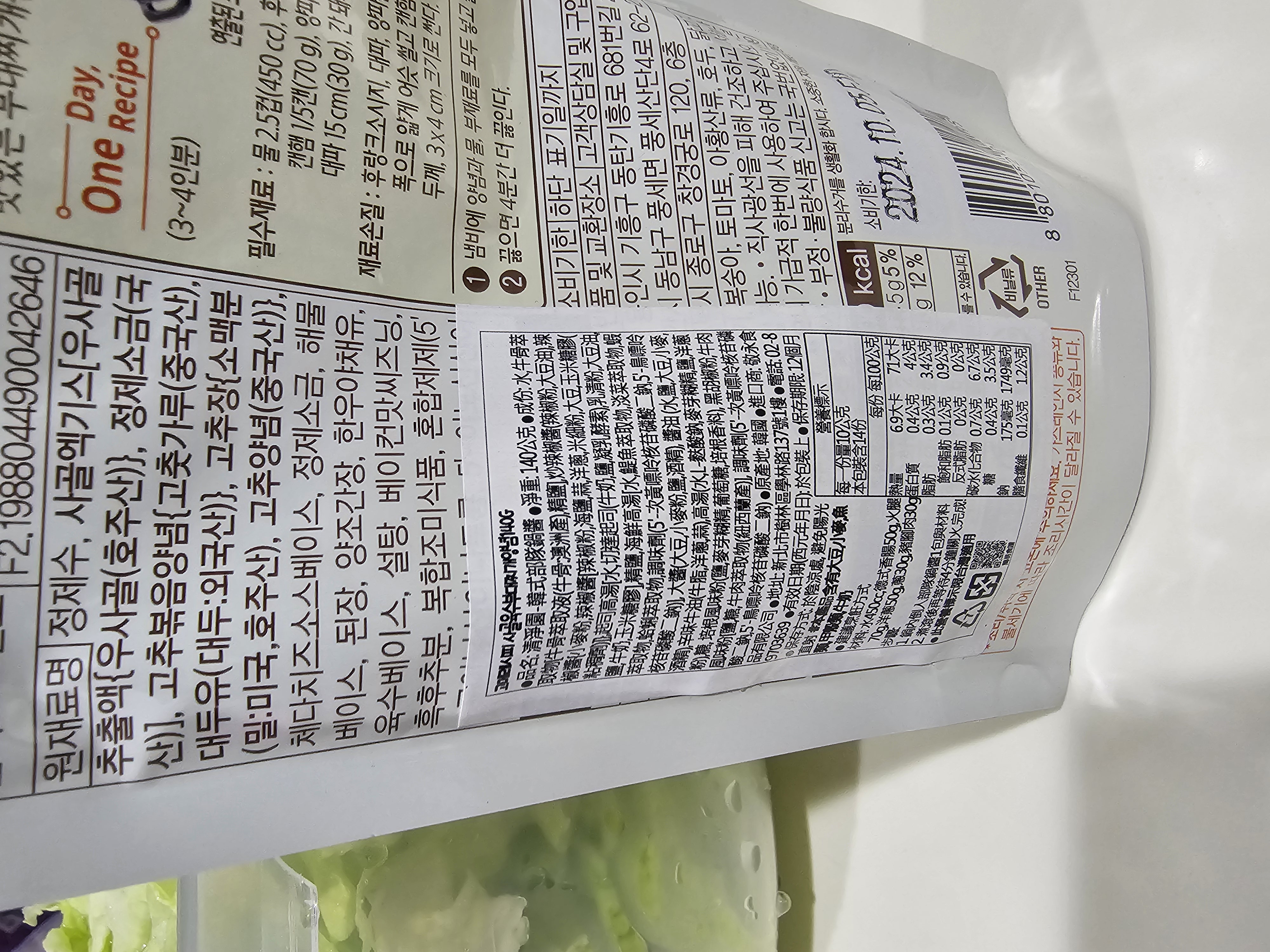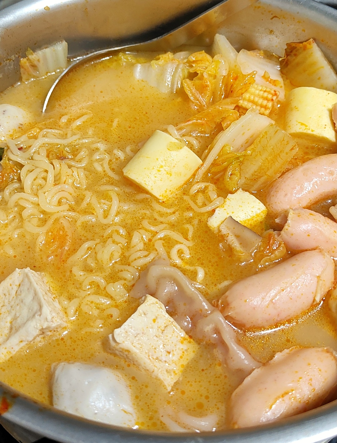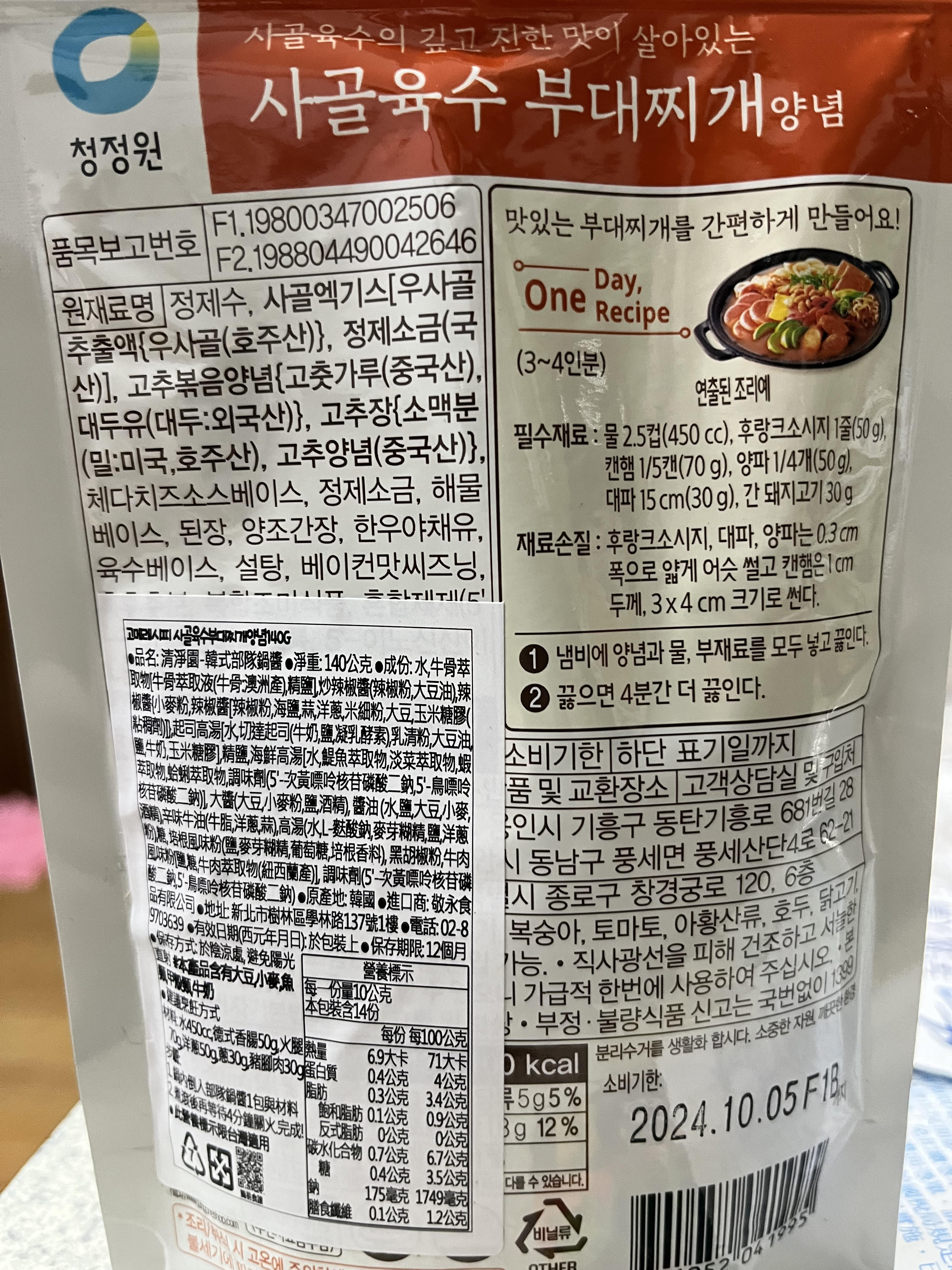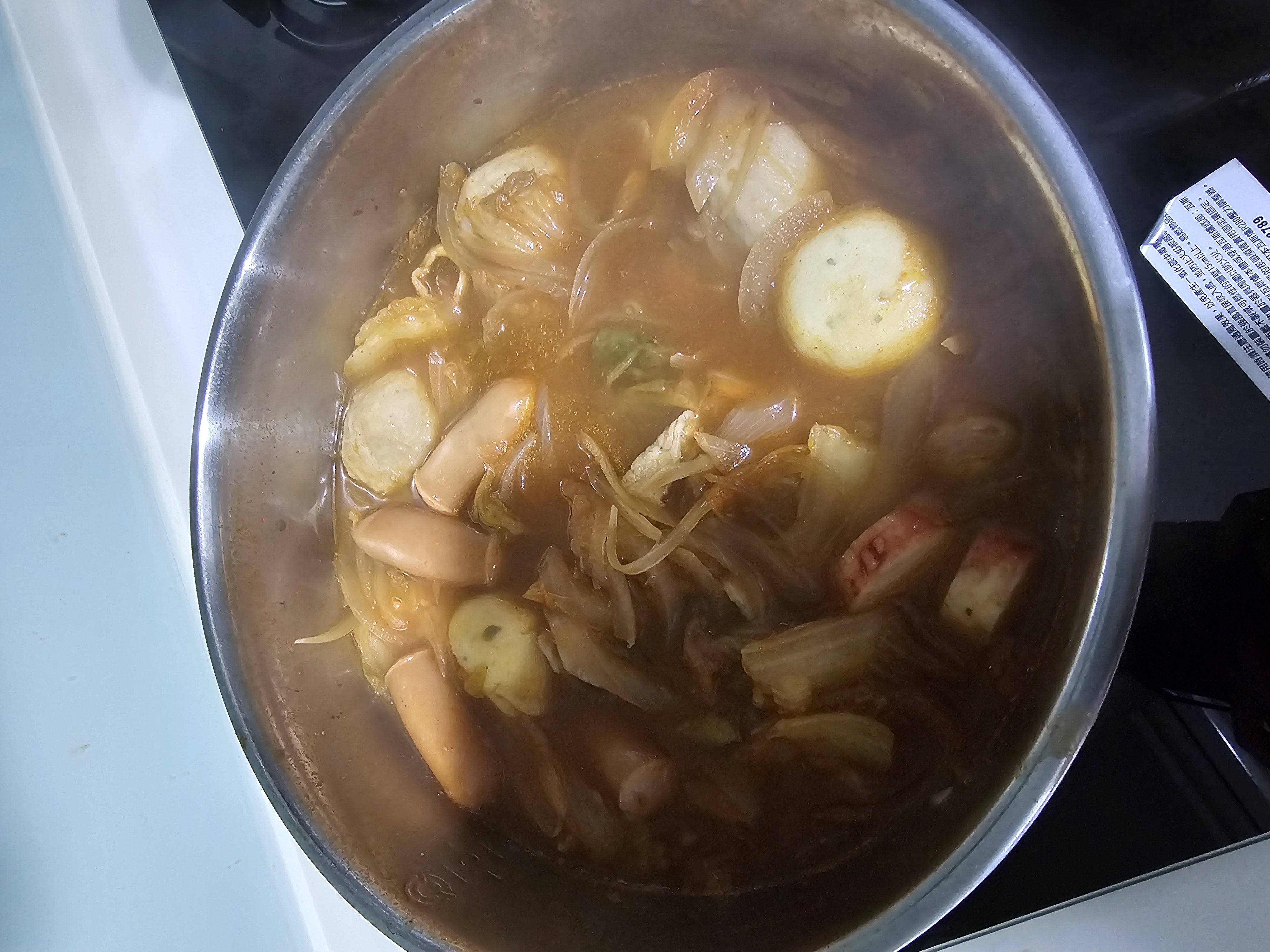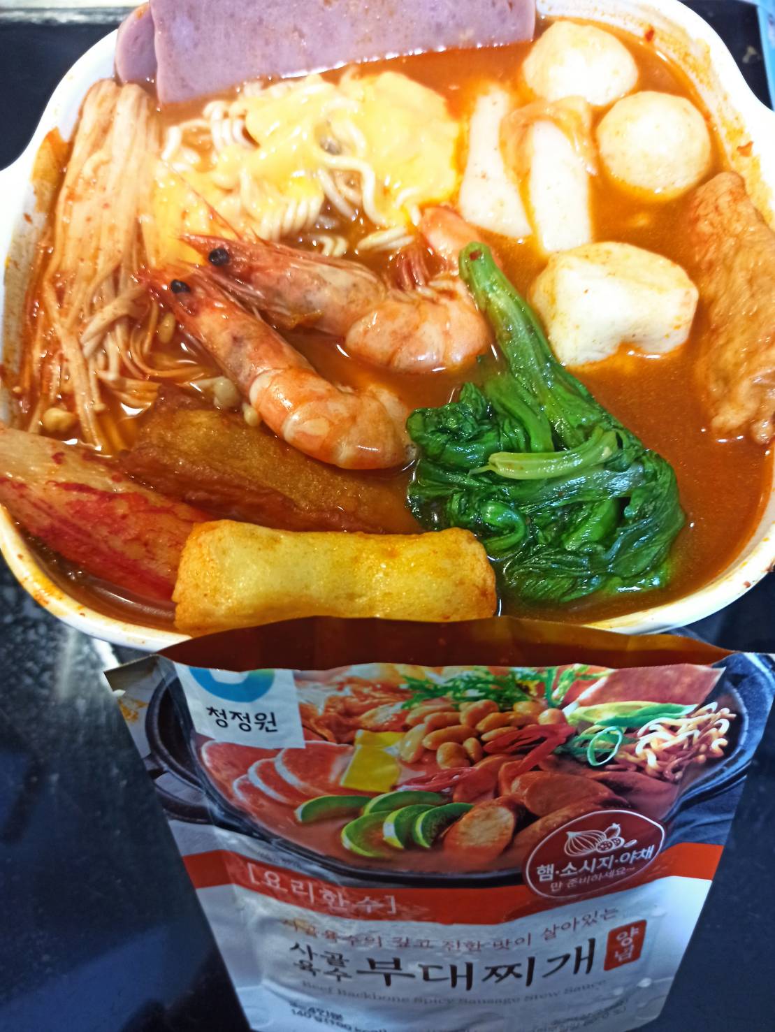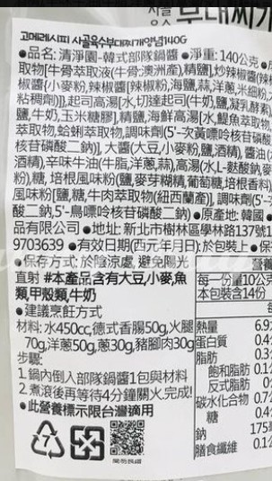 水、牛骨萃取物(牛骨萃取液(牛骨-澳洲產)、精鹽)、炒辣椒醬(辣椒粉、大豆油)、辣椒醬{小麥粉、辣椒醬(辣椒粉、海鹽、蒜、洋蔥、米細粉、大豆、玉米糖膠(粘稠劑))、起司高湯(水、切達起司(牛奶、鹽、凝乳酵素)、乳清粉、大豆油、鹽、牛奶、玉米糖膠)、精鹽、海鮮高湯(水、鯷魚萃取物、淡菜萃取物、蝦萃取物、蛤蜊萃取物、調味(5’-次黃嘌呤核苷磷酸二鈉、5’-鳥嘌呤核苷磷酸二鈉))、大醬(大豆、小麥粉、鹽、酒精)、醬油(水、鹽、大豆、小麥、酒精)、辛味牛油(牛油、洋蔥、蒜)、高湯(水、L-麩酸鈉、麥芽糊精、鹽、洋蔥粉)、糖、培根風味粉(鹽、麥芽糊精、葡萄糖、培根香料)、黑胡椒粉、牛肉風味粉(鹽、糖、牛肉萃取物(紐西蘭產))、調味劑(5’-次黃嘌呤核苷磷酸二鈉、5’-鳥嘌呤核苷磷酸二鈉)